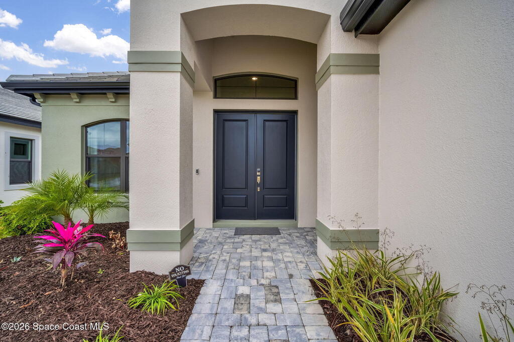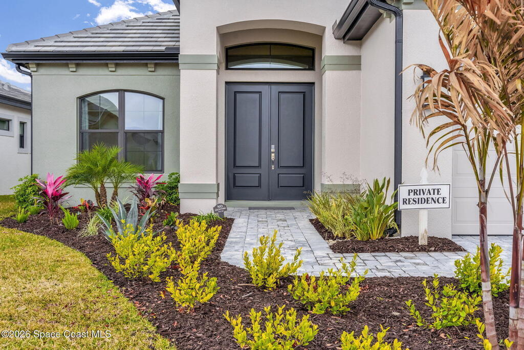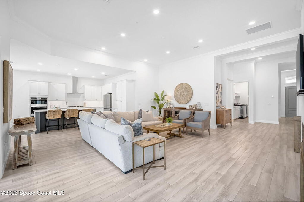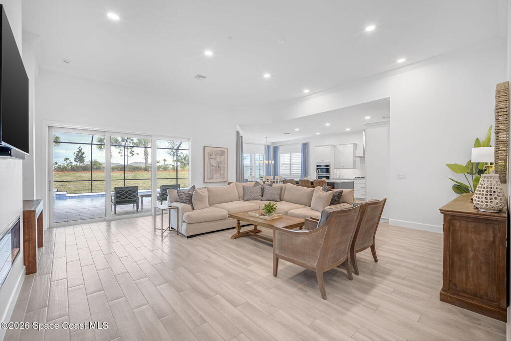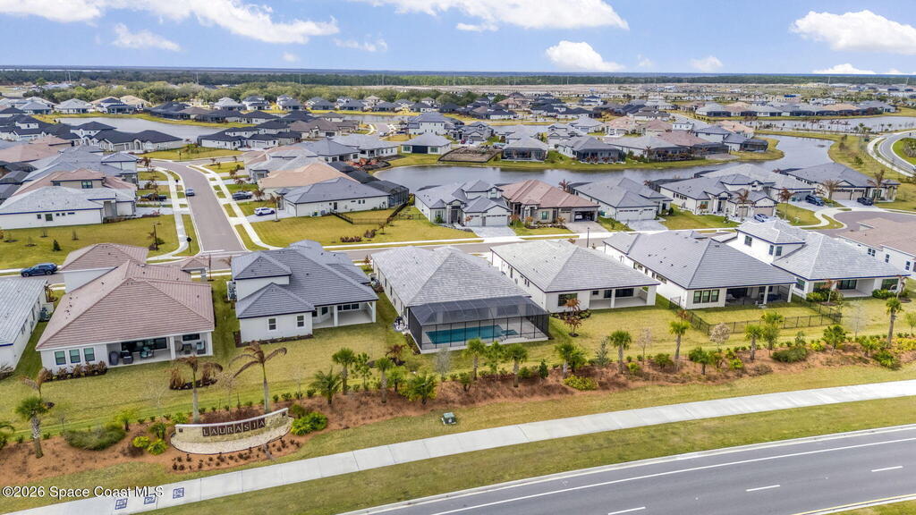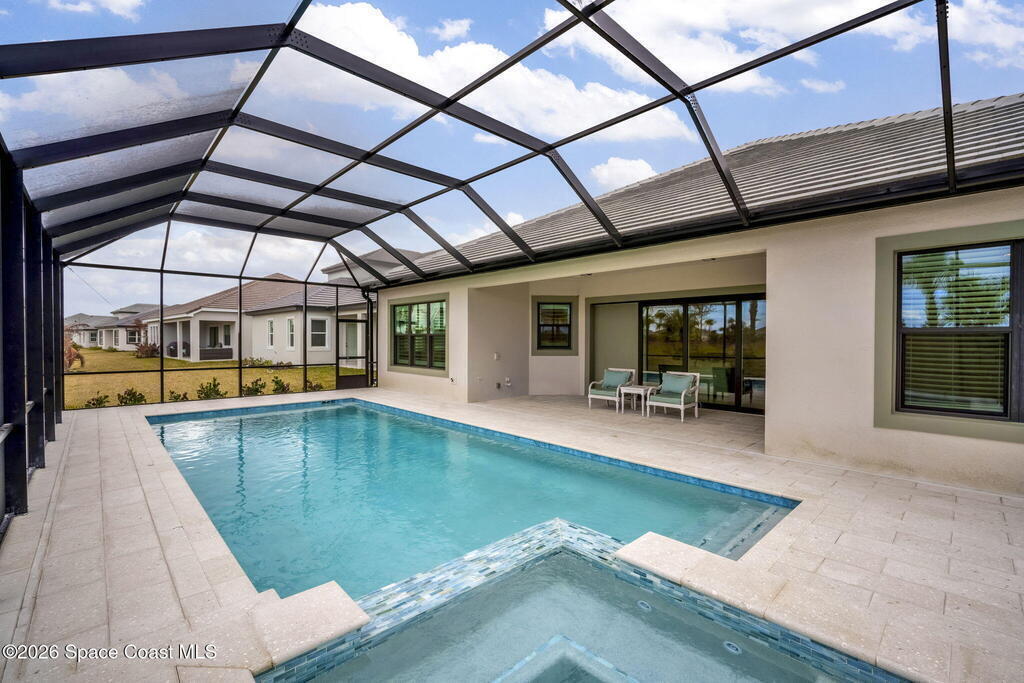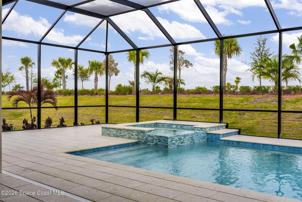 Skip the build time and step straight into luxury. Located in the gated community of Laurasia in Viera, this 2024 Mendocino offers the strongest value for a new pool home in Viera West, with designer upgrades complete and move-in ready. The backyard is a private retreat featuring a heated saltwater pool and spa with an elevated waterfall, full screen enclosure, and Shellock Artistic pavers throughout, designed for seamless indoor-outdoor living.Inside, the popular floor plan offers three bedrooms plus an OFFICE or flex space. Upgraded plank tile flows through the main living areas, leading to a gourmet kitchen with a 36-inch gas cooktop, wall oven and microwave combo, quartz countertops, and under-cabinet lighting. Eight-foot doors, crown molding, an electric fireplace, frameless glass showers, impact windows, recessed lighting, added gutters, and fresh landscaping complete this exceptional home near top-rated schools, shopping, dining, and golf cart-friendly amenities.