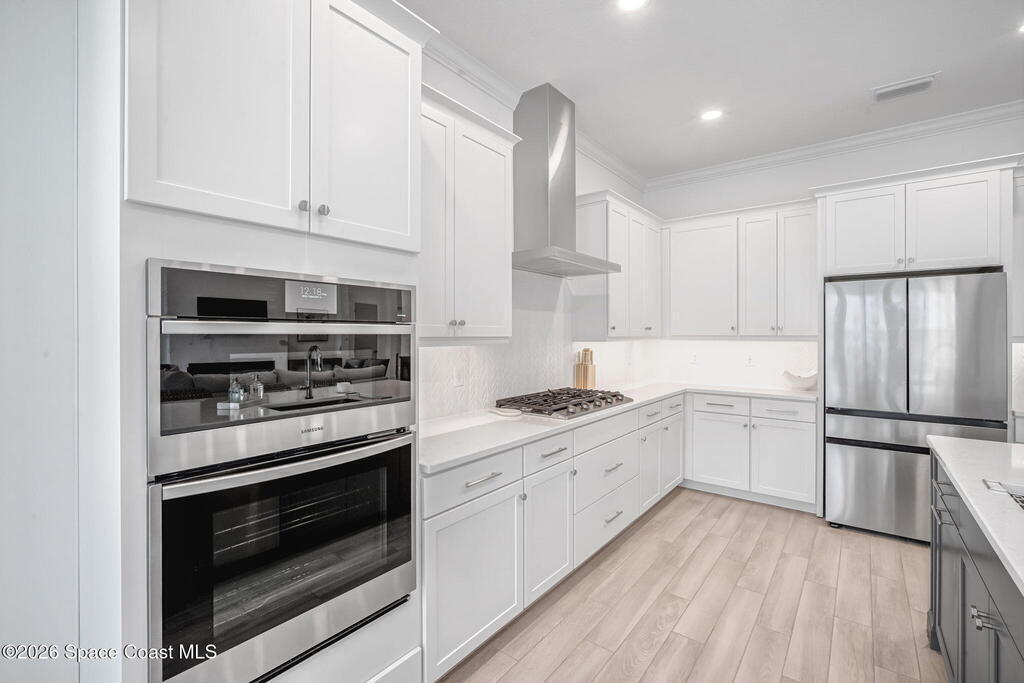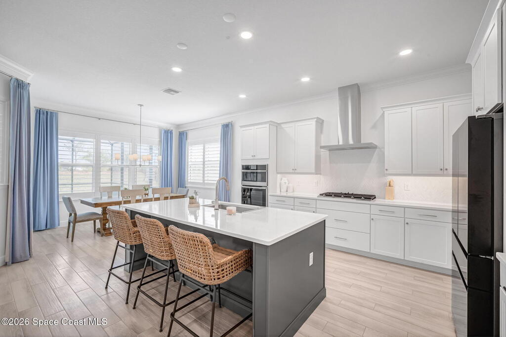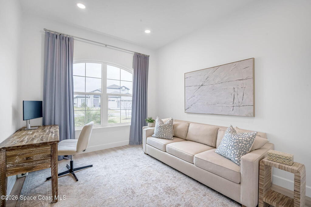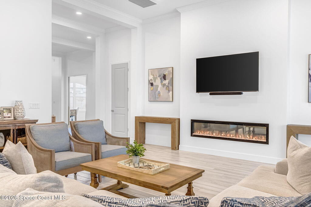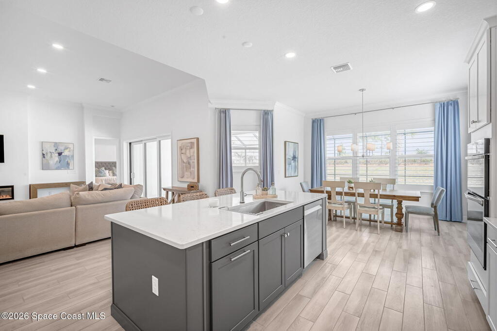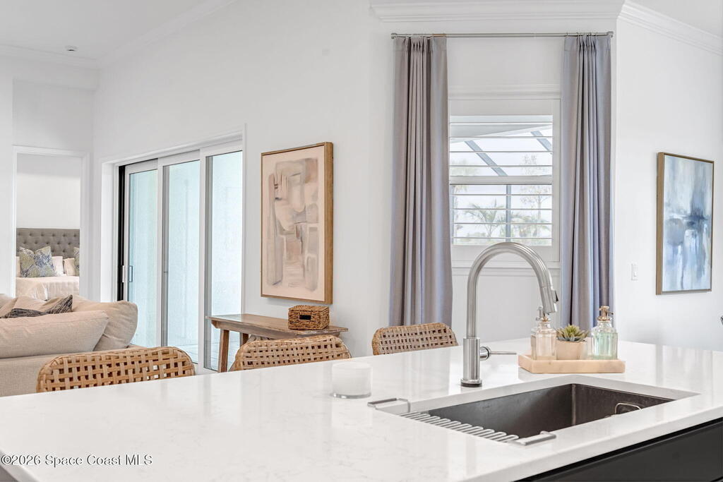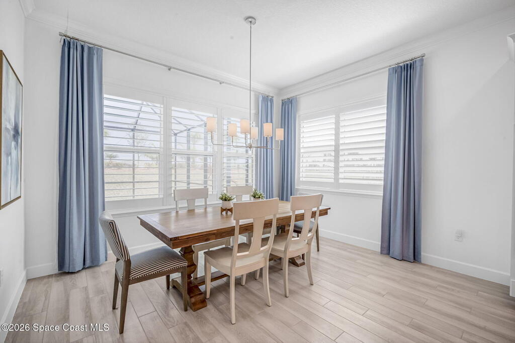 Skip the build time and step straight into luxury. Located in the gated community of Laurasia in Viera, this 2024 Mendocino offers the strongest value for a new pool home in Viera West, with designer upgrades complete and move-in ready. The backyard is a private retreat featuring a heated saltwater pool and spa with an elevated waterfall, full screen enclosure, and Shellock Artistic pavers throughout, designed for seamless indoor-outdoor living.Inside, the popular floor plan offers three bedrooms plus an OFFICE or flex space. Upgraded plank tile flows through the main living areas, leading to a gourmet kitchen with a 36-inch gas cooktop, wall oven and microwave combo, quartz countertops, and under-cabinet lighting. Eight-foot doors, crown molding, an electric fireplace, frameless glass showers, impact windows, recessed lighting, added gutters, and fresh landscaping complete this exceptional home near top-rated schools, shopping, dining, and golf cart-friendly amenities.