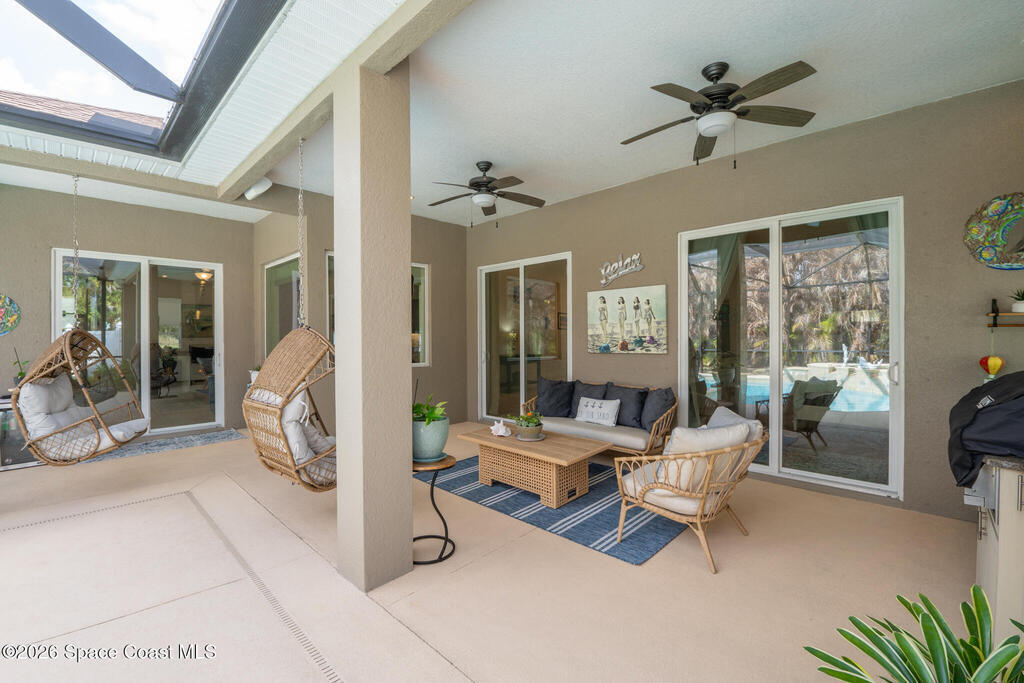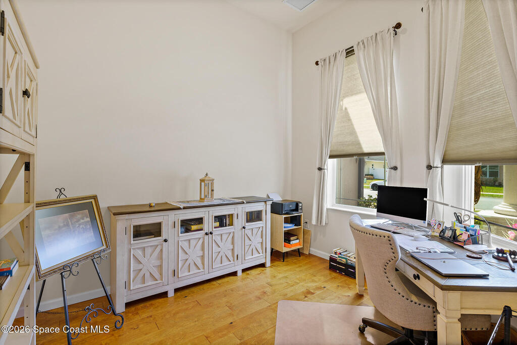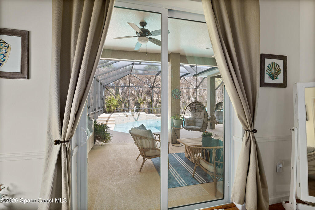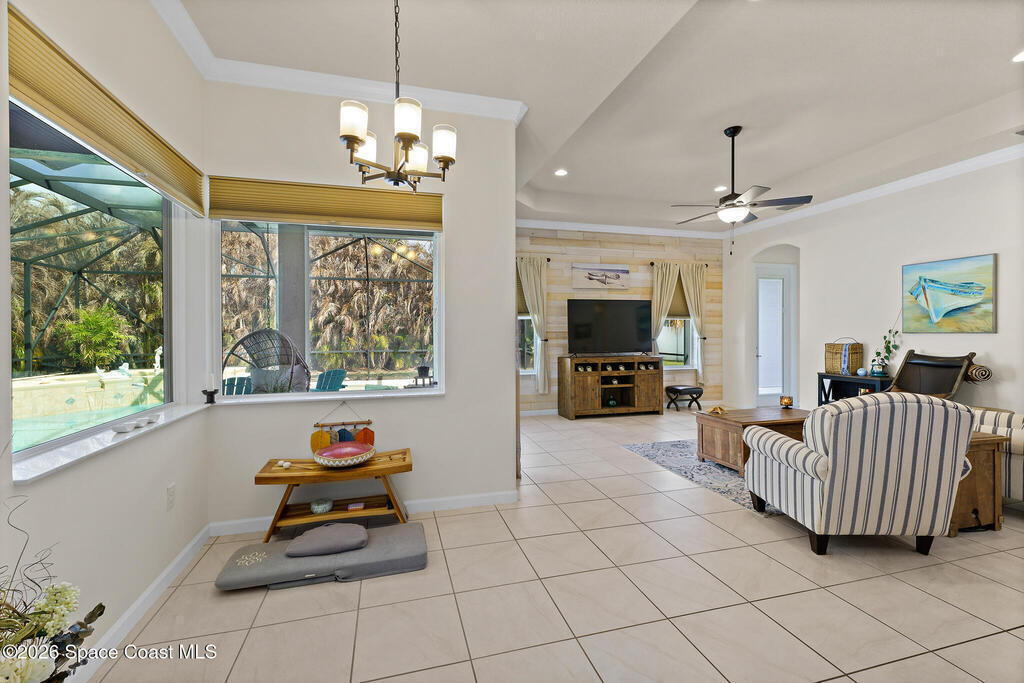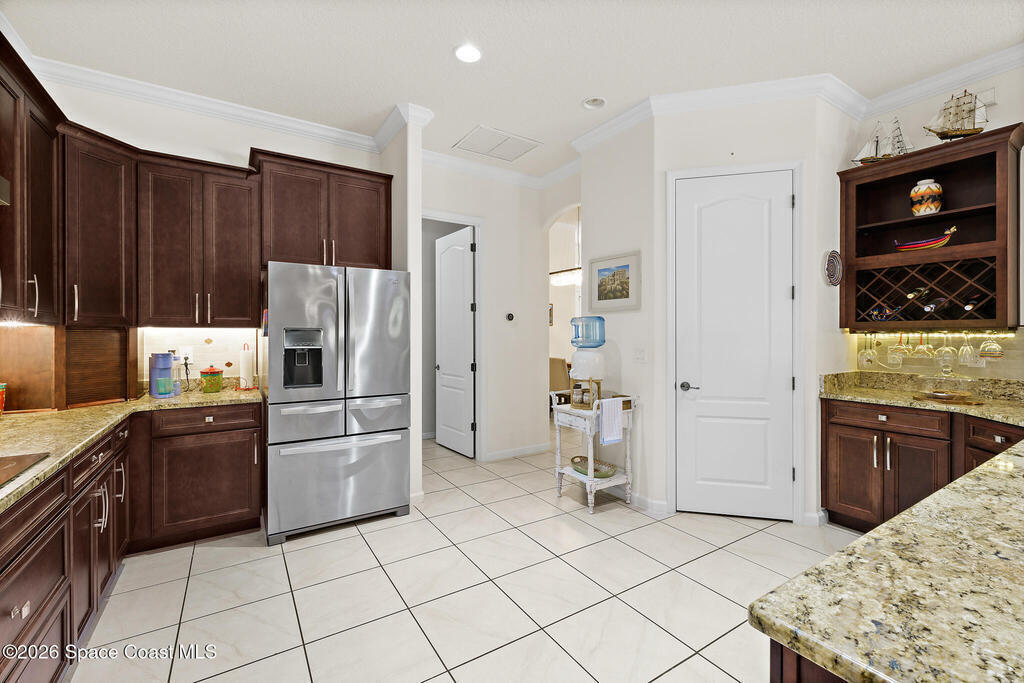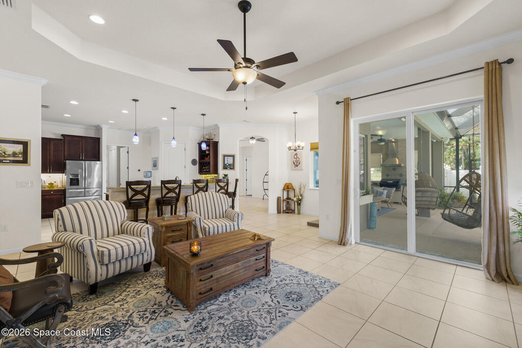 Welcome to Tuscany Estates, one of Palm Bay's most desirable gated communities. This beautifully appointed 4-bedroom plus office, 3-bath, single-story home offers over 2,600 sq ft of thoughtfully designed living space on an oversized lot at the end of a quiet street. Inside, the open floor plan features soaring ceilings, tray accents, crown molding, shiplap details, and rich wood flooring, creating a refined yet welcoming atmosphere. The kitchen flows seamlessly into the main living areas, ideal for entertaining and everyday living, while the split-bedroom layout provides excellent privacy, including a separate guest suite. Step outside to a private resort-style backyard featuring a saltwater, gas-heated pool and spa with waterfall features, LED lighting, and a fully equipped outdoor summer kitchen, all within a screened lanai. Additional highlights include a 3-car garage, fully fenced yard, storm shutters, water softener, new gutters, and updated exterior paint. Ideally located just