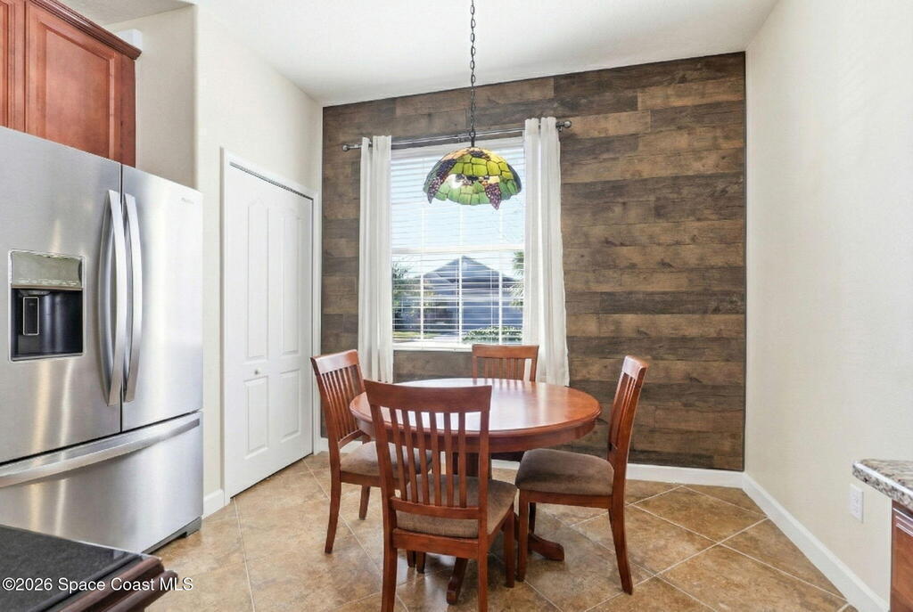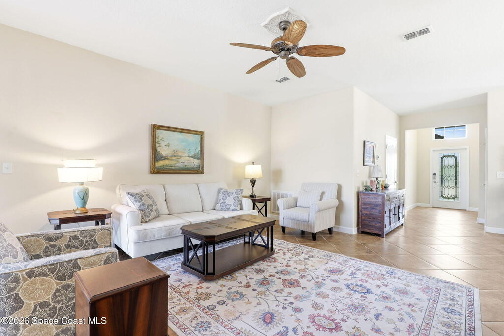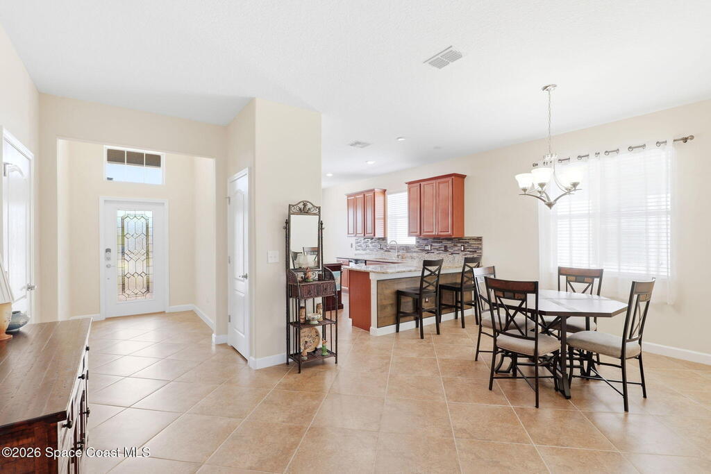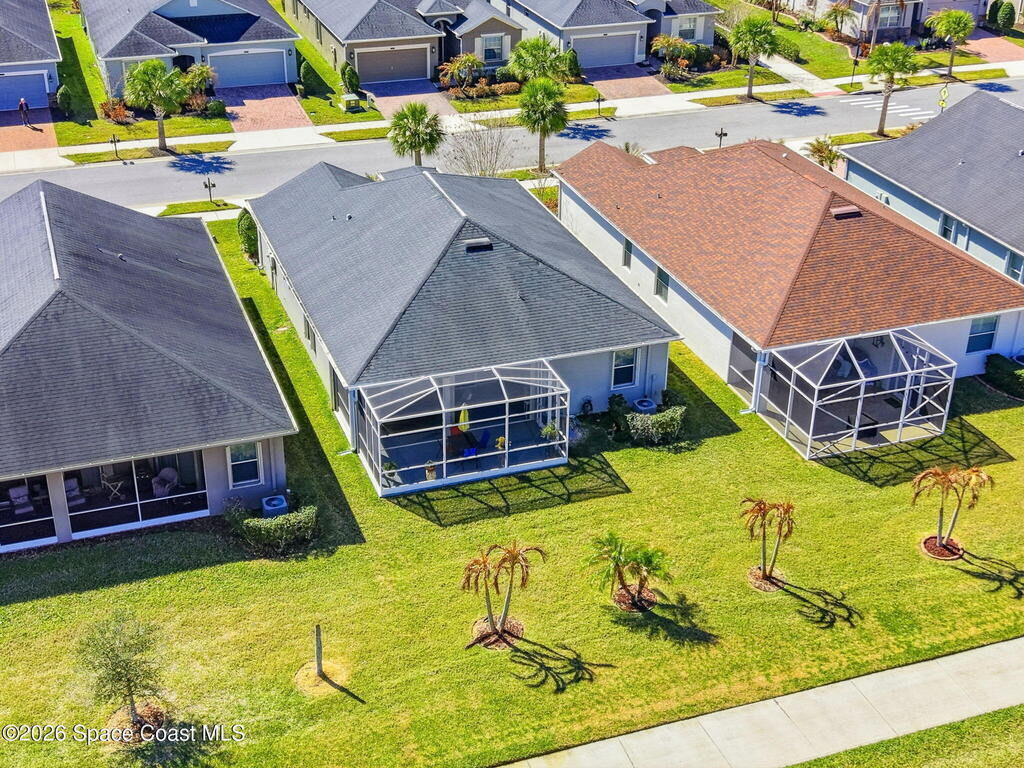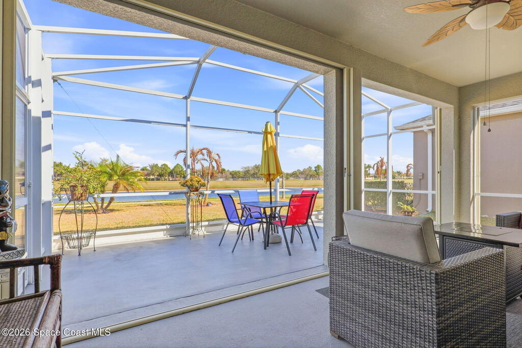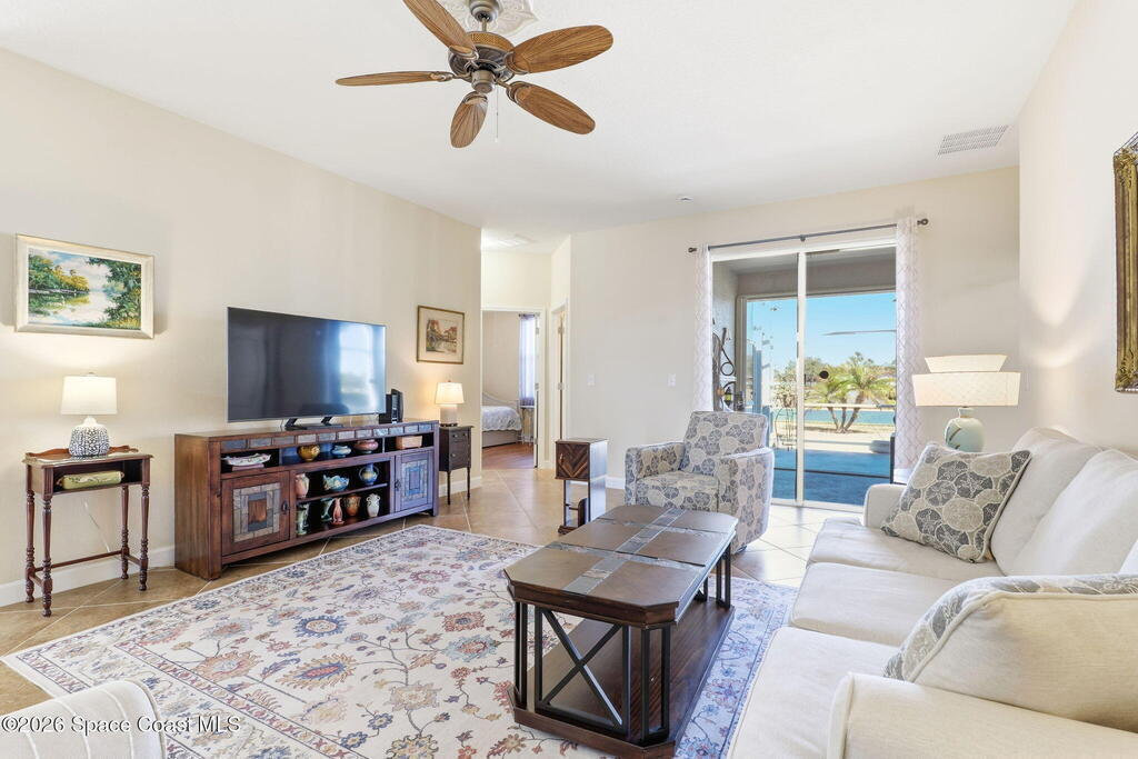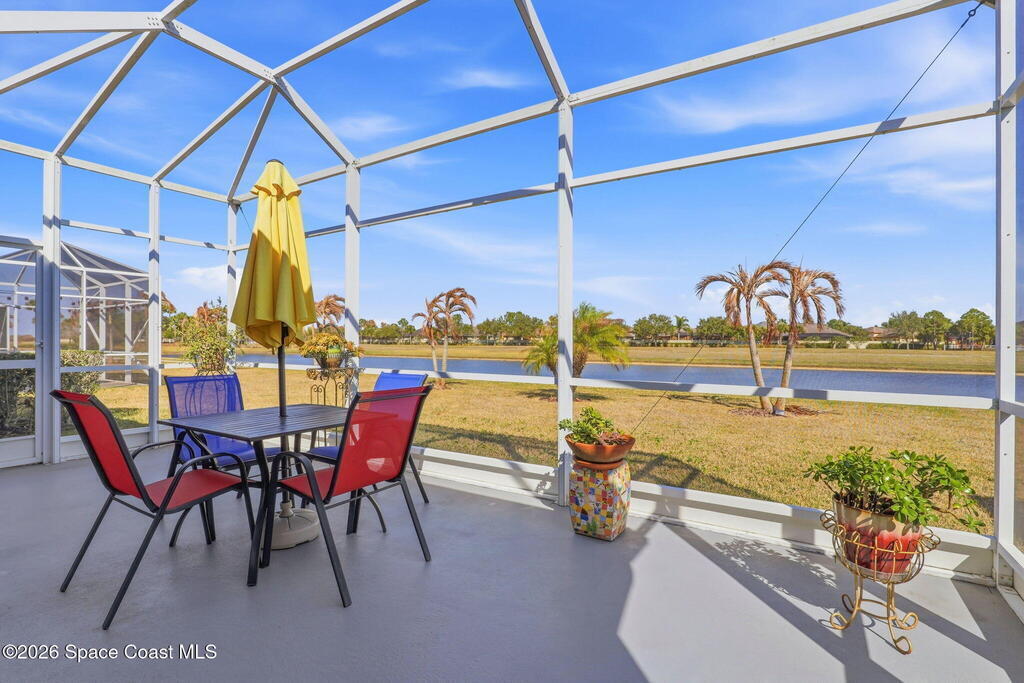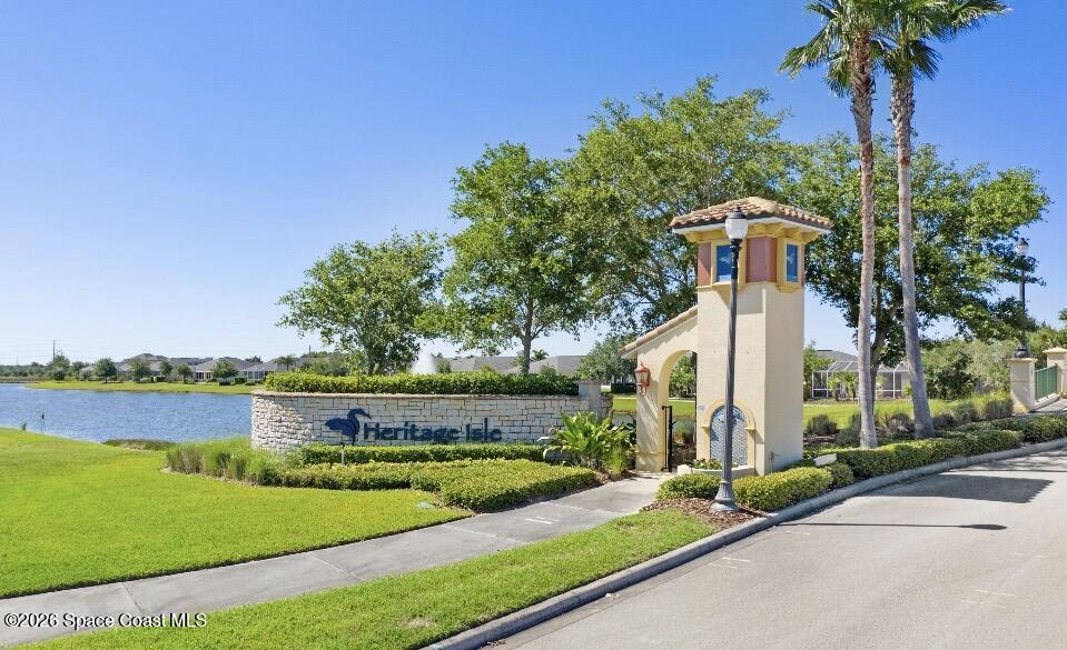 Wake up to water views every day in this beautifully maintained 3BR/2BA home in Viera's premier 55+ maintenance-free community. From the moment you walk in, your eyes are drawn straight through the home to the lake. Built in 2015, this open split floor plan features upgraded diagonal tile throughout main areas and baths, newer laminate flooring in all bedrooms (no carpet), and accordion storm shutters for added peace of mind.The kitchen is the true heart of the home--granite countertops, stainless steel appliances, maple cabinetry, mosaic backsplash, breakfast nook, and formal dining space--perfect for entertaining. The primary suite offers serene lake views, lanai access, dual closets, granite double vanity, and a seamless walk-in shower.Step outside to your extended screened lanai and enjoy rare backyard privacy with no rear neighbors--just peaceful water views. Located near the private resident gate for convenience.Heritage Isle offers lawn care included plus resort-style