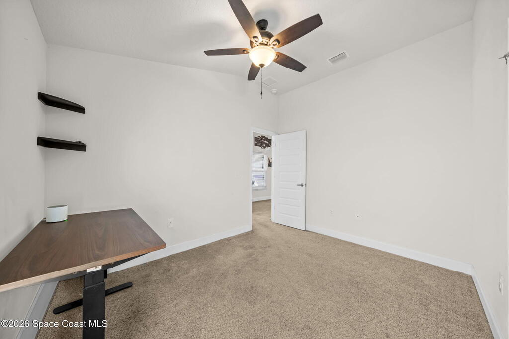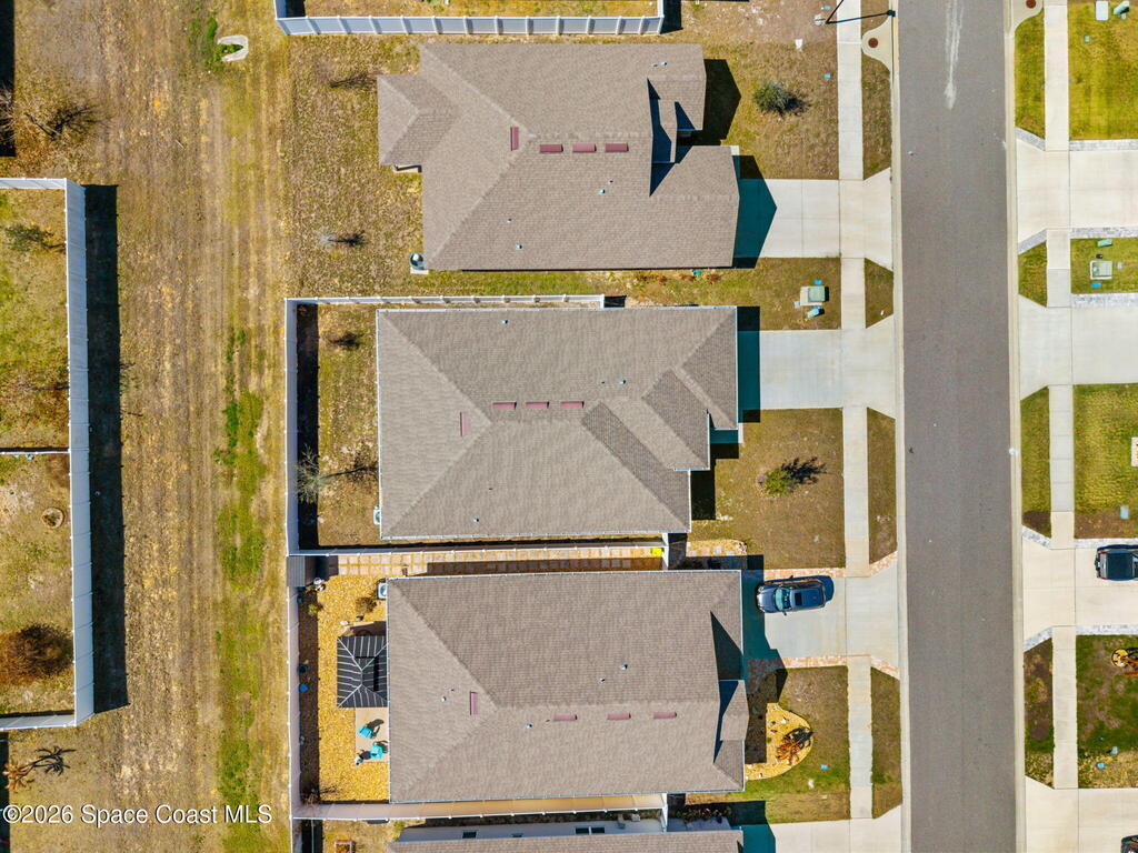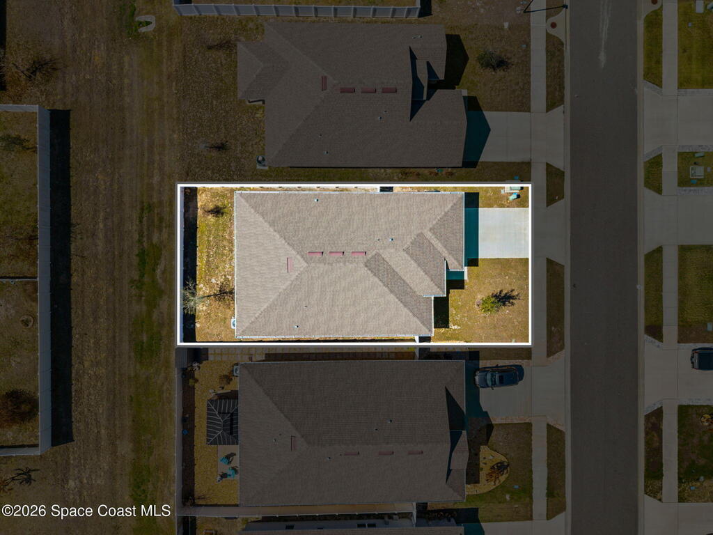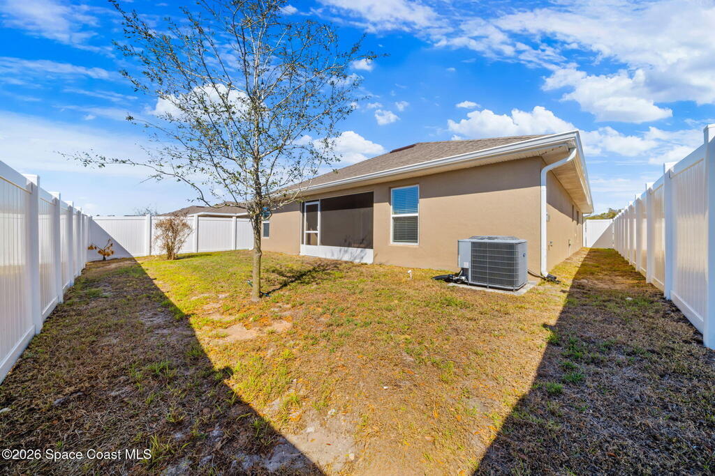 Built in 2022, this home is move-in ready with ceiling fans throughout, fenced yard, screened-in porch, gutters installed, hurricane shutters for peace of mind, split floor plan, and no shortage of closet space. The primary room has a walk-in closet, and the bathroom features a soaking tub and walk-in shower. Located near most of what Central Florida has to offer, this home is just an hour or so away from world-famous attractions in Orlando, and even closer to the beautiful shores of Cocoa Beach. Whether you're a military family or a space enthusiast, you're close to Kennedy Space Center, Patrick Space Force Base, and Cape Canaveral Space Force Station. And you can watch rocket launches from your own yard! Take a tour today to make it yours.