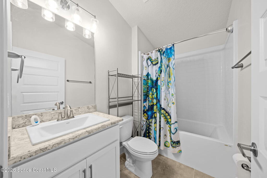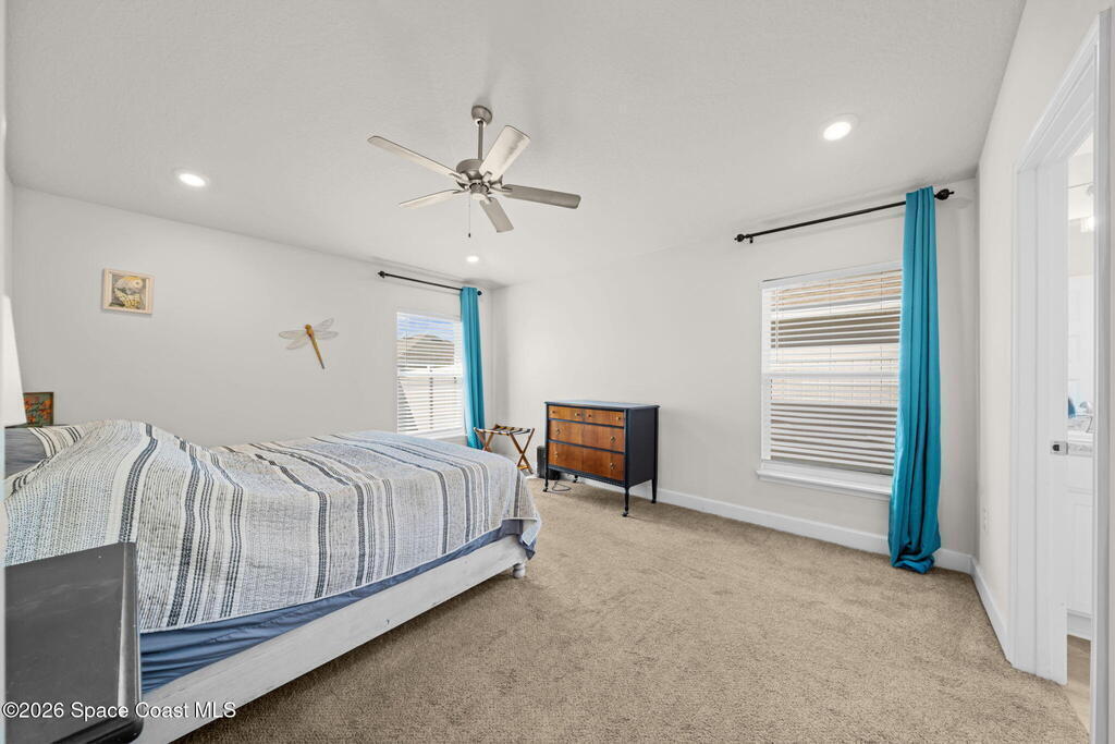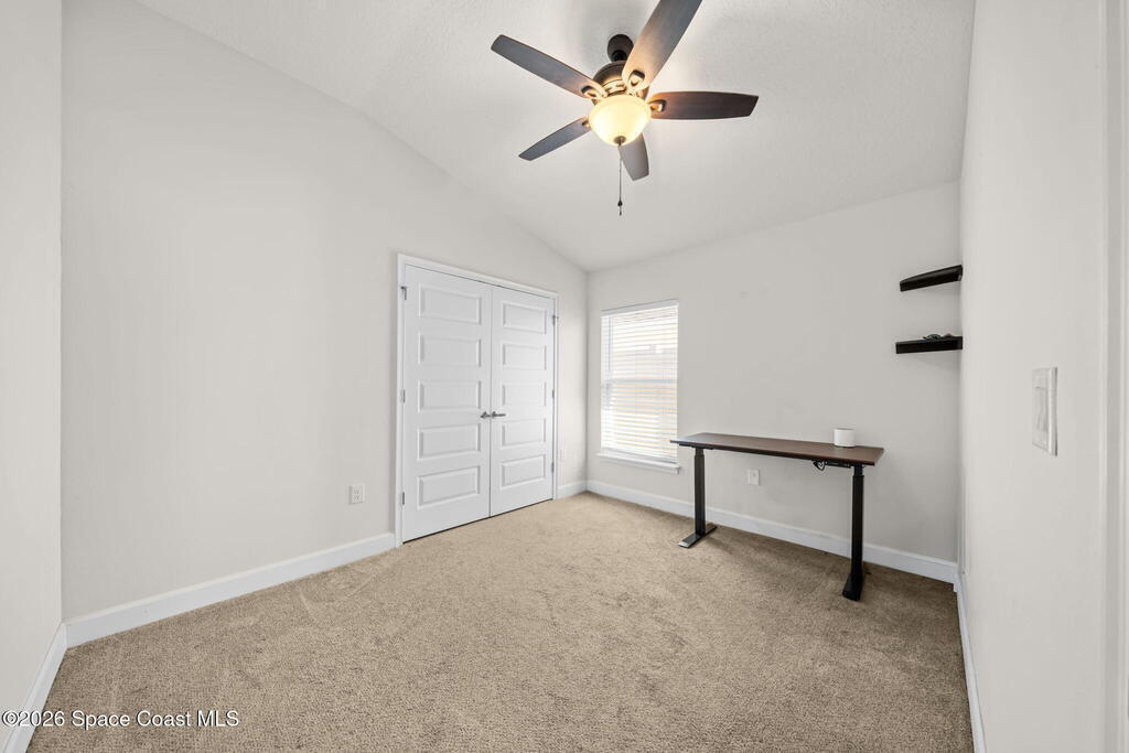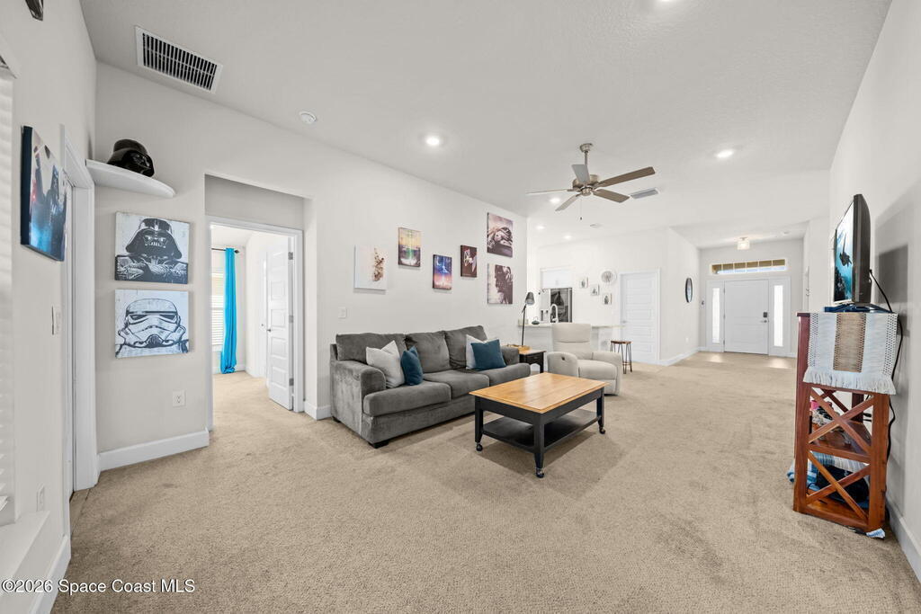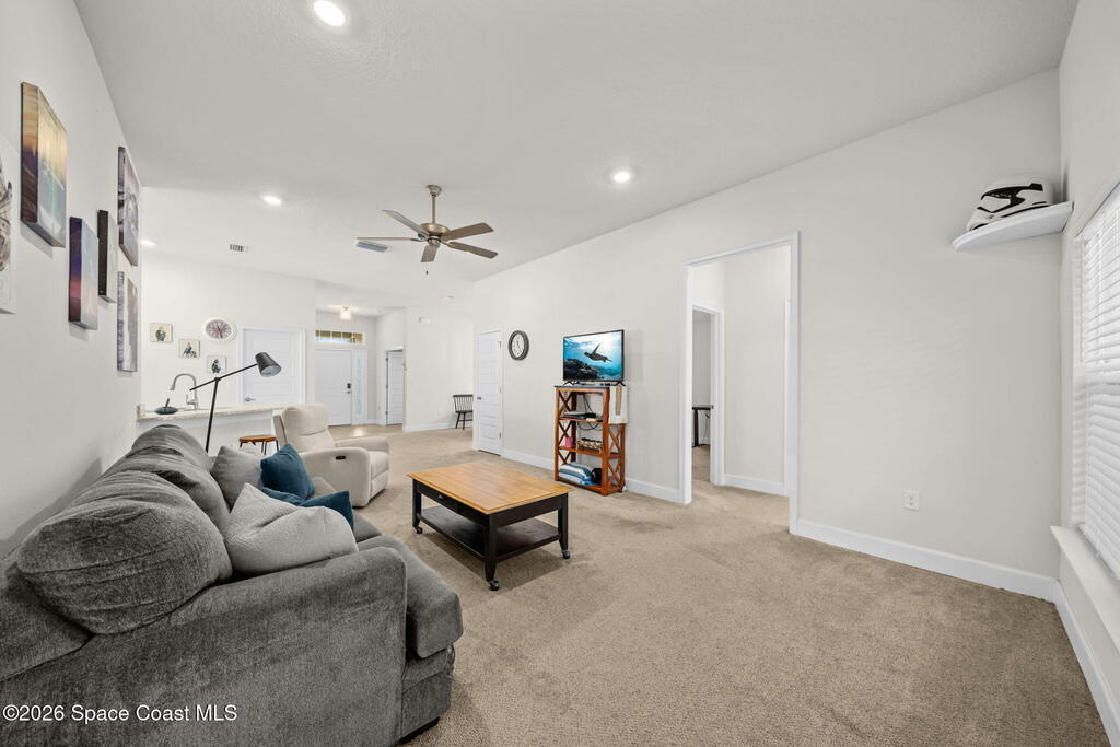 Built in 2022, this home is move-in ready with ceiling fans throughout, fenced yard, screened-in porch, gutters installed, hurricane shutters for peace of mind, split floor plan, and no shortage of closet space. The primary room has a walk-in closet, and the bathroom features a soaking tub and walk-in shower. Located near most of what Central Florida has to offer, this home is just an hour or so away from world-famous attractions in Orlando, and even closer to the beautiful shores of Cocoa Beach. Whether you're a military family or a space enthusiast, you're close to Kennedy Space Center, Patrick Space Force Base, and Cape Canaveral Space Force Station. And you can watch rocket launches from your own yard! Take a tour today to make it yours.