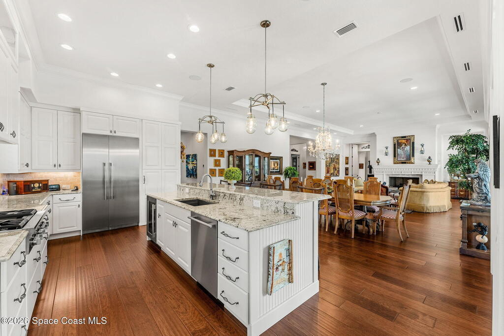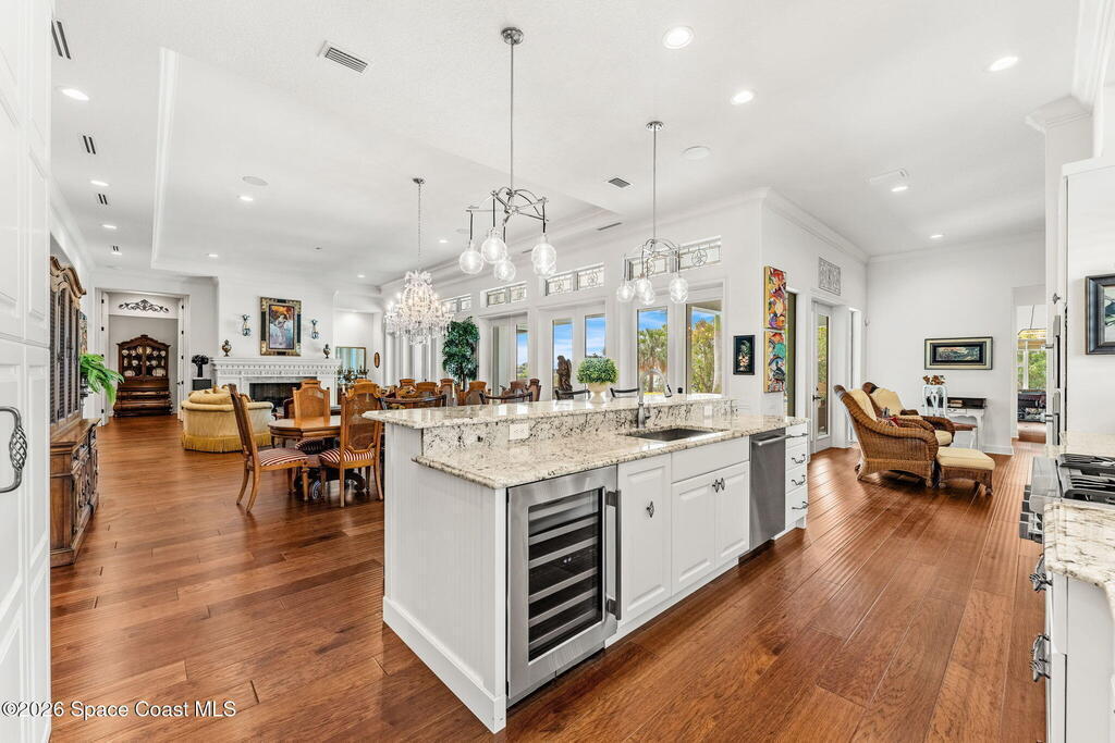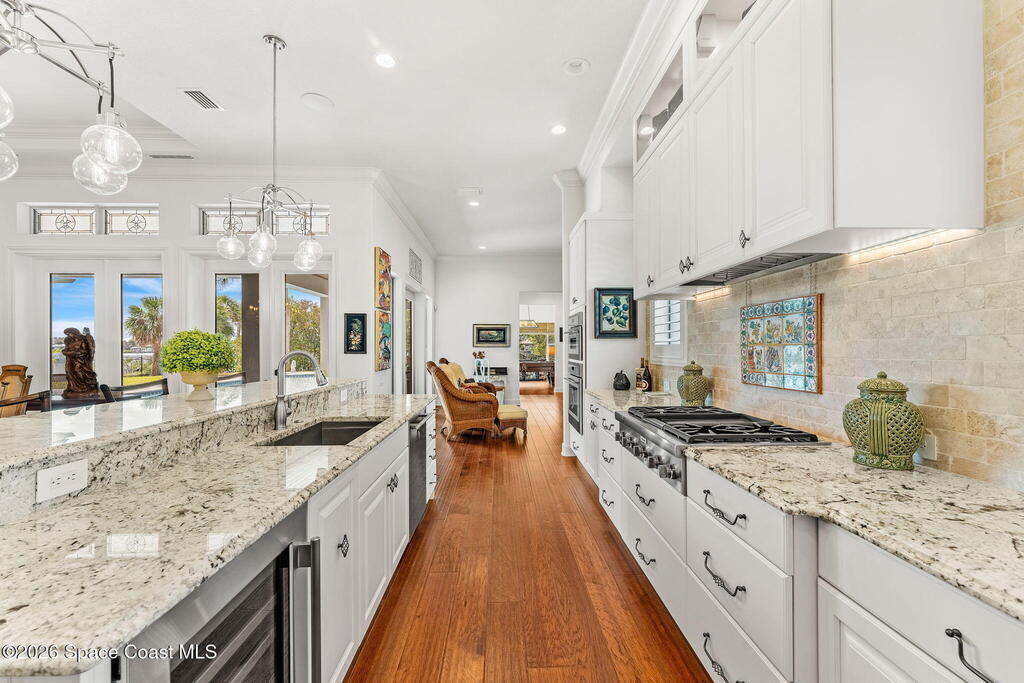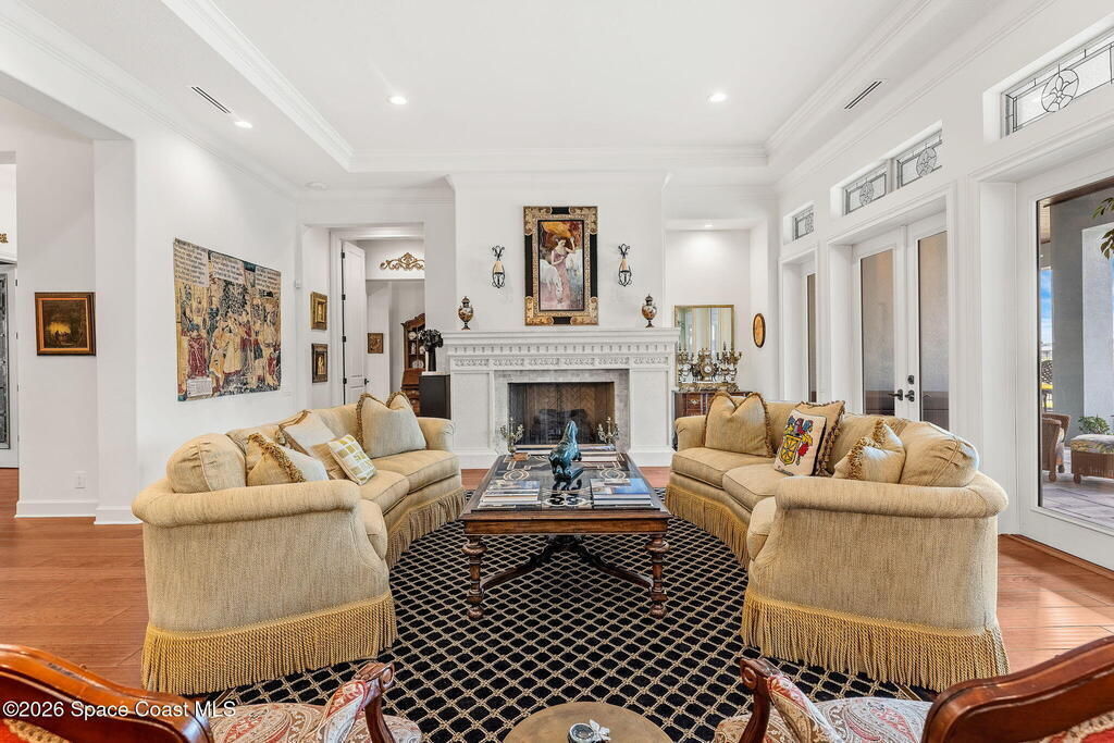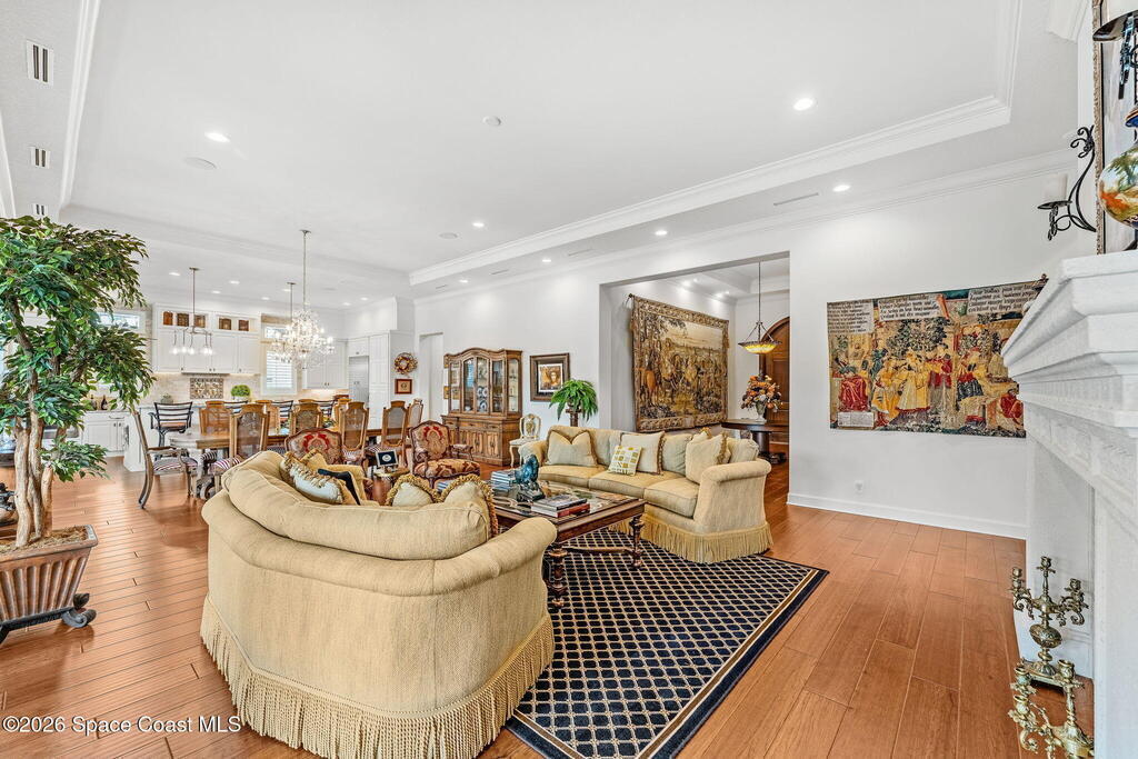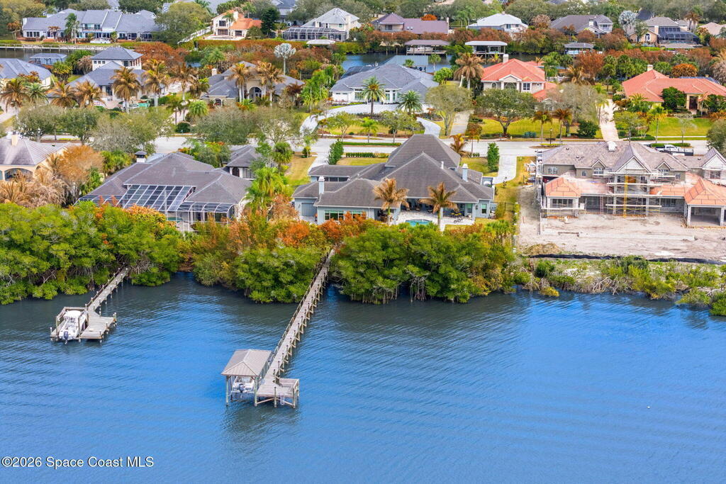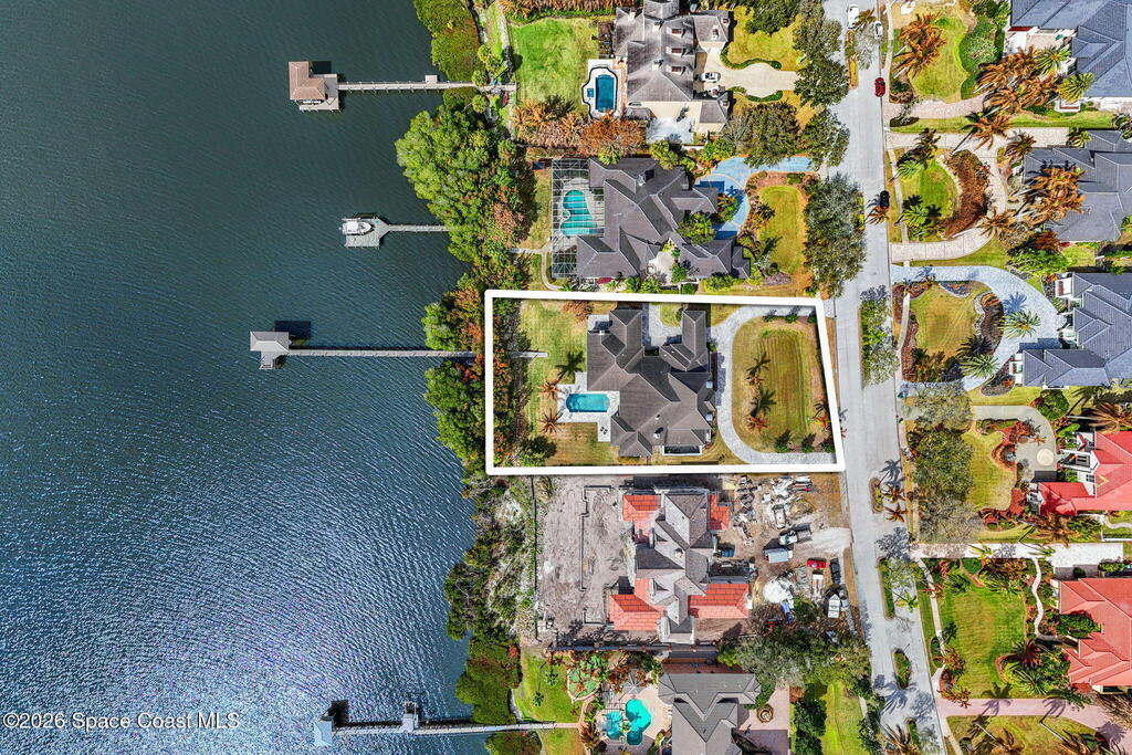 Positioned on 1.11 acres with 150 feet of direct Banana River frontage, this 2020 Arthur Rutenberg custom estate is located within Phase 1 of Lansing Island, the original Estate Section known for its larger, premier homesites.Built of concrete block construction with a concrete tile roof and full Miami Dade impact windows and doors, the residence offers over 5,000 square feet of single level living designed with intention and long term durability in mind.The split bedroom floor plan features either four bedrooms and four and a half baths, or three bedrooms plus a substantial office or flex space. From the moment you enter, expansive water views, elevated ceilings, and a seamless open layout create immediate presence. The interiors feel light and bright while maintaining warmth and character through ultra custom finishes, engineered wood flooring, granite surfaces, custom built ins, stained glass accents, and two gas fireplaces.