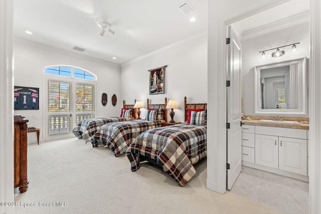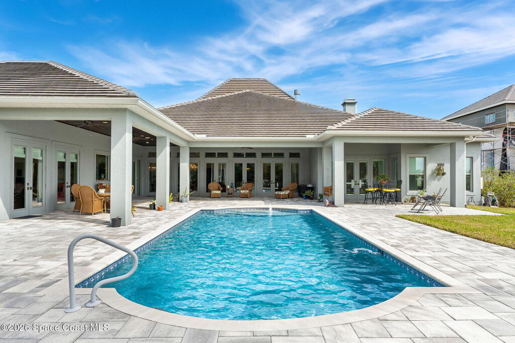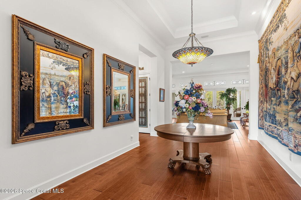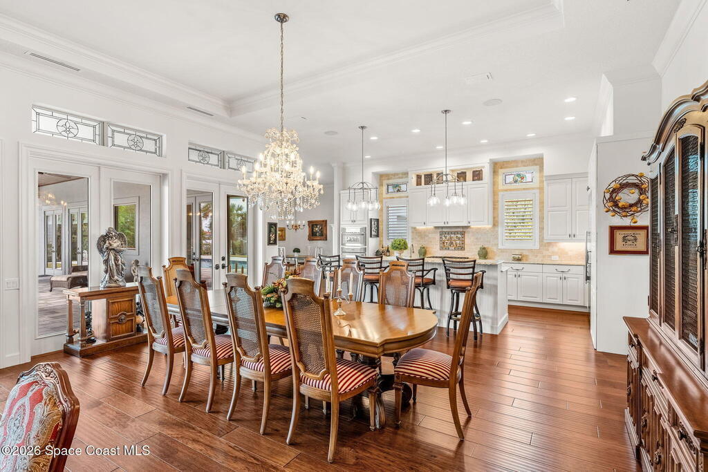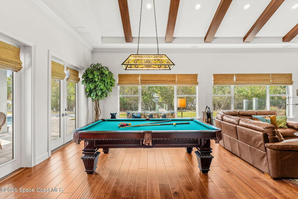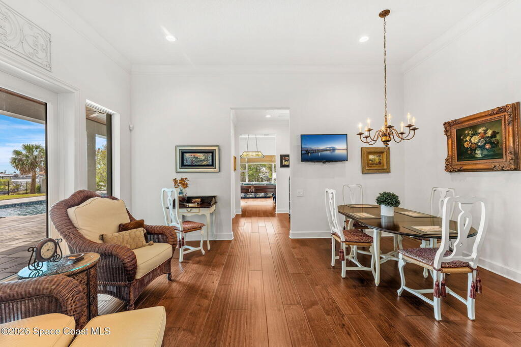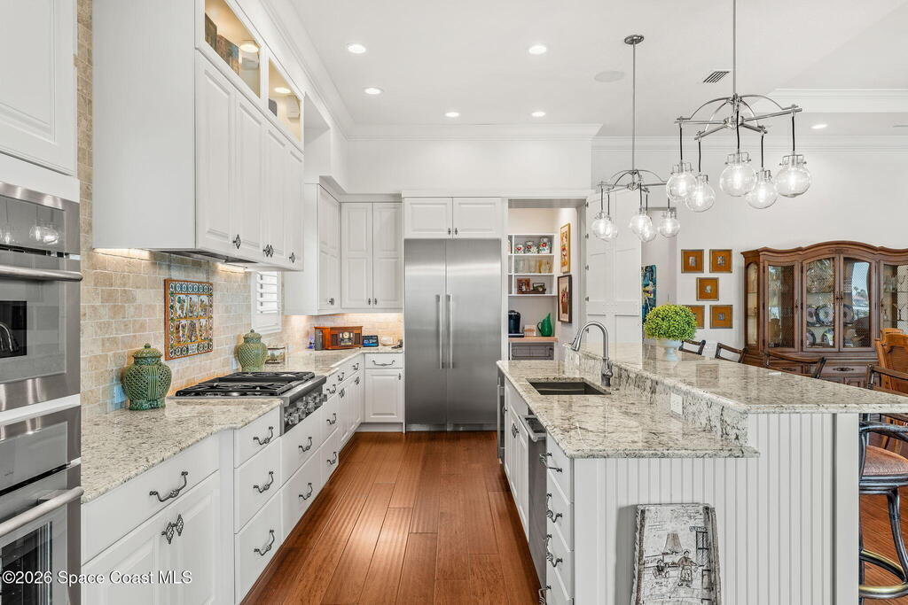 Positioned on 1.11 acres with 150 feet of direct Banana River frontage, this 2020 Arthur Rutenberg custom estate is located within Phase 1 of Lansing Island, the original Estate Section known for its larger, premier homesites.Built of concrete block construction with a concrete tile roof and full Miami Dade impact windows and doors, the residence offers over 5,000 square feet of single level living designed with intention and long term durability in mind.The split bedroom floor plan features either four bedrooms and four and a half baths, or three bedrooms plus a substantial office or flex space. From the moment you enter, expansive water views, elevated ceilings, and a seamless open layout create immediate presence. The interiors feel light and bright while maintaining warmth and character through ultra custom finishes, engineered wood flooring, granite surfaces, custom built ins, stained glass accents, and two gas fireplaces.