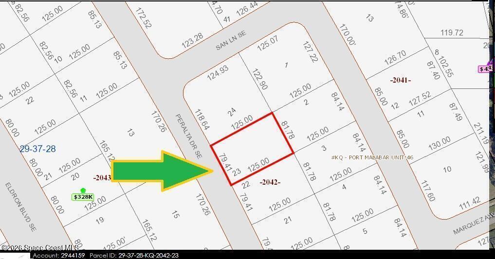 It's a 0.23 acre build-able single family residential lot with city water available [Rs2 Zoning] located in Port Malabar Unit #46 of Palm Bay. Conveniently located in the SE Section of Palm Bay, this lot is just 3.9 miles -9 minutes- to the Publix Supermarket, 5.2 miles -11 minutes- to Bayside High and WestSide Elementary Schools, 5.3 miles -11 minutes to the Shoppes of Palm Bay, and just 14.5 miles -33 minutes- to the beaches in Indialantic. From Exit #173 of I-95 go west on Malabar Road NE. Turn left on San Filippo Drive SE and proceed south for 4.8 miles. Turn left on Eldron Boulevard SE, left on Rila Street SE and right on Peralta Drive SE,. The lot will be on your left.