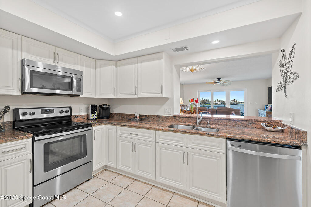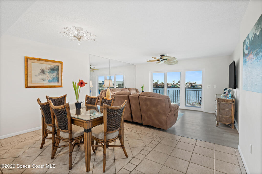 DIRECT RIVERFRONT 2 Bedroom/2 Bath condo in the HEART OF COCOA BEACH with unobstructed BANANA RIVER VIEWS from the kitchen, living area, and the primary suite! Watch dolphins, manatees, and stunning sunsets from your private balcony and experience true Florida living at its best! The kitchen features granite countertops, stainless steel appliances, and a breakfast bar that opens to the living and dining areas. The primary suite offers generous space, abundant natural light, and sliders overlooking the river. Sleek tile and wood-look laminate flooring flow throughout. Peace of mind updates include a new 2025 hot water heater, hurricane impact sliders, storm door, and full building restoration completed in 2025. In-unit laundry, secure 1-car garage, and separate storage add everyday convenience. Minutes from the beach, restaurants, grocery, shopping, and parks--everything Cocoa Beach has to offer is right at your doorstep!