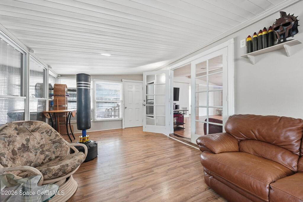 This beautifully maintained 3-bedroom split floor plan offers privacy and comfort when hosting friends and family. The open-concept living, dining, and kitchen areas create an inviting space perfect for everyday living and entertaining. The updated kitchen features newer cabinetry and a built-in hutch in the dining area, adding both charm and functionality. The spacious main suite spans the full width of the home and showcases custom cabinetry and a beautifully tiled walk-in shower. Two additional bedrooms and a second full bath provide ample space for family or guests. French doors open to a 22-foot raised Florida room -- ideal for year-round enjoyment. Storage is abundant throughout the home, with generous closet space inside and a large workshop/storage shed outside, perfect for hobbies.