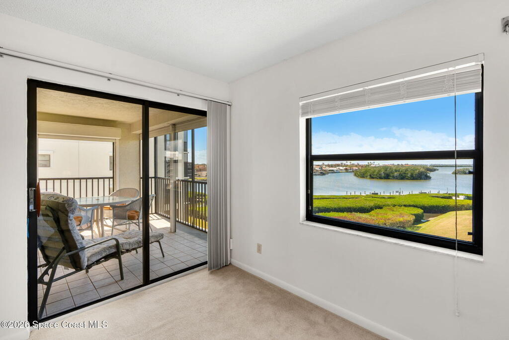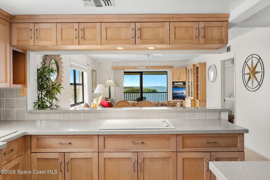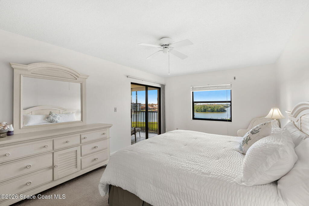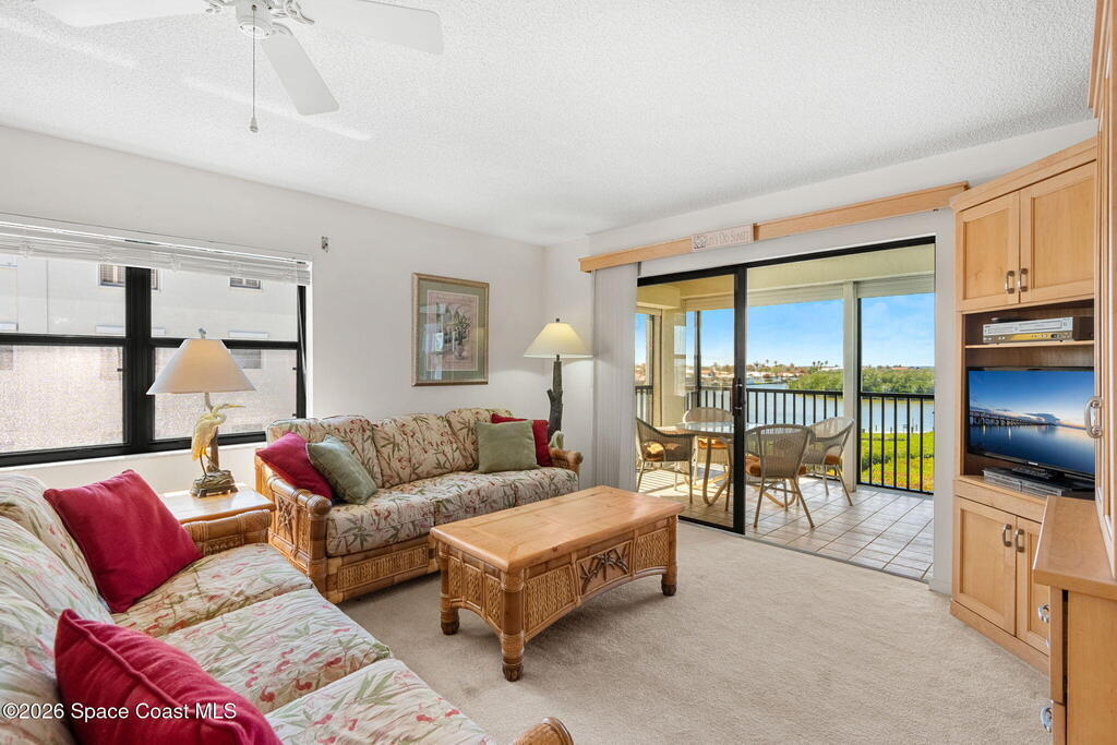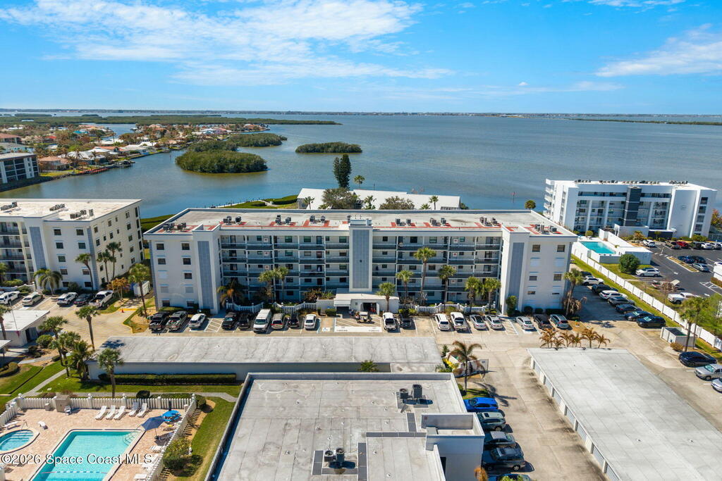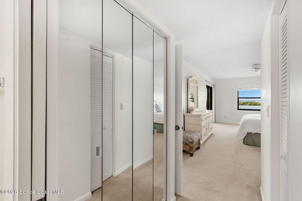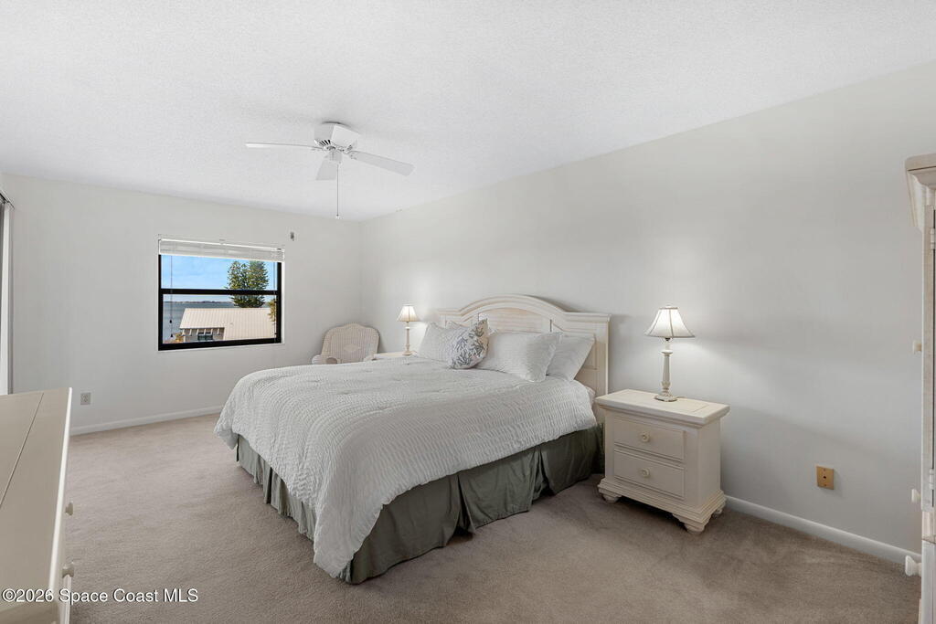 Available now, a new listing in Cocoa Beach! This 4th-floor corner unit in Fountain Cove is an exceptional 3-bedroom, 2-bath residence offering fantastic views of the Banana River. The home has been lovingly maintained and features custom wood cabinetry and Corian countertops throughout the kitchen and bathrooms, complemented by matching custom built-ins in the living room. Each bedroom is finished with plush carpeting for added comfort. The primary suite includes dual closets leading into a well-appointed en-suite bath, and both the suite and the private balcony offer sweeping waterfront views. The balcony has recently undergone a full restoration and comes equipped with shutters for peace of mind. Residents of Fountain Cove enjoy an inviting waterfront lifestyle with access to a heated pool, clubhouse, tennis/ pickle board court, and a car wash station. This unit also includes a private one-car garage along with ample open parking for guest!
