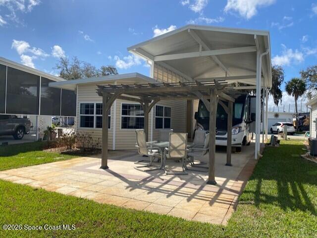 This beautifully updated home is located with lake views and features covered parking for a Class A motorhome. Move in and enjoy Florida resort living, year round or seasonally. The outdoor space features a pergola and paved patio with a sea wall providing relaxing views of the lake and fountain. The house has new everything including: new cabinets, appliances, tile backsplash and shower, washer/dryer, ceiling fans, and paint. Fresh and ready for you to enjoy. New roof and AC in 2024. Amenities include; clubhouse, heated pool, pickleball, tennis, shuffleboard, bocce, and gated entry closes after 6 pm. Executive golf course and watch the rocket launches from your own front yard. Close to airports, beaches, theme parks, shopping and restaurants.