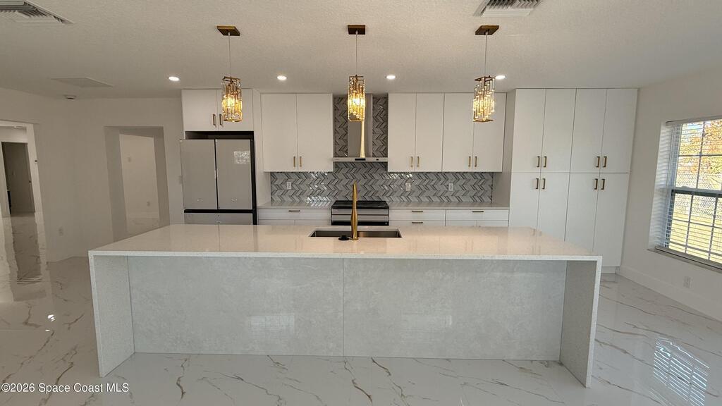 Completely renovated 4-bedroom home, including 2 master suites, in a prime location in Palm BayWelcome to this completely remodeled residence, designed with modern elegance and high-quality finishes throughout.From the moment you arrive, you'll notice the renovated facade, clean architectural lines, and inviting covered entrance. Inside, the home opens up to an open, spacious, and bright layout, with large-format porcelain tile flooring, recessed LED lighting, and designer accents.The stunning kitchen features:Spacious center island with quartz countertopsCustom two-tone cabinets with gold handlesModern chevron backsplashAppliances with glass topsContemporary pendant lightingWall-mounted range hoodThe master suite offers spa-inspired bathrooms with:Frameless glass shower enclosureDesigner tile backsplashGold accents and modern lightingThis home is move-in ready and ideal for multigenerational families seeking a comfortable, luxurious property well located