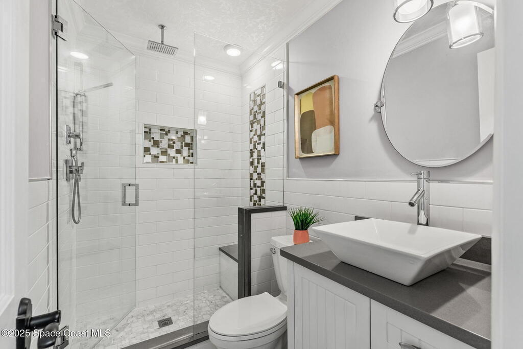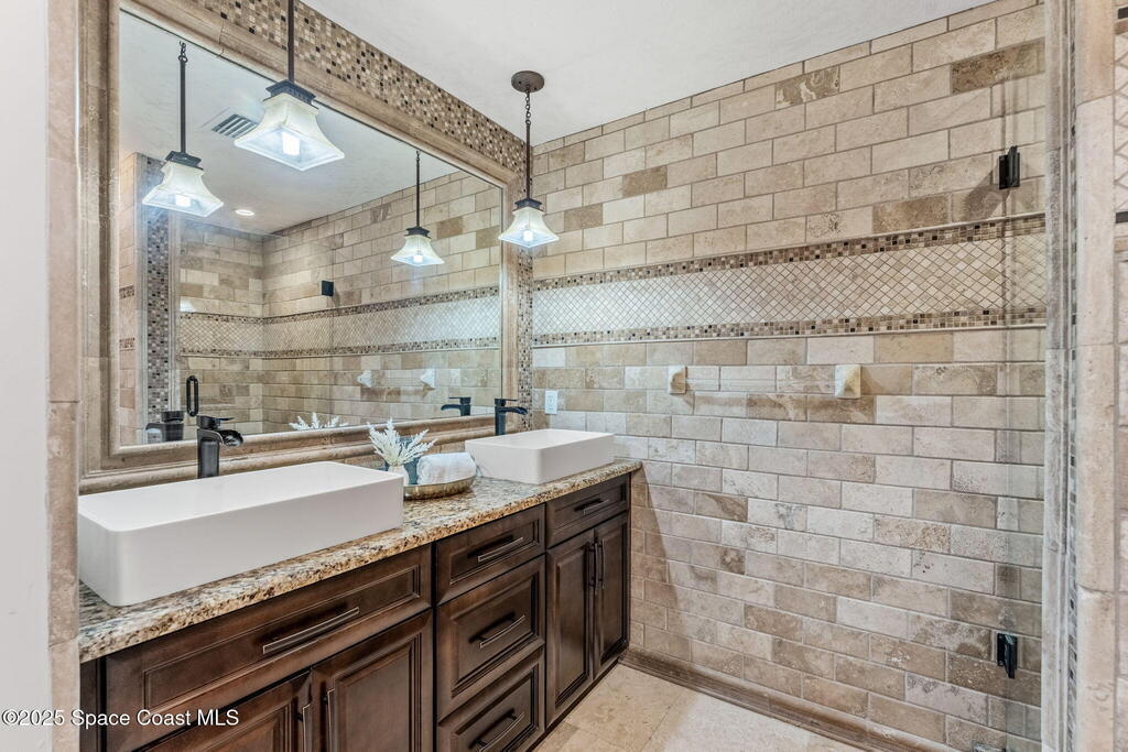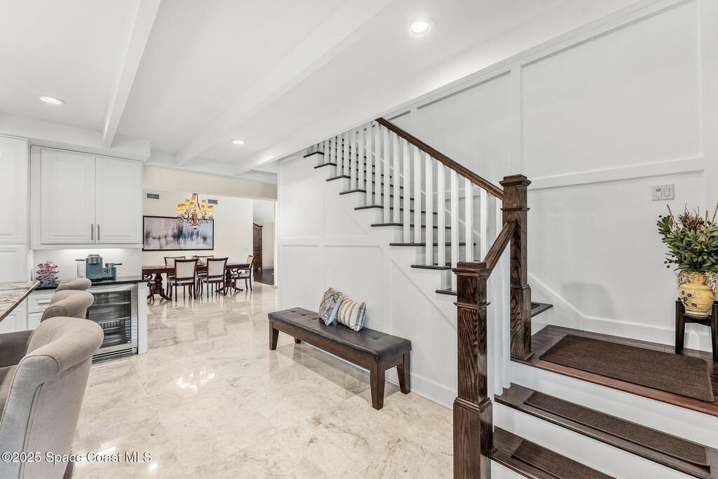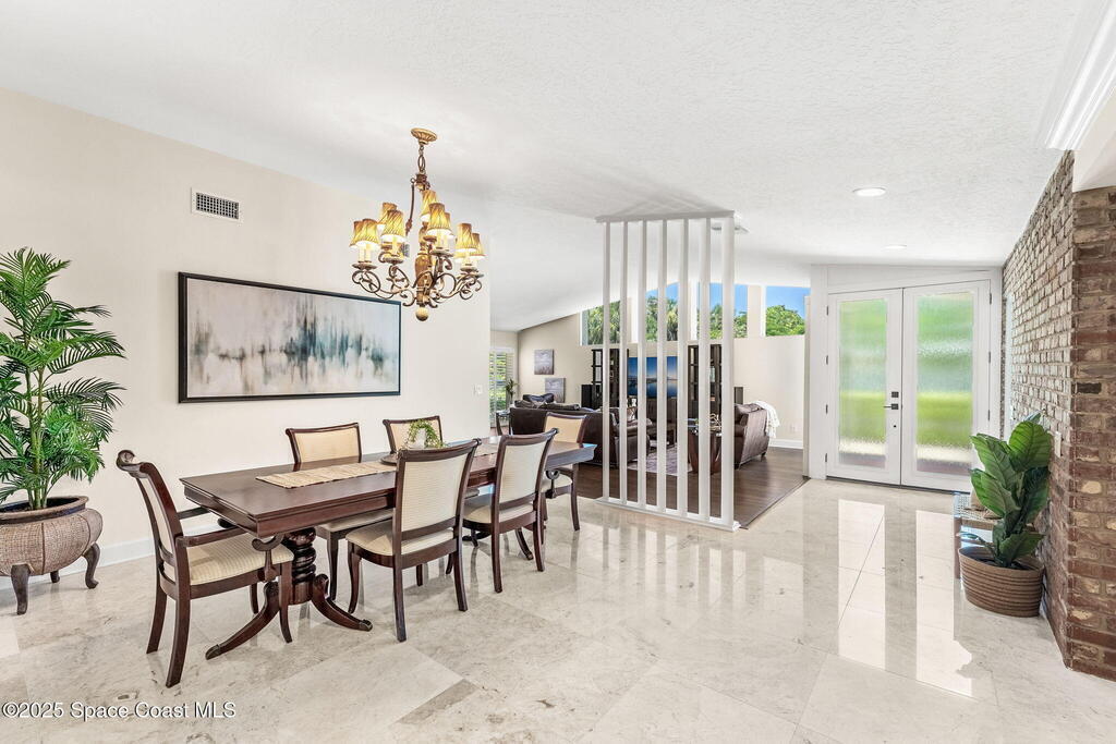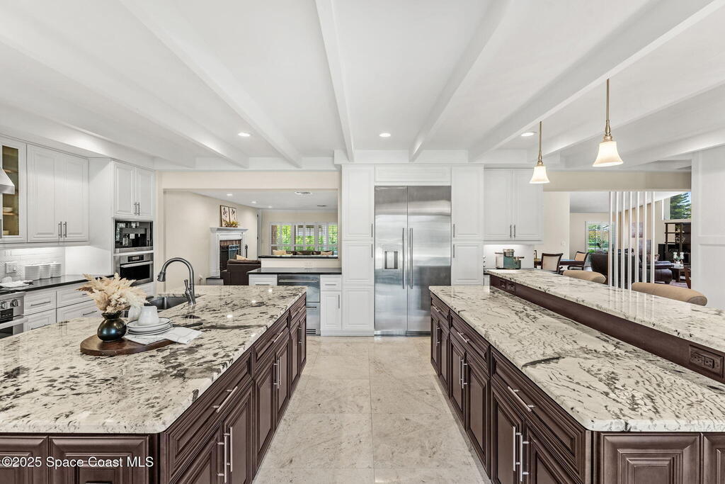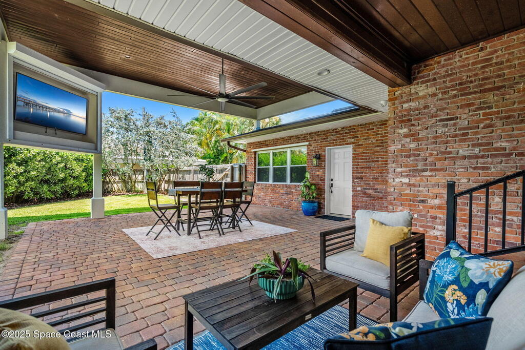 Nestled in Indialantic by the Sea, this stately Chicago brick home welcomes you with a massive Charleston-style front porch and an equally inviting back porch--perfect for sipping sweet tea, gathering with friends, or enjoying the coastal breeze. The back porch offers a large outdoor space for a TV, protected by a hurricane shutter for year-round enjoyment. The expansive backyard offers plenty of room for a pool (see renderings). Inside, this 4BD/3BA home features a spacious bonus room, solid oak and marble tile floors, and a chef's kitchen with double islands, granite countertops, and premium Miele and Thermador appliances. A wood-burning fireplace adds charm. Upgrades include a new roof (Feb 2025), impact-rated garage door (Apr 2025), new whole-house ductwork (2023), and Trane HVAC (5-yr warranty). Lifetime cabinet and most window warranties convey. Oversized driveway and RV plug blend practicality with coastal lifestyle. Zoned Indialantic & Hoover.