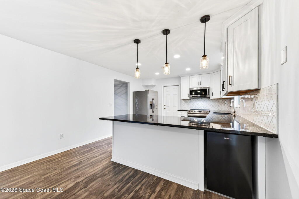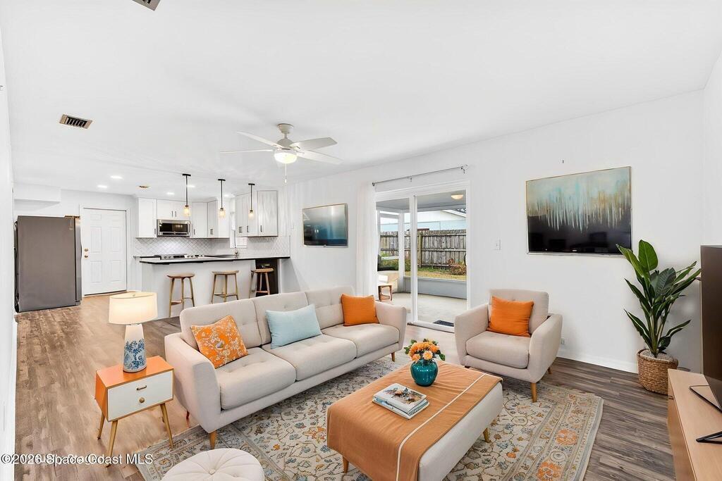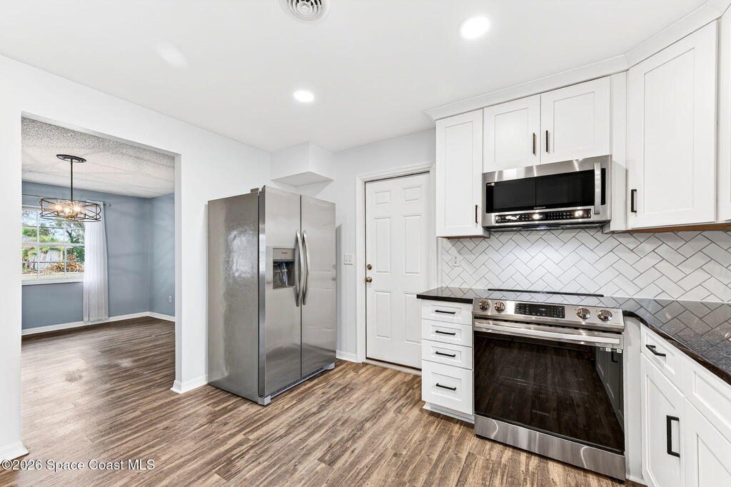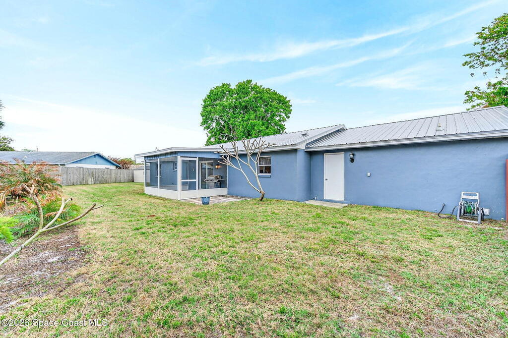MOVE IN READY and beautifully updated ranch in the heart of Rockledge! Situated on a fully fenced .27-acre extended corner lot, this 3-bedroom, 2-bath, 2-car garage home offers bright, open living spaces with abundant natural light and vinyl flooring throughout--NO carpet. The kitchen features solid wood soft-close cabinetry, granite countertops, and stainless steel appliances. Major updates include a METAL ROOF (2024) and HVAC (2025). The spacious primary suite boasts a renovated ensuite bath with countertops and a tiled walk-in shower with glass enclosure. Enjoy the freedom of NO HOA. Conveniently located near Publix, ALDI, Whole Foods, Starbucks, and the Post Office. Approximately 20 minutes to Patrick Space Force Base and area beaches. Schedule your private showing today!