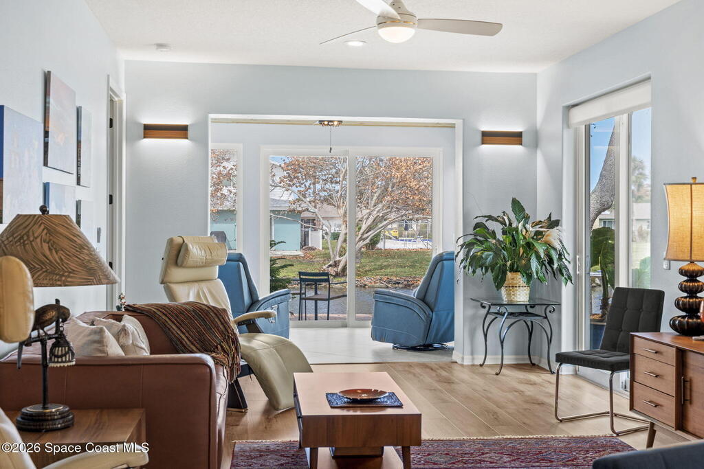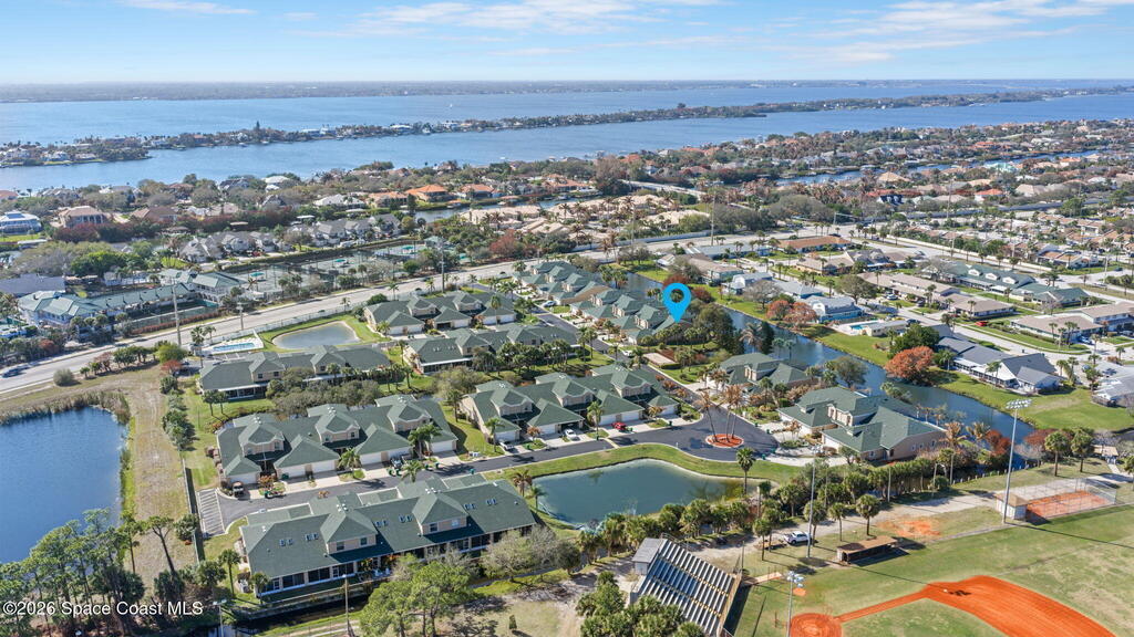 This canal-front corner lot townhome offers over 2,200 sq ft of beautifully updated & meticulously maintained living space, highlighting a showstopping enclosed Florida room w/panoramic hurricane-impact windows framing the Desoto Canal. The first-floor primary suite offers everyday convenience, while two spacious upstairs en-suite bedrooms give family and guests their own retreat. An updated kitchen w/gas stovetop, soaring ceilings, skylights, and natural light throughout make the home feel open and inviting. An oversized 0.19-acre corner lot (2x typical community size), community pool, waterfront sundeck next door, Kiwi Tennis Club across the street, Desosto/Frank P Catino Park within walking distance, and the beach just minutes away allow care-free outdoor living, while top-rated schools and convenient shopping round out a location that checks every box. HOA covers the roof (2021), exterior, and common area. A rare move-in-ready find!