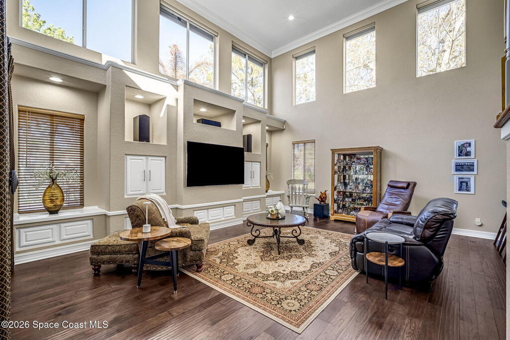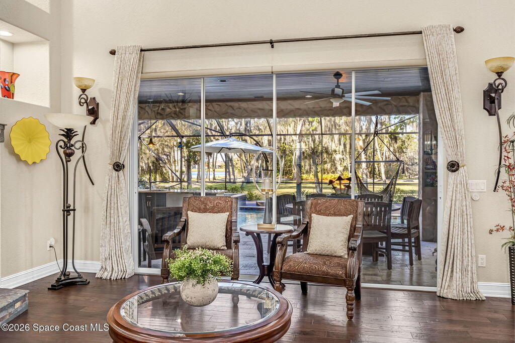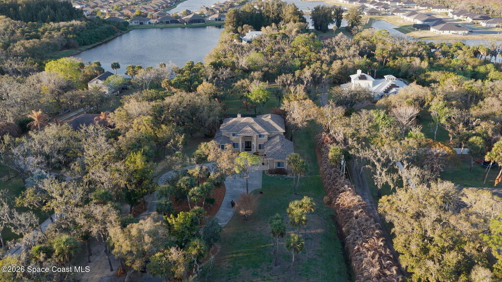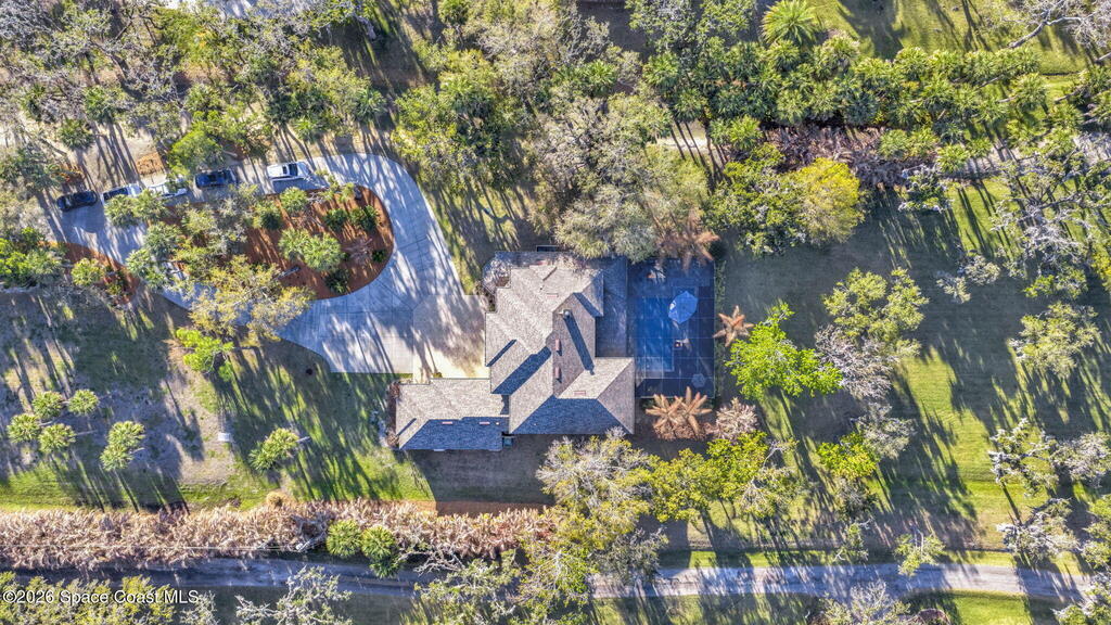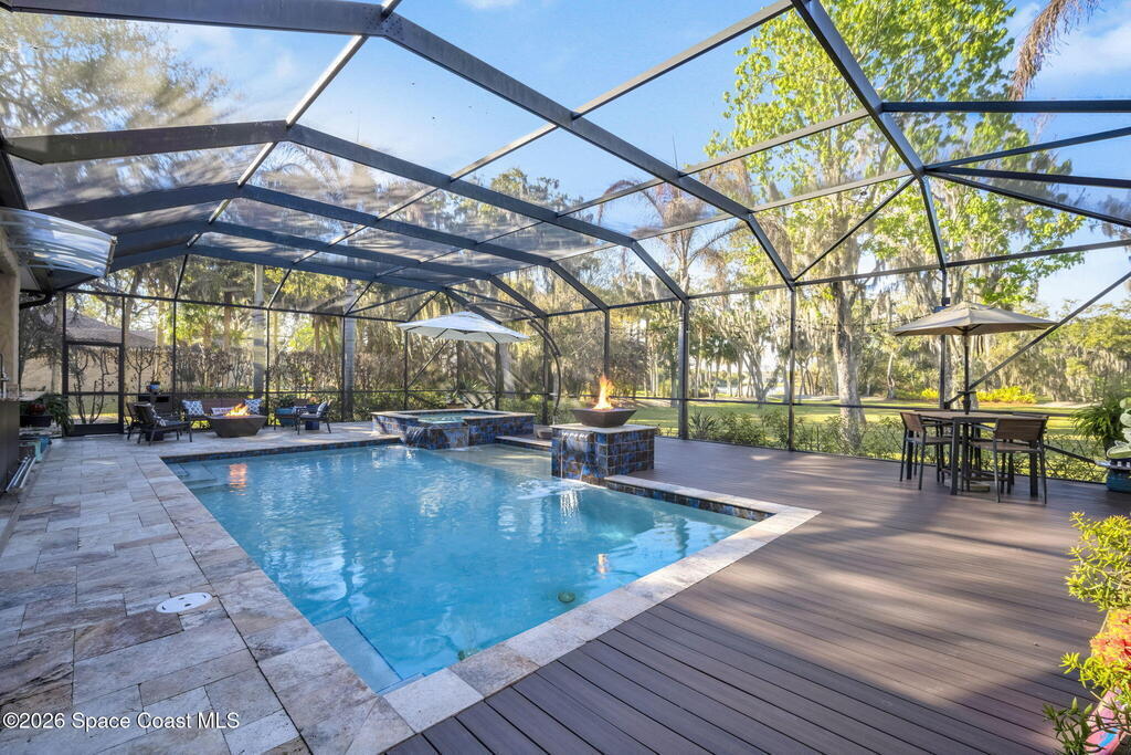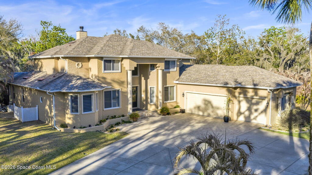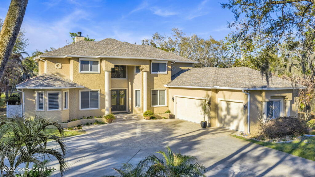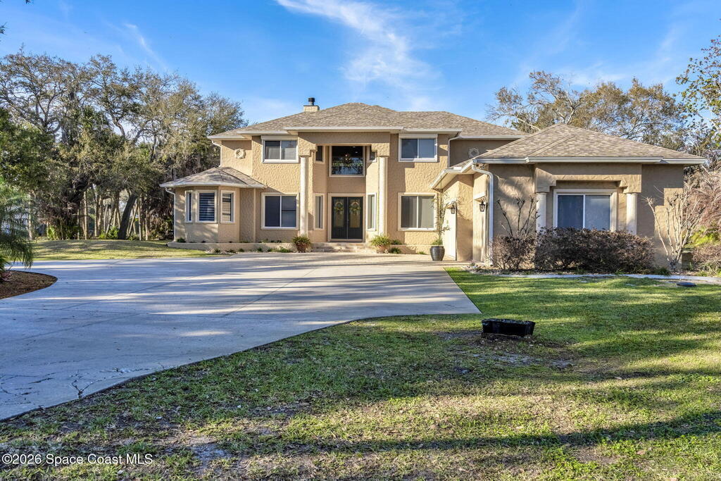 Welcome to this exceptional luxury estate in highly desirable North Merritt Island, offering over two private acres of beautifully maintained, private grounds. This impressive two-story residence features 5 spacious bedrooms, 4 full bathrooms, plus a dedicated office, soaring vaulted ceilings, expansive windows that flood the home with natural light, and custom built-ins that add both character and function. A beautiful fireplace anchors the main living area.The expansive primary retreat is a true sanctuary, offering generous proportions, a spa-inspired bath with a soaking tub, walk-in shower, dual vanities, and an oversized walk-in closet. Step outside to your own resort-style oasis featuring a modern pool and spa, dramatic fire bowl accents, and a fully equipped summer kitchen perfect for hosting unforgettable evenings. The three-car garage with EV charging, hurricane shutters. Lush landscaping, and unmatched privacy complete this rare opportunity to own an estate in Merritt Island.