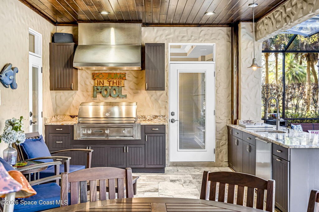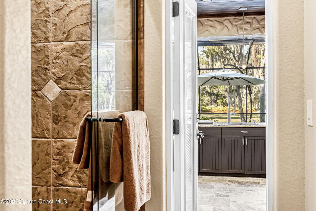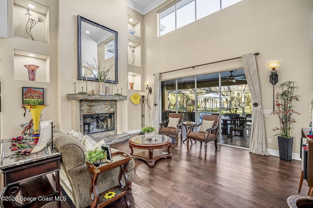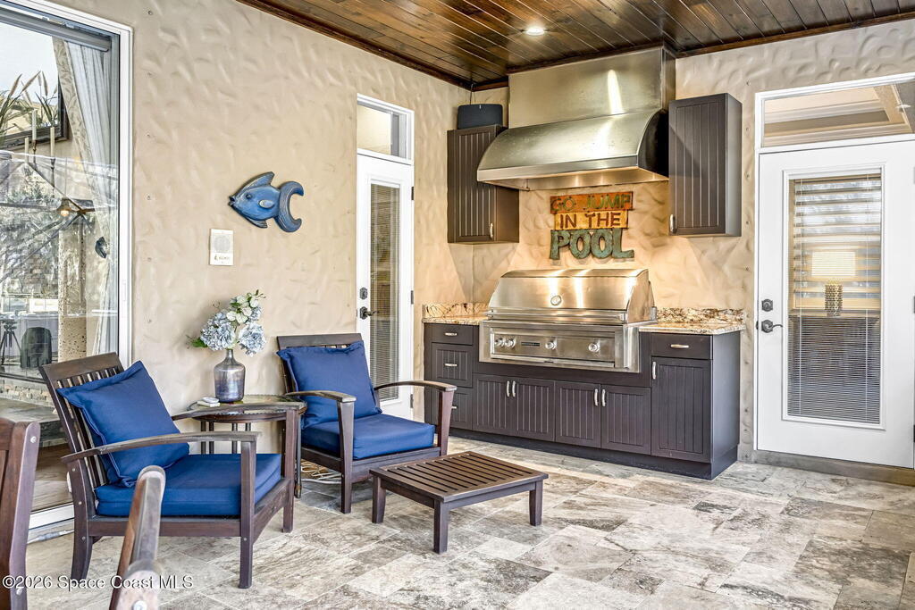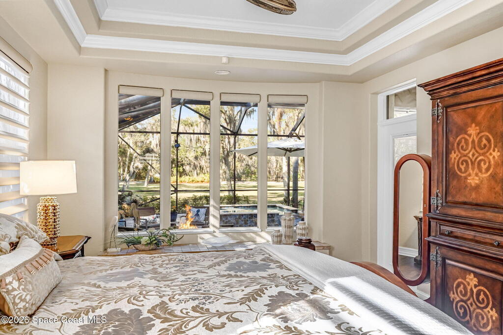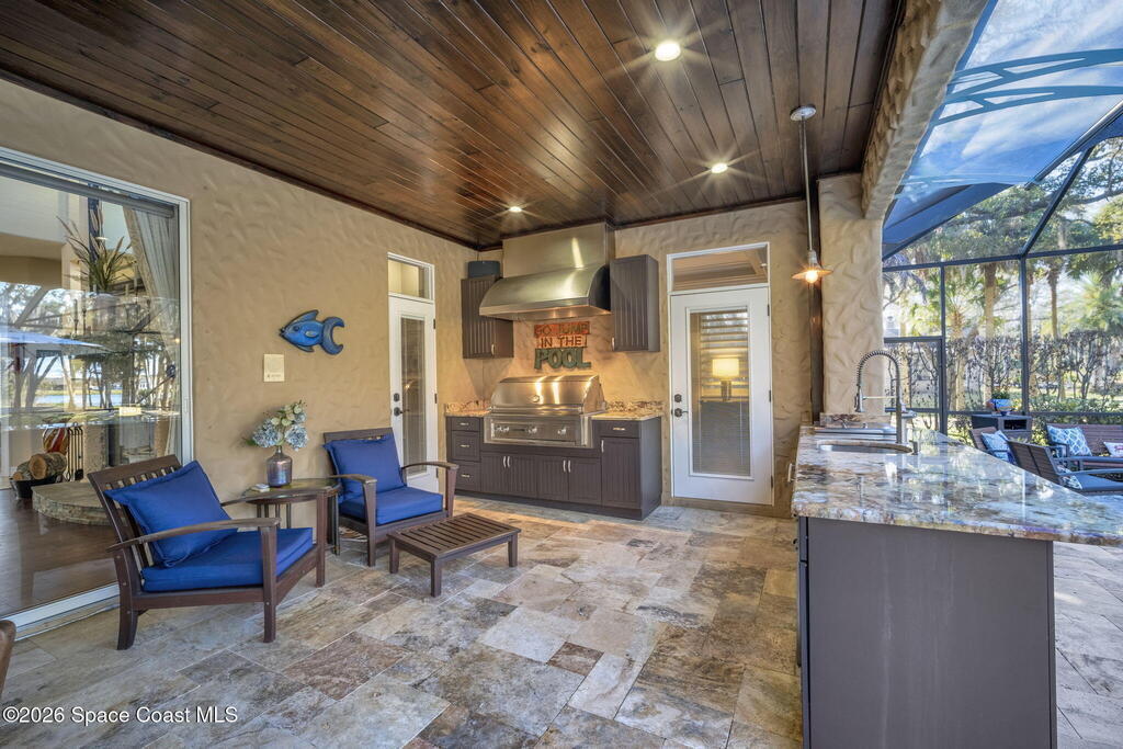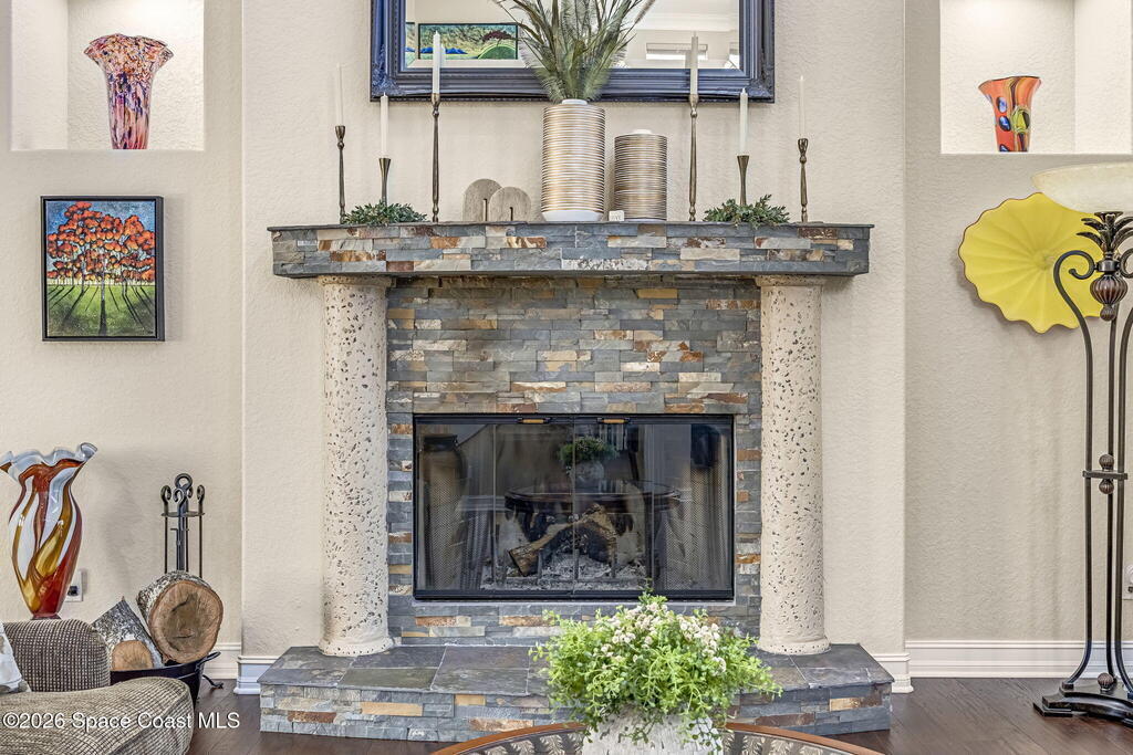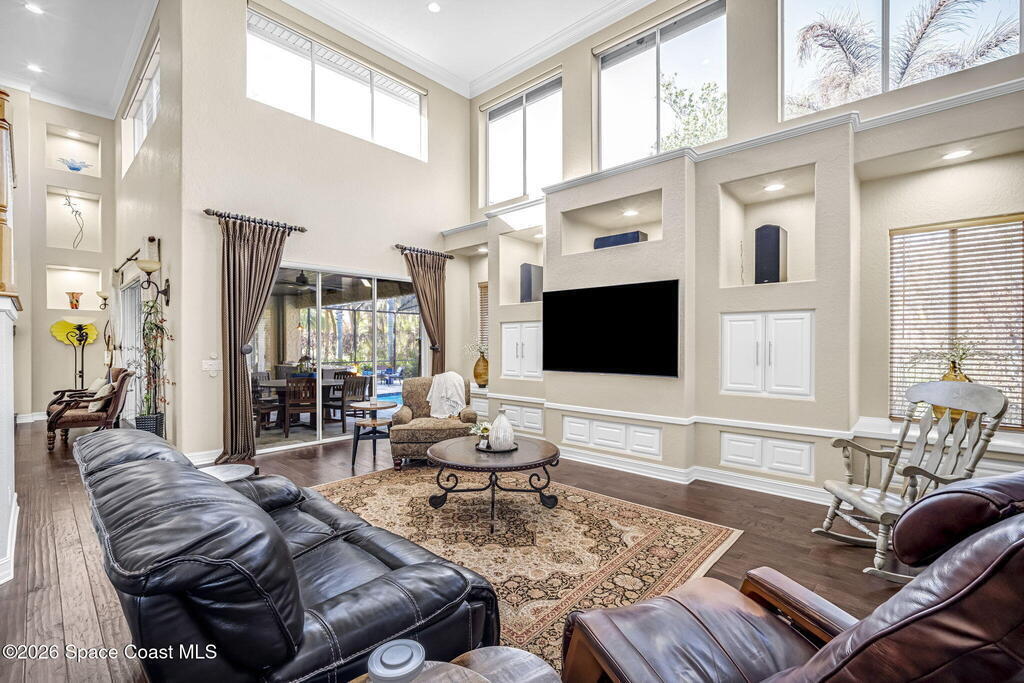 Welcome to this exceptional luxury estate in highly desirable North Merritt Island, offering over two private acres of beautifully maintained, private grounds. This impressive two-story residence features 5 spacious bedrooms, 4 full bathrooms, plus a dedicated office, soaring vaulted ceilings, expansive windows that flood the home with natural light, and custom built-ins that add both character and function. A beautiful fireplace anchors the main living area.The expansive primary retreat is a true sanctuary, offering generous proportions, a spa-inspired bath with a soaking tub, walk-in shower, dual vanities, and an oversized walk-in closet. Step outside to your own resort-style oasis featuring a modern pool and spa, dramatic fire bowl accents, and a fully equipped summer kitchen perfect for hosting unforgettable evenings. The three-car garage with EV charging, hurricane shutters. Lush landscaping, and unmatched privacy complete this rare opportunity to own an estate in Merritt Island.