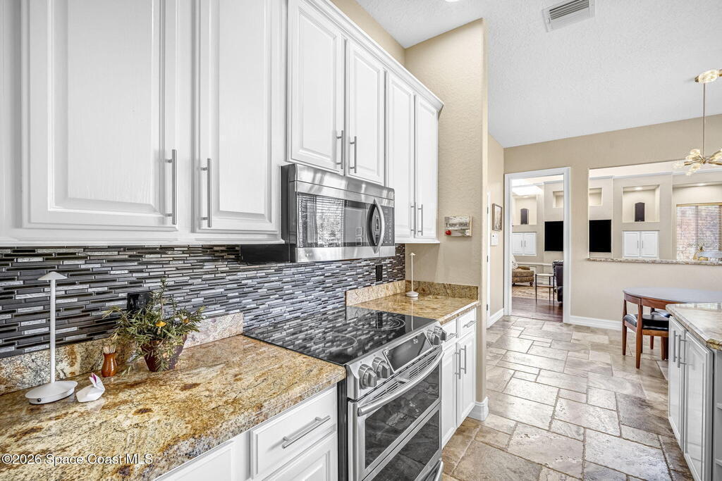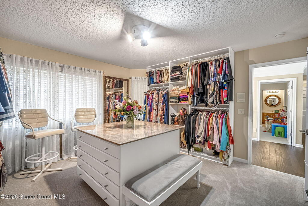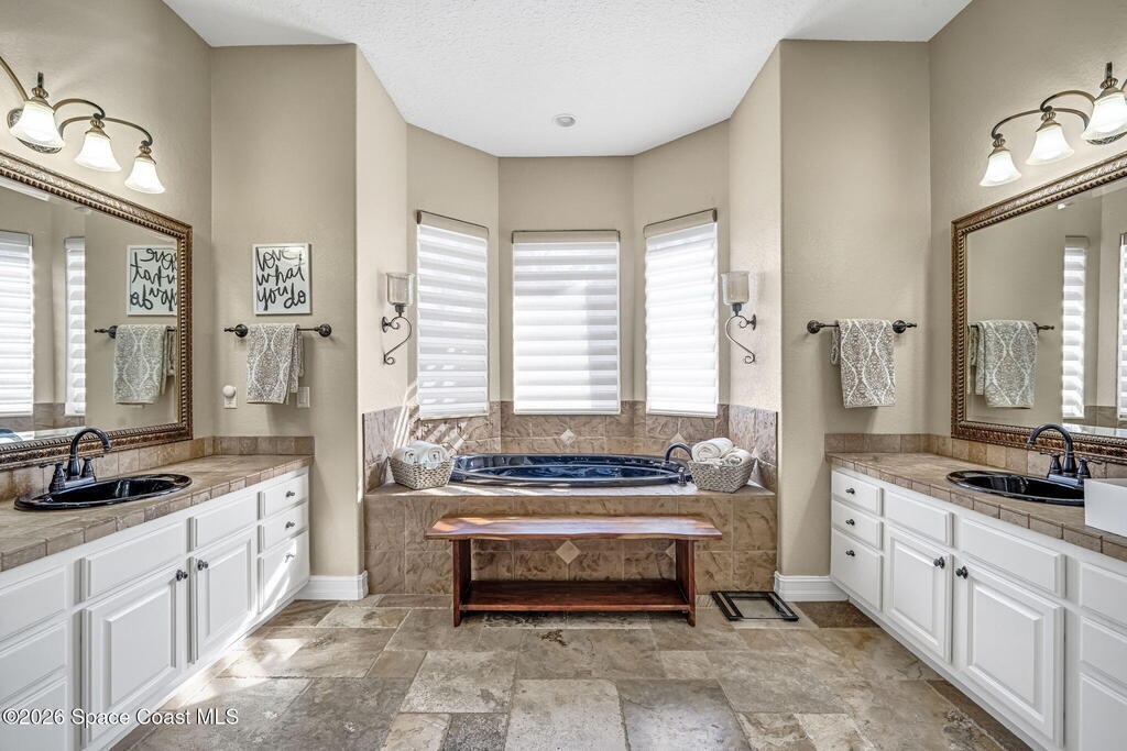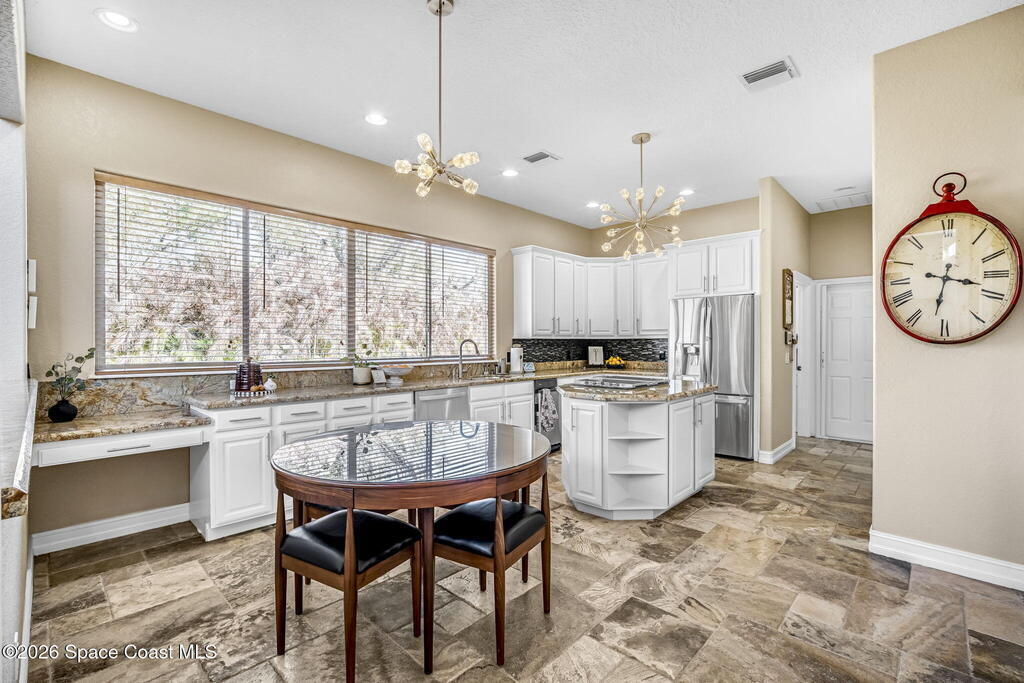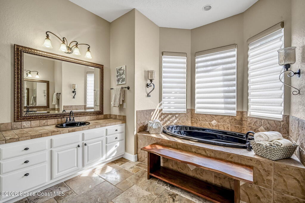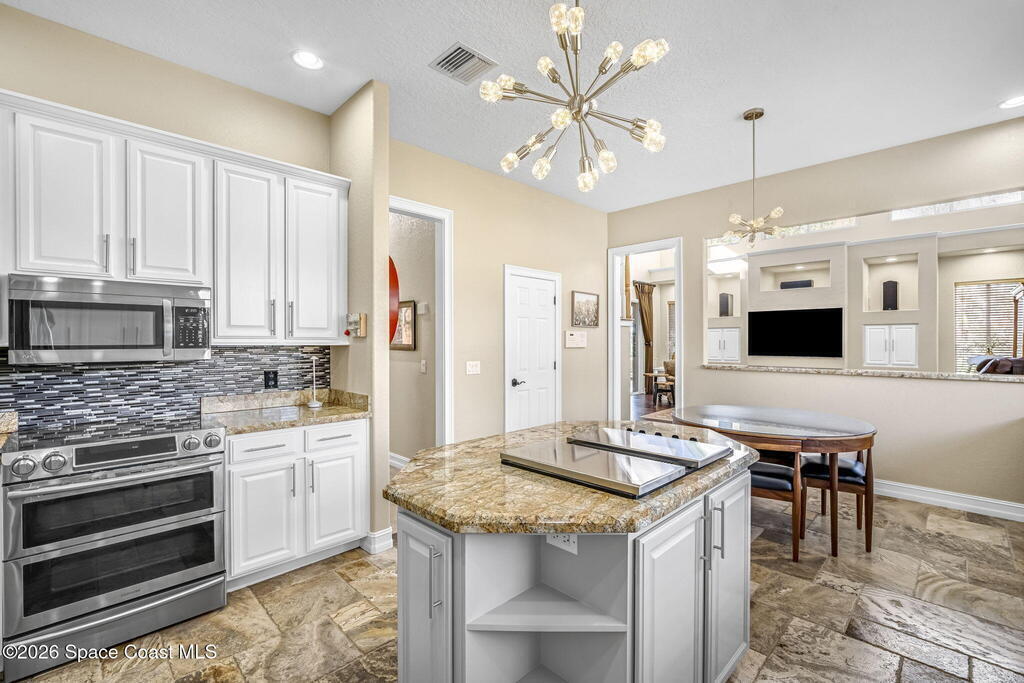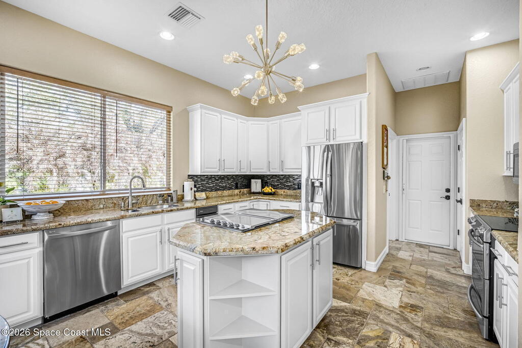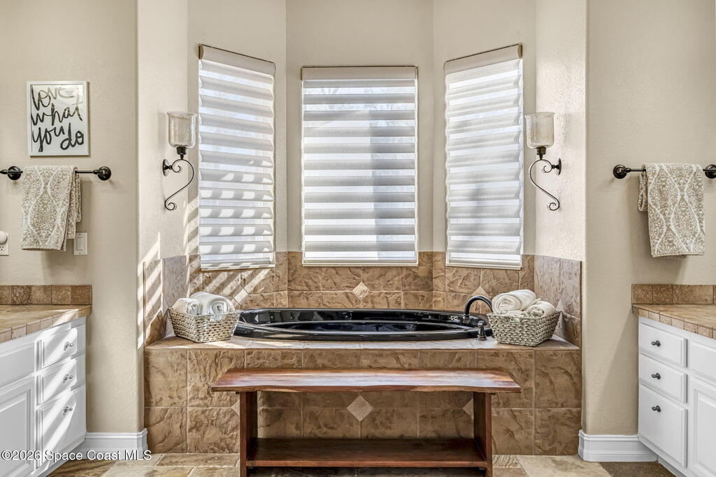 Welcome to this exceptional luxury estate in highly desirable North Merritt Island, offering over two private acres of beautifully maintained, private grounds. This impressive two-story residence features 5 spacious bedrooms, 4 full bathrooms, plus a dedicated office, soaring vaulted ceilings, expansive windows that flood the home with natural light, and custom built-ins that add both character and function. A beautiful fireplace anchors the main living area.The expansive primary retreat is a true sanctuary, offering generous proportions, a spa-inspired bath with a soaking tub, walk-in shower, dual vanities, and an oversized walk-in closet. Step outside to your own resort-style oasis featuring a modern pool and spa, dramatic fire bowl accents, and a fully equipped summer kitchen perfect for hosting unforgettable evenings. The three-car garage with EV charging, hurricane shutters. Lush landscaping, and unmatched privacy complete this rare opportunity to own an estate in Merritt Island.