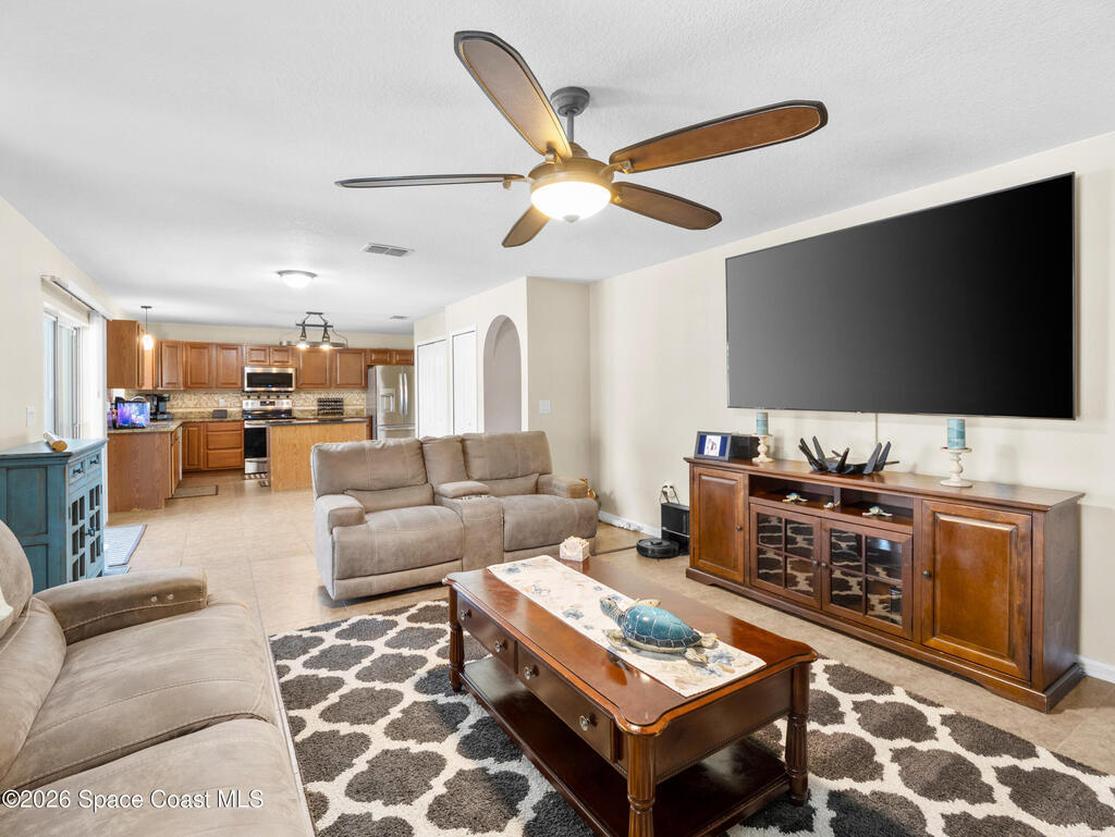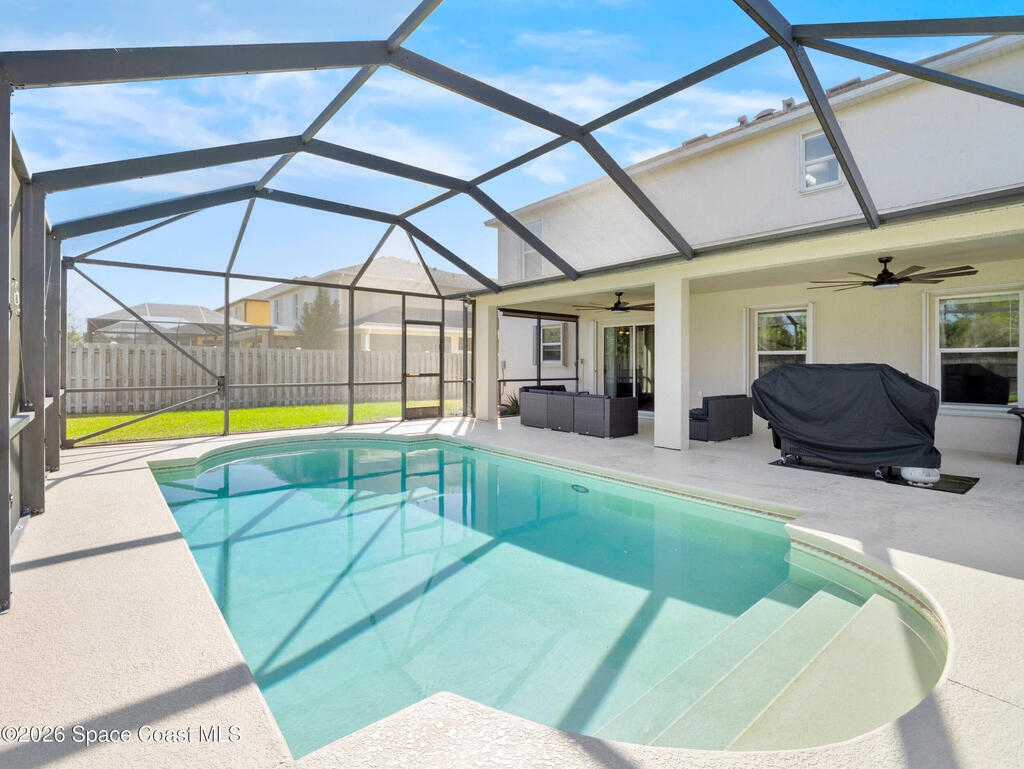 A sophisticated pool home combining elegant design with extensive modern upgrades. The bright, open layout features a spacious great room and a beautifully updated kitchen with new 2023 appliances, generous cabinetry, and refined prep space. Fresh interior paint and tile/laminate flooring create a clean, streamlined backdrop. The split floor plan offers a serene primary suite with an ensuite bath and ample closet space. Premium enhancements include fully fenced in back yard, a new roof (2022), new AC, tankless water heater, RainSoft whole-house system, accordion shutters, keyless entry, security system with 6 cameras, WiFi-enabled outdoor fans, garage door motor with keypad, sprinkler system, all new Artesian well lines, and a WIFI controlled pool pump. The screened-in saltwater pool with a new pump motor elevates outdoor living. Ideally located near premier shopping, dining, parks, schools, and major roadways, this home delivers an upscale and efficient Florida lifestyle.