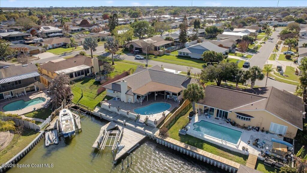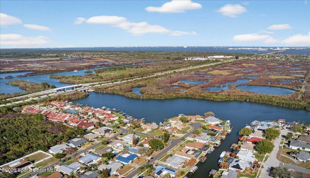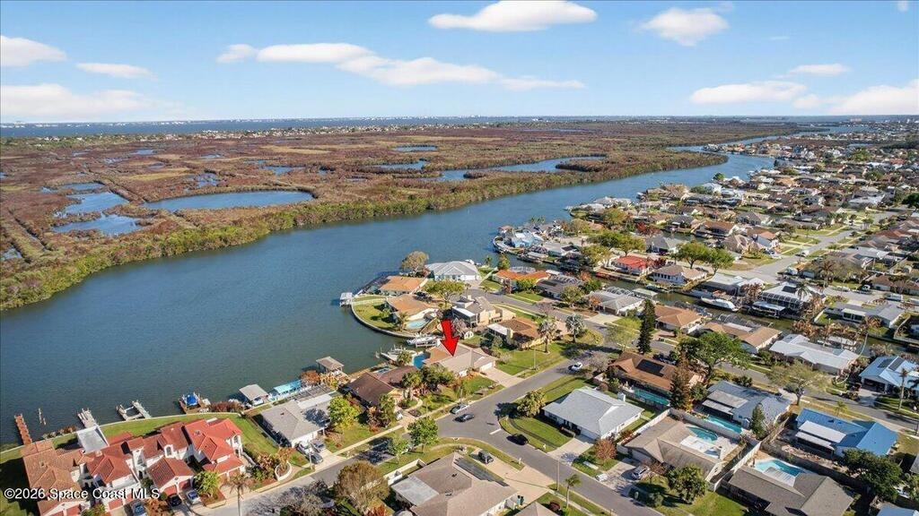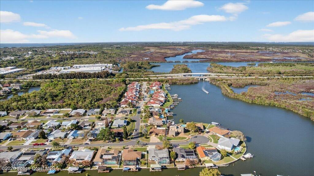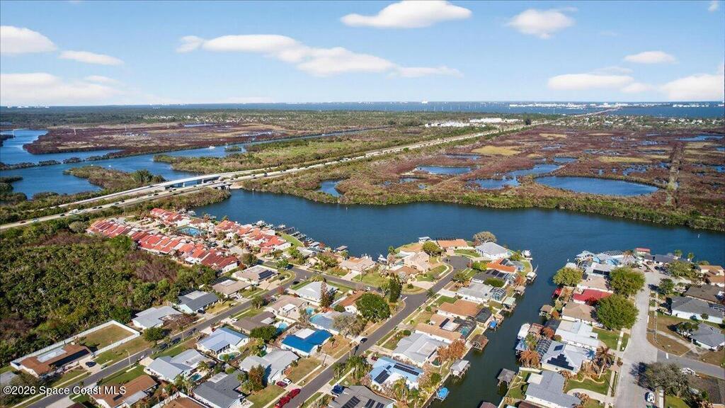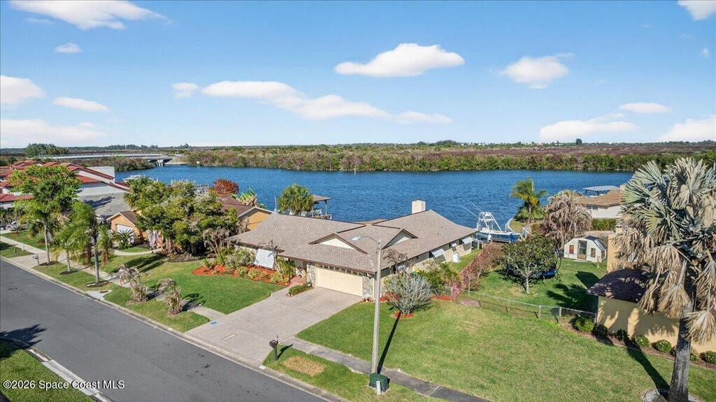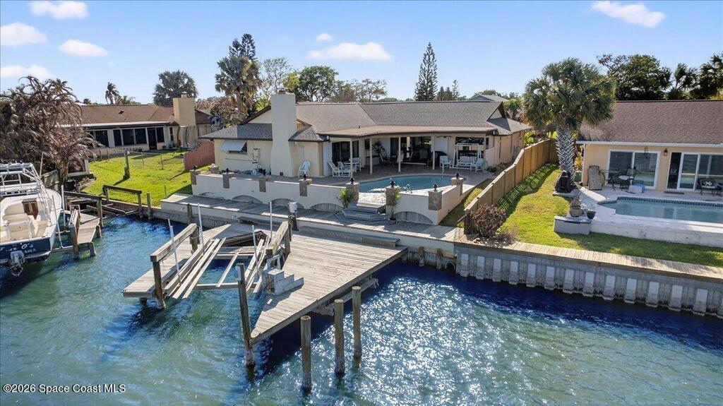 Just in time for Summer Fun! A boater's paradise.DIRECT SYKES CREEK with quick access to Barge Canal, Atlantic Ocean, Banana & Indian River.Centrally located on the Space Coast! Enjoy a front row seat to rocket launches. Boat Dock with lift. Pool with paver deck and covered lanai. Custom built home with thoughtful layout to maximize views of water from most rooms. Many recent updates including roof, HVAC, water heater & pool. The primary suite is adjacent to the 4th bedroom which would make a nice nursery, in-laws suite, or home office. The kitchen is conveniently located between the two living spaces with easy access to serving guest on the lanai. Island with cooktop, bar seating, built in oven, microwave, and pantry. Family room features a stone wood burning fireplace. Guest bedrooms are spacious with nice size closets and built in features. Primary suite with private access to lanai, Bahama shutters on most windows. EZ commute to 528, SpaceX, Blue Origin, Port, NASA, KSC, Beach.