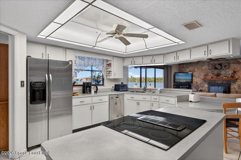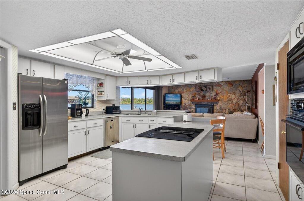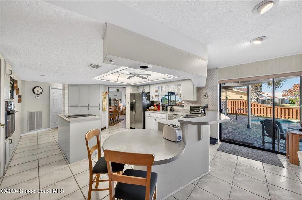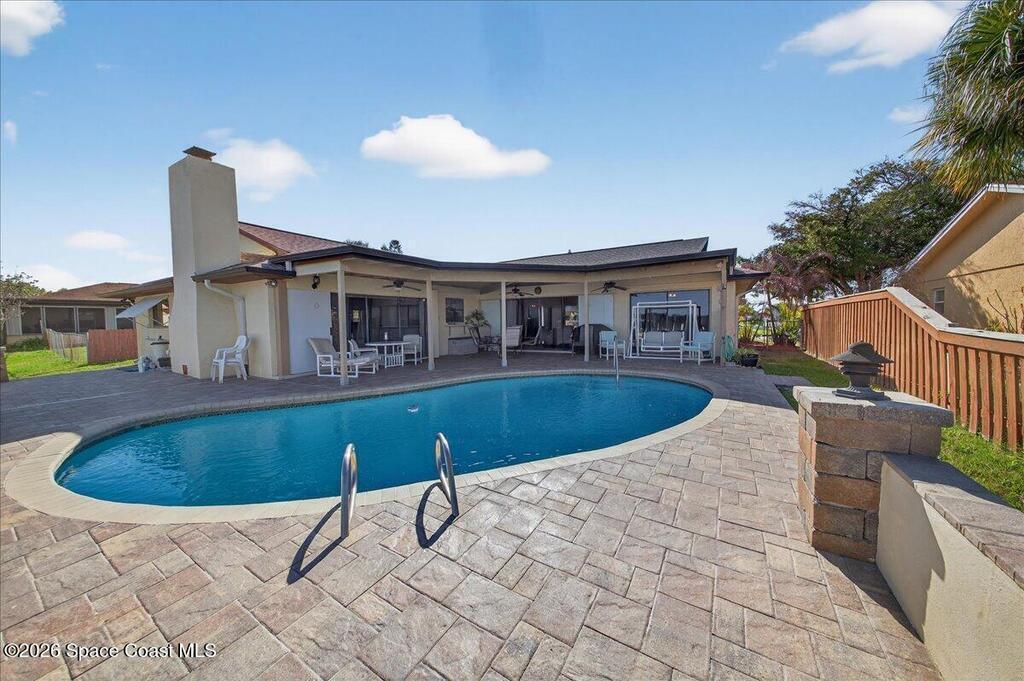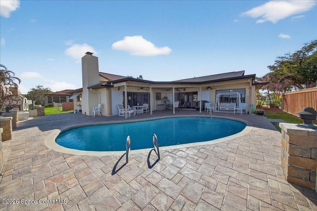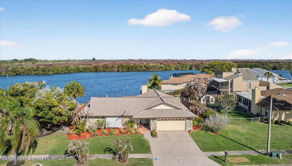Just in time for Summer Fun! A boater's paradise.DIRECT SYKES CREEK with quick access to Barge Canal, Atlantic Ocean, Banana & Indian River.Centrally located on the Space Coast! Enjoy a front row seat to rocket launches. Boat Dock with lift. Pool with paver deck and covered lanai. Custom built home with thoughtful layout to maximize views of water from most rooms. Many recent updates including roof, HVAC, water heater & pool. The primary suite is adjacent to the 4th bedroom which would make a nice nursery, in-laws suite, or home office. The kitchen is conveniently located between the two living spaces with easy access to serving guest on the lanai. Island with cooktop, bar seating, built in oven, microwave, and pantry. Family room features a stone wood burning fireplace. Guest bedrooms are spacious with nice size closets and built in features. Primary suite with private access to lanai, Bahama shutters on most windows. EZ commute to 528, SpaceX, Blue Origin, Port, NASA, KSC, Beach.