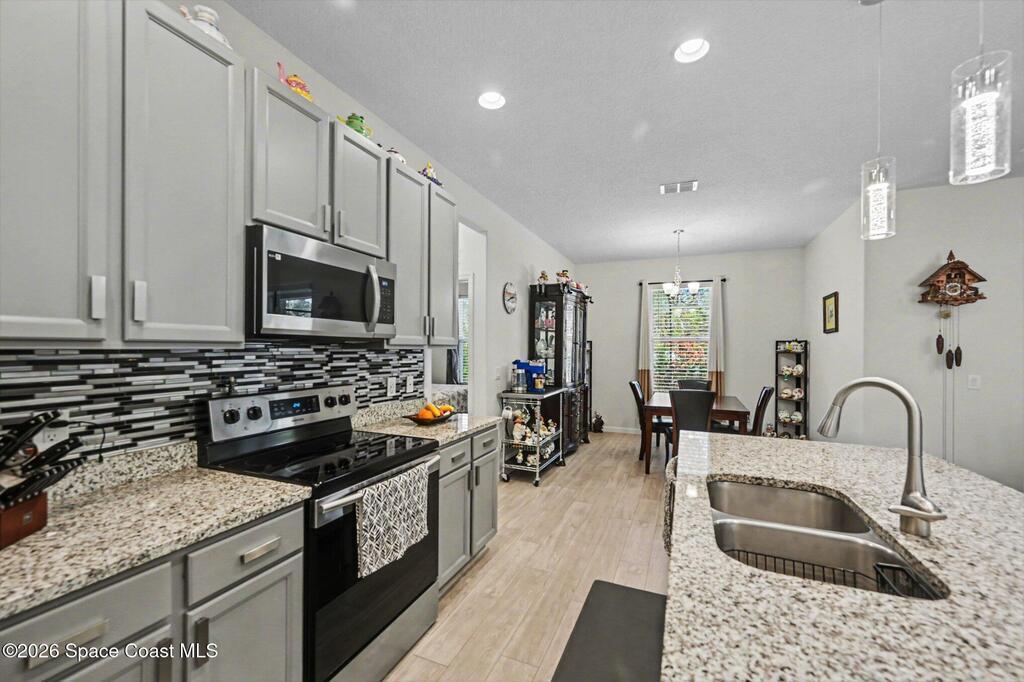 Beautiful Saltwater Pool Home on a Quiet Street! This lovely 3-bedroom, 2-bath home features an open floor plan perfect for comfortable living and entertaining. Throughout the home you'll find wood laminate flooring with no carpet, creating a seamless and low-maintenance living space. The spacious kitchen boasts granite counters, 42inch cabinets, pantry and breakfast bar. The primary suite offers his and her walk-in closets, double sinks, and separate toilet room. Both bathrooms showcase granite countertops and tiled showers for a clean, modern look. Enjoy your private screen-enclosed pool, heated with solar panels for year-round enjoyment. Step outside to a fenced backyard with an irrigation system ideal for gardening and keeping your lawn green year round. This home combines efficiency with convenience, all tucked away on a quiet street with City water, a septic system and hurricane shutters. A must see!