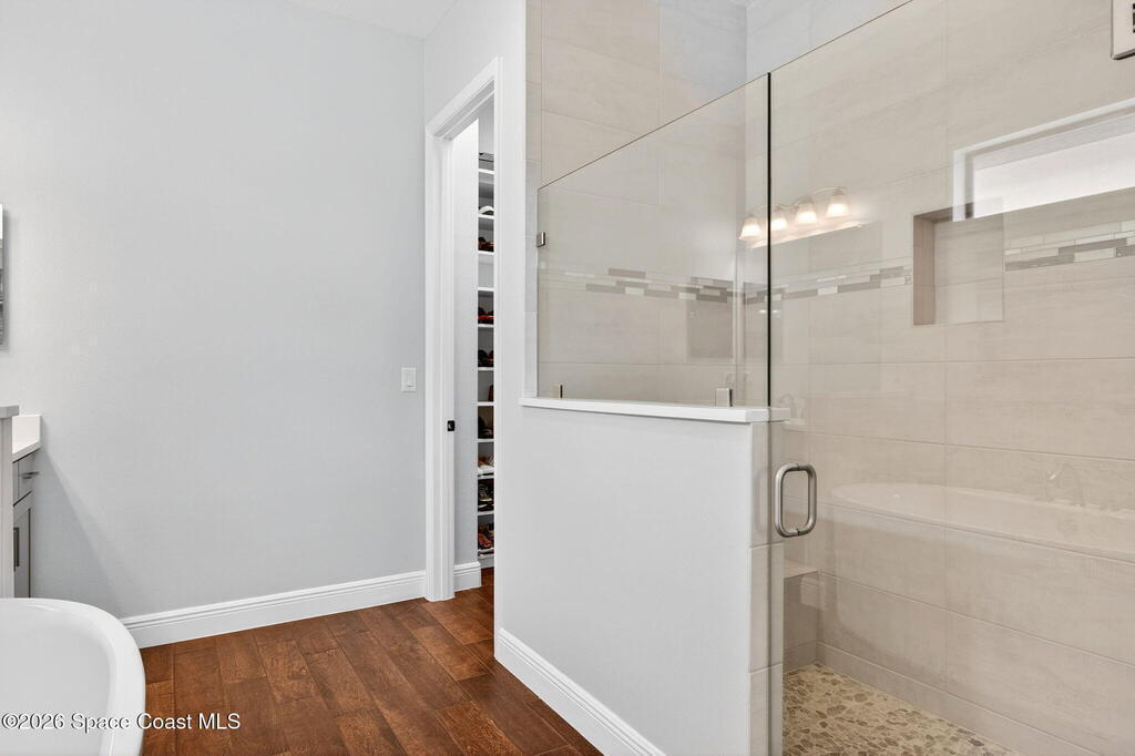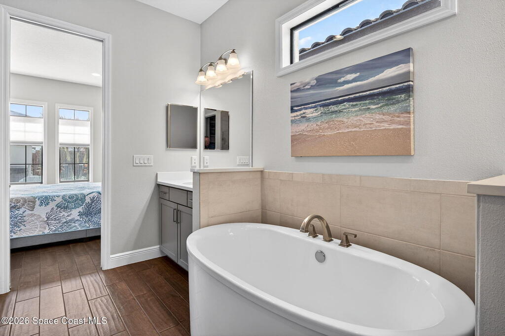 Better than new, see UPGRADE LIST! Thoughtfully designed Almeria II with Bonus room built in 2023. This 2-level courtyard home boasts 4 Bedrooms, 3 Baths, 2 Car + Golf Cart/Workshop Garage & 4086 total square footage. Downstairs master suite & dream bath equipped with double vanities, freestanding tub & enclosed, large shower. The great room w/fireplace, dining room, laundry, guest bedroom & bath are downstairs. 2 bedrooms sharing a bathroom, loft & balcony access are upstairs. All bedrooms include high end closet organizers. The gourmet kitchen delivers with upgraded quartz counters, soft close white shaker cabinets/drawers & premium appliances. Plus, a pot filler, farm style sink & pantry/coffee bar built out to maximize space & use. Big upstairs bonus room serves as a second family room & includes a Murphy Bed. Relax & extend your living space in your courtyard with privacy gates. Level 4 wood-style tile, 8 Ft grey interior doors, tankless water heater & maintenance free living too!