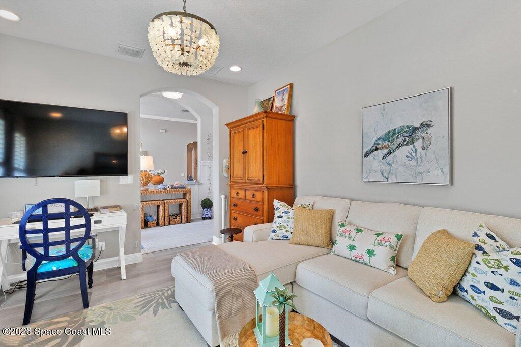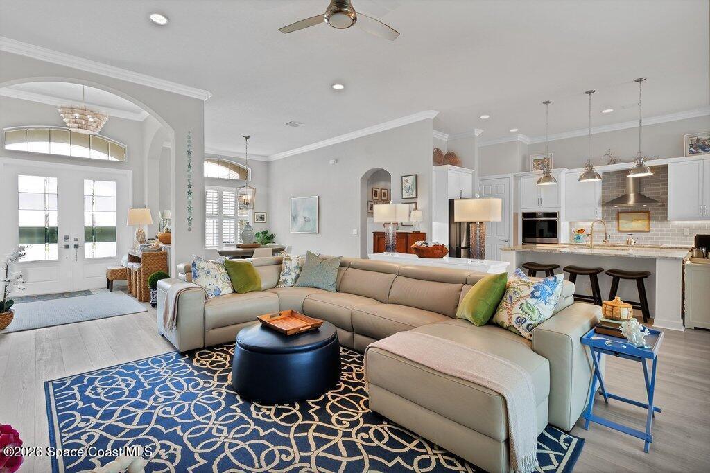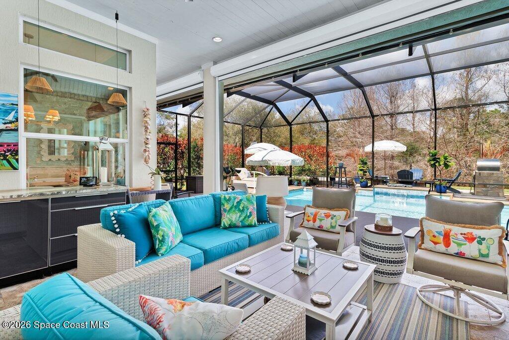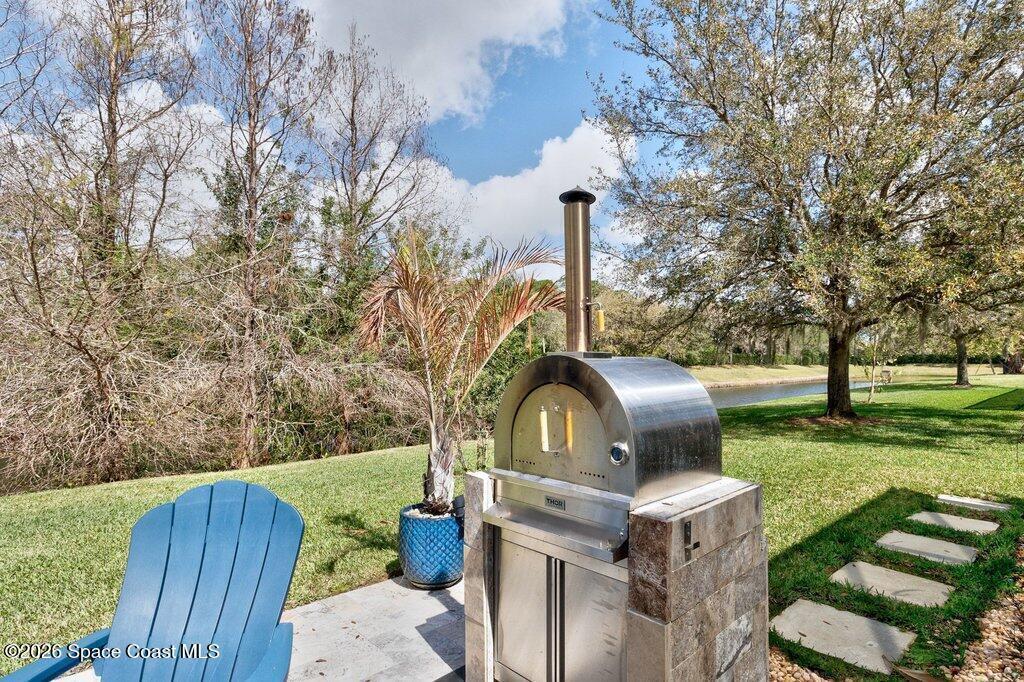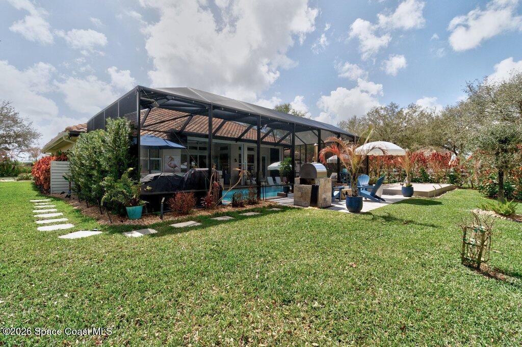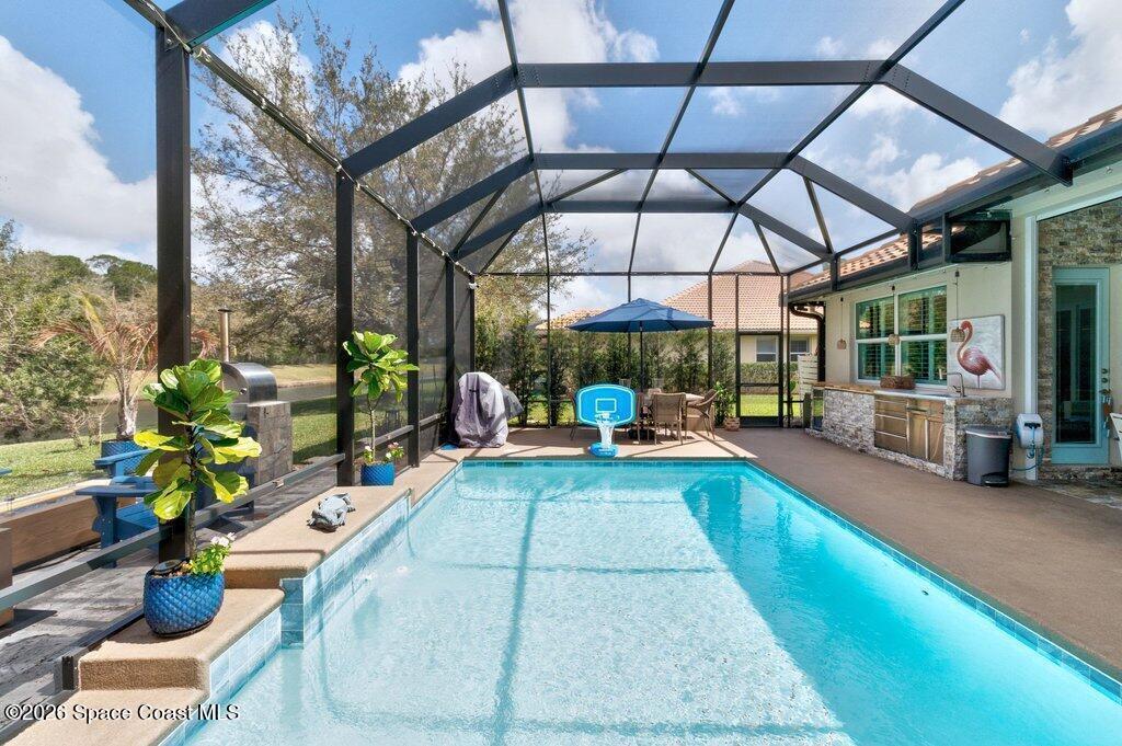 Step into this beautifully appointed 3 Bed, 3 Bath + FLEX home offering 2,522 sq ft of refined living in a thoughtfully designed GHO home. Every detail reflects comfort, craftsmanship & an elevated lifestyle. Beyond the doors, an exclusive private outdoor retreat awaits. The solar-heated saltwater pool is framed by a covered & extended lanai w/ elegant travertine floors, creating a sophisticated setting for relaxing or entertaining. An outdoor kitchen & authentic outdoor pizza oven make hosting effortless. Set on .34 acres of beautifully curated grounds, the property continues to impress with a private bocce ball court, extended paver driveway, covered front entry and a 2.5-car garage w/epoxy floors. Check out the catch and release fishing pond. Upscale landscaping enhances the sense of privacy and exclusivity throughout. This is more than a home--it's a distinctive lifestyle property designed for those who appreciate quality, privacy & resort-style living.