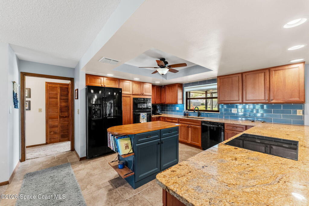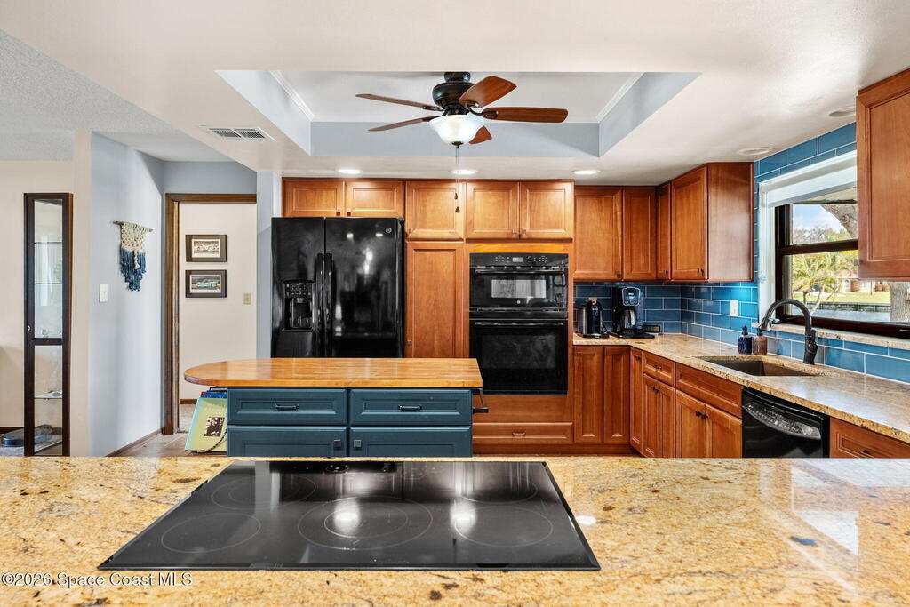 Lake days hit different when your backyard is .44 acres of open sky & shimmering water. Step through a screened entry & Arts & Crafts glass double doors into a wide-open layout that feels fresh, current & full of light. A stacked stone wood-burning fireplace brings warmth & texture, while newer double-paned insulated windows (2023) & oversized sliders frame the pool & lake beyond. Outside, a screened lanai, cool-deck flooring & a solar-heated pool with tiered sun shelves create a setting that's equal parts laid-back & unforgettable. The island kitchen brings personality with butcher block counters & island, a granite peninsula, rich wood cabinetry, wall oven & microwave, cooktop & a blue subway tile backsplash that pops (kitchen & interior remodel 2018). The primary suite opens to the pool, features a cedar-lined walk-in closet & a bath with double sinks, tiled jetted tub & separate shower.