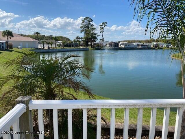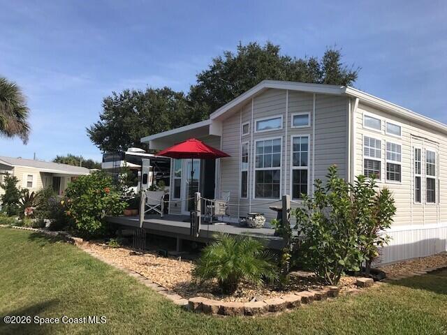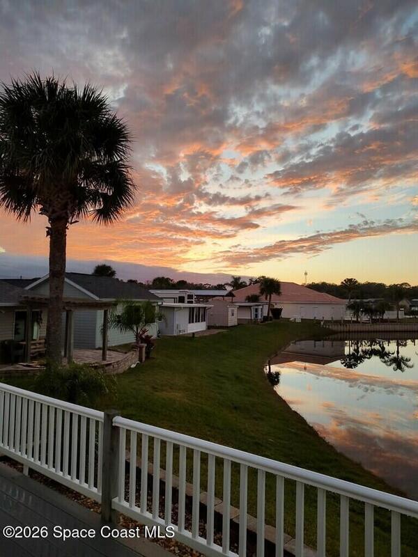 Fully upgraded and modern park model with bonus room and extra half bath, covered parking and composite deck overlooking the lake! Shows like new, AC in 2025, and furnishings included to make it easy to start enjoying as your winter retreat or full time residence. Extra pavers provide additional parking. There is room under the covered parking for a class B motorhome or your vehicle. New landscaping and located on dead end street. This active 55+ community has clubhouse, heated pool, newly surfaced pickleball/tennis and activities. Executive golf course on property and watch rocket launches from your from yard! Close to airports, beaches, theme parks, shopping and restaurants.