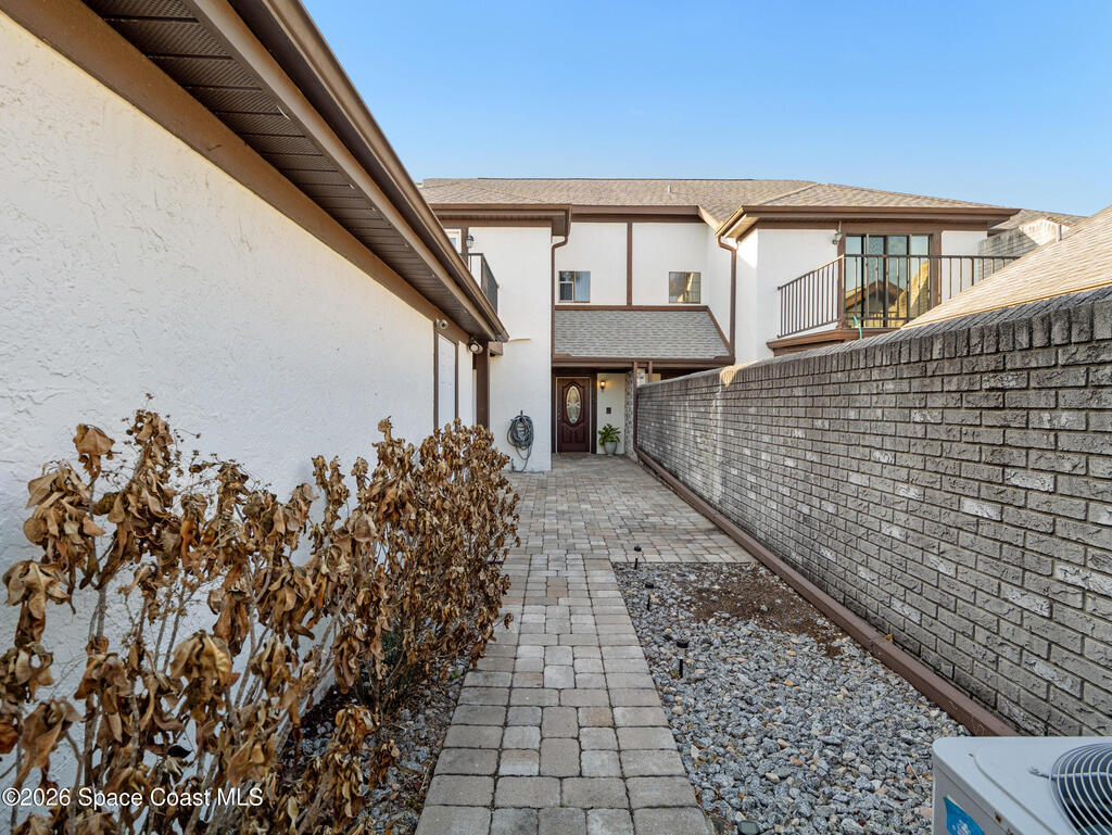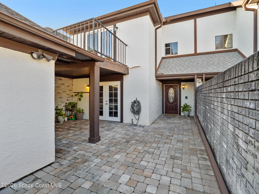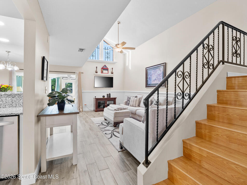 Beautifully maintained 3-bedroom, 3-bathroom townhome located in a quiet community with a peaceful park-like setting. This home features a private courtyard entrance and a spacious living area highlighted by a stunning staircase that creates an elegant focal point in the living room. The floorplan includes one bedroom and full bathroom on the 1st floor, perfect for guess or flexible living arrangements. The primary suite features a private balcony overlooking a well-maintained green space, offering a peaceful place to relax. a bright Florida room, or flex space provides additional living space perfect for enjoying natural light year-round. This home provides easy access to I-95, Orlando Airport, Port Canaveral, and the beautiful Space Coast beaches, along with nearby shopping, dining and entertainment. A wonderful combination of comfort, convenience, and location. Don't miss this opportunity to enjoy Space Coast living in a tranquil and well-maintained community.