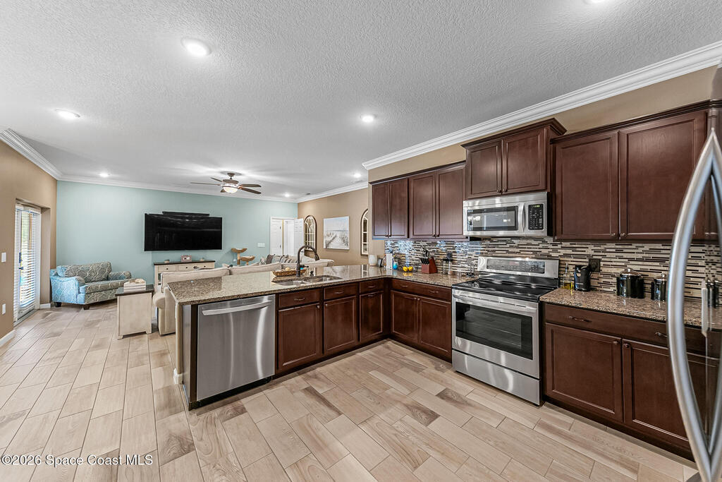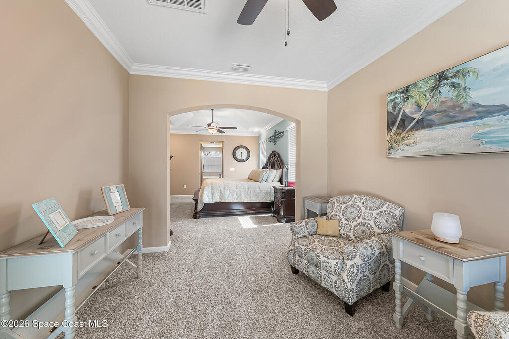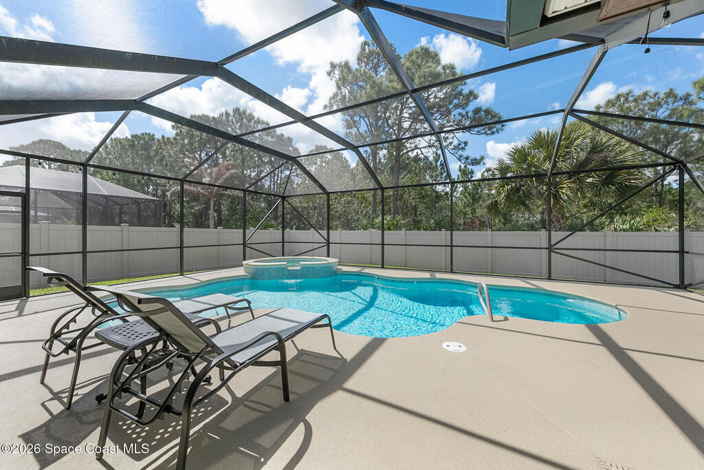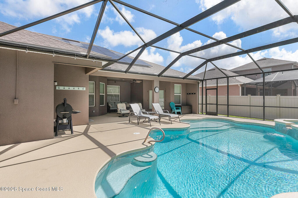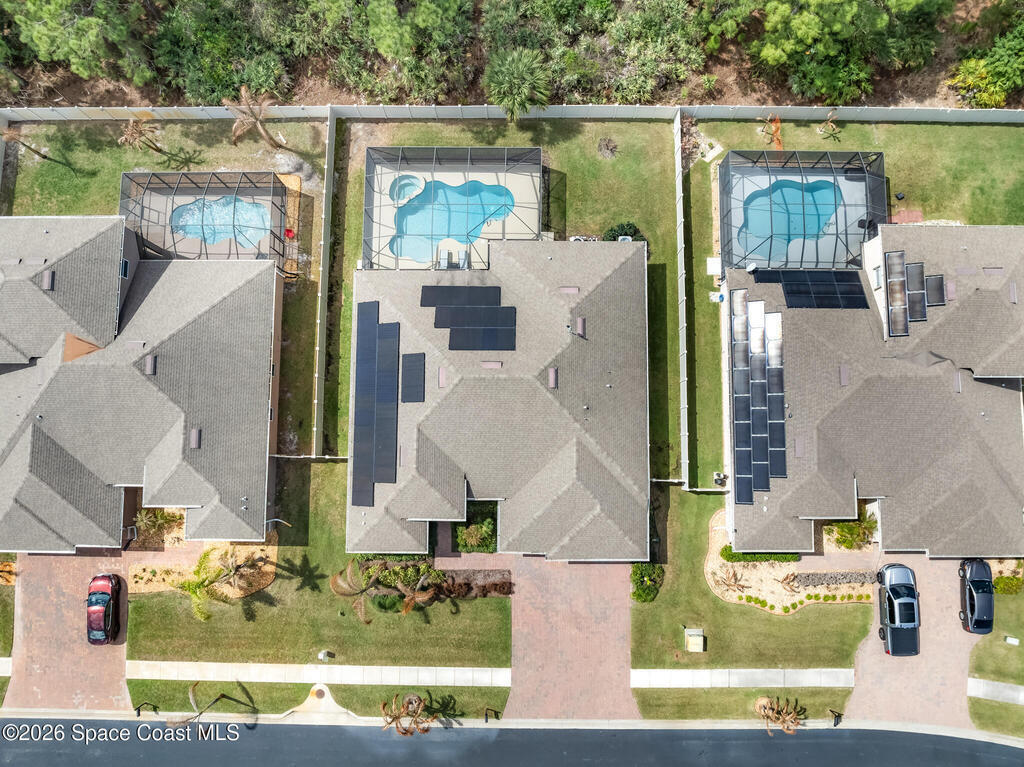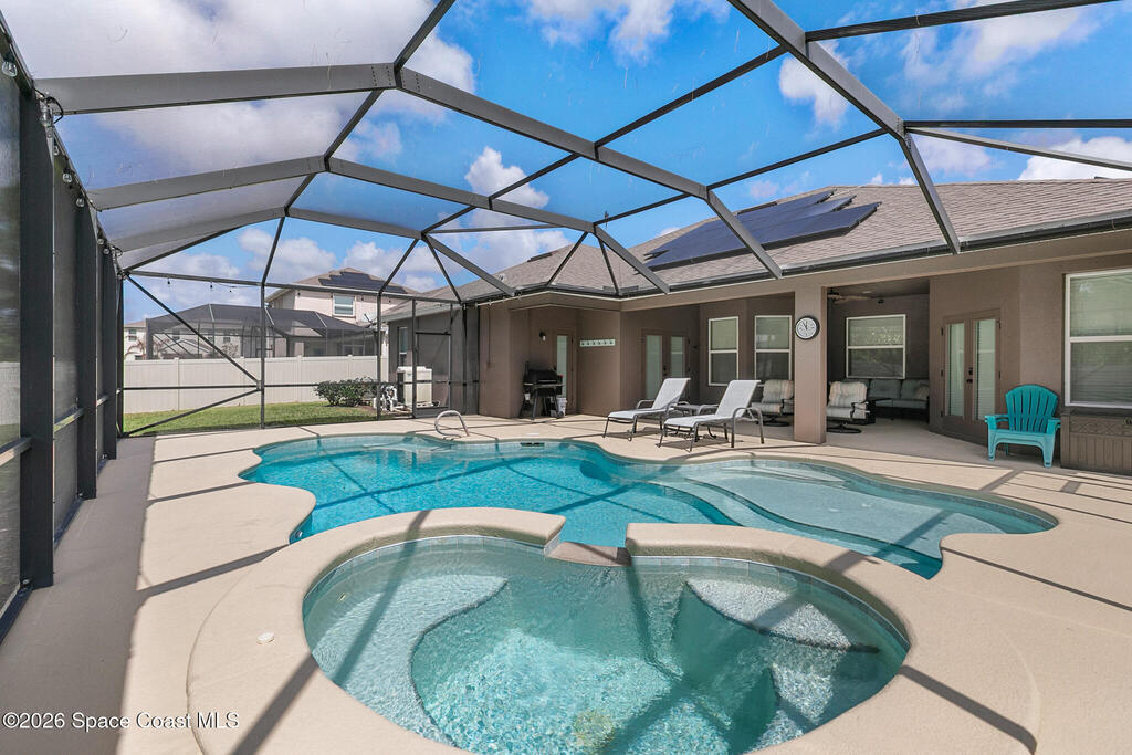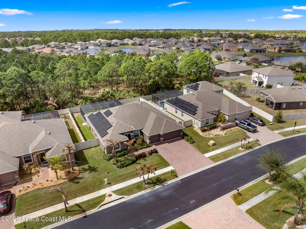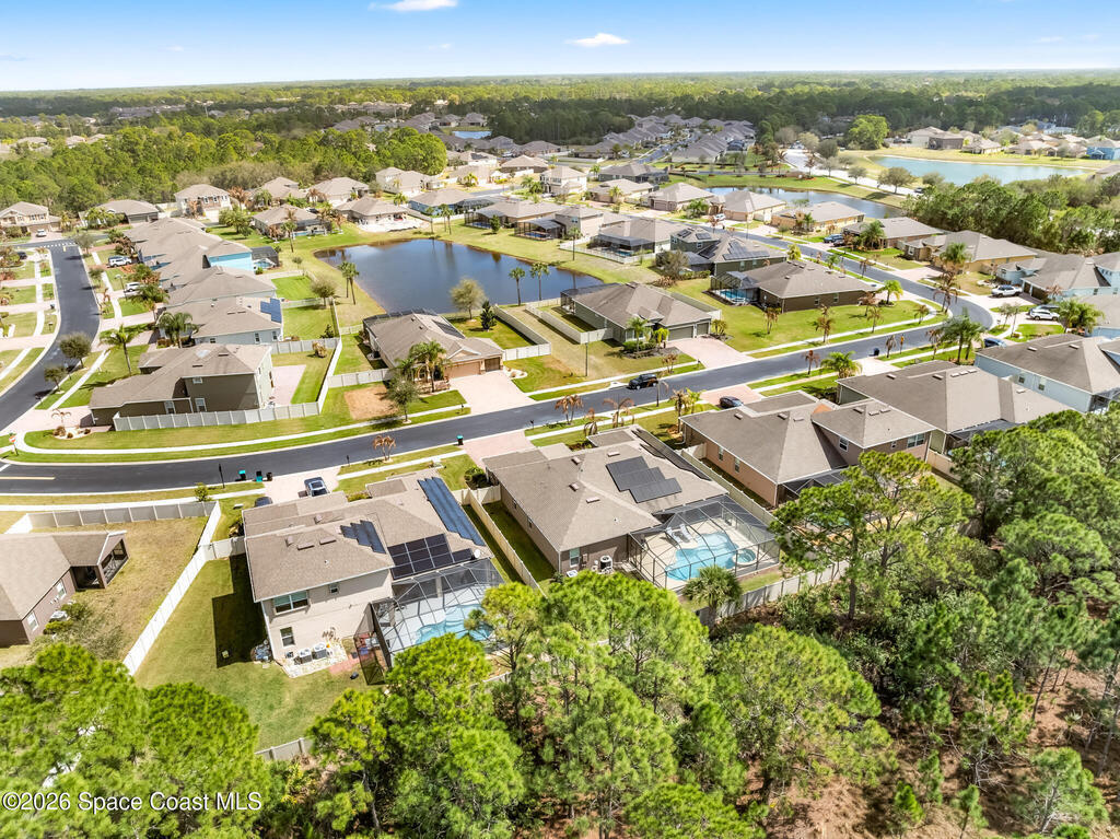 Like-new beautiful 4-bedroom, 3-bath home with a 3-car garage in the desirable Bayside Lakes Stonebriar community backing to a peaceful preserve. This spacious floor plan includes a sitting room and dedicated office, offering flexibility for work or relaxation. The kitchen opens to the main living area and all kitchen appliances remain. Interior features include crown moulding in the living areas, office, and primary bedroom, cordless blinds, ceiling fans, new carpet, fresh interior paint, and a smart thermostat. Enjoy outdoor living with a screened pool and spa with heat pump and a freshly painted pool patio. The property also features a paver driveway, vinyl fencing, fresh exterior paint, and new exterior door hardware. Additional upgrades include an 8-camera digital video system, electronic deadbolts, city water and sewer, and a dedicated sprinkler well and pump. Energy-efficient 12kW solar system with two Tesla batteries provides added efficiency and backup power.