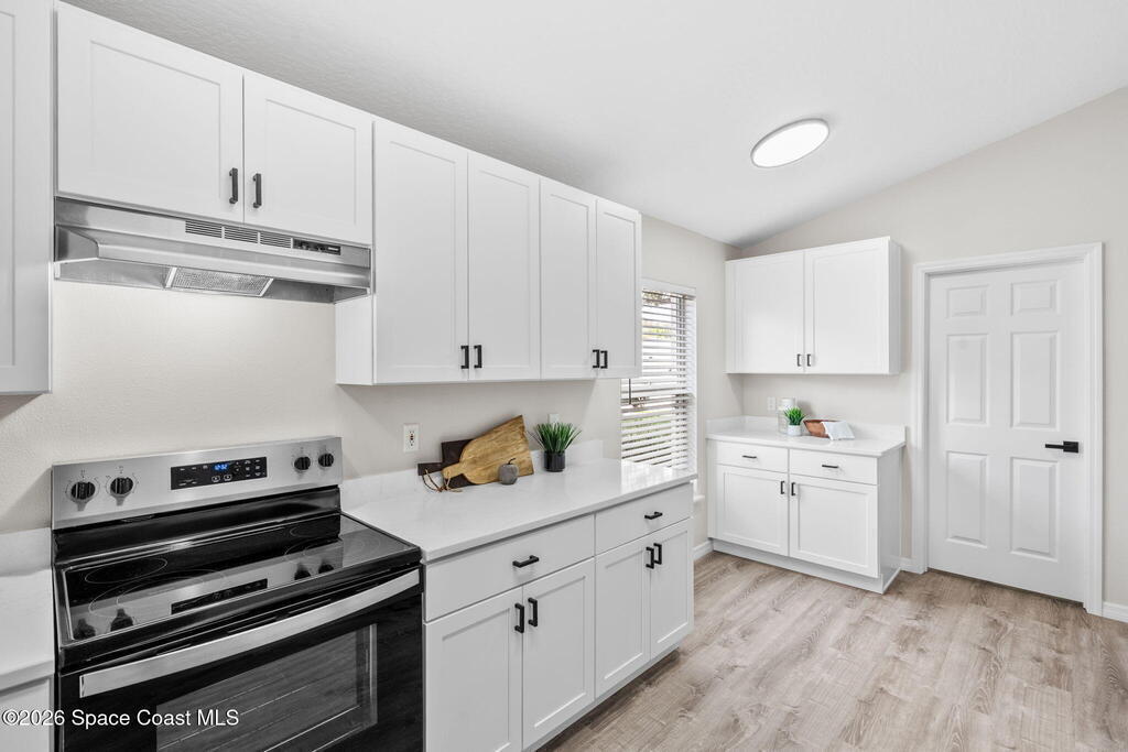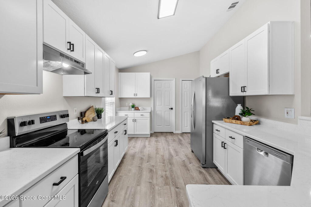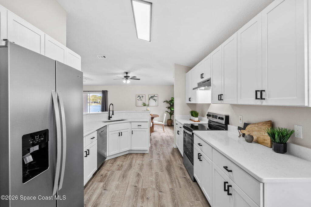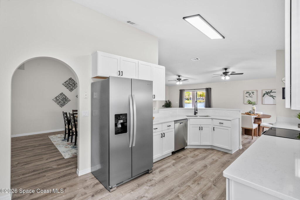 Completely renovated and move in ready, this lakefront home in Meadow Lake offers modern finishes, open living space, and beautiful water views. This gorgeous 3 bed, 2 bath home with a 2 car garage offers 1,903 sq ft and one of the best lake views in the neighborhood. Inside, everything is brand new including LifeProof waterproof luxury vinyl plank flooring, fresh interior paint, and a stunning kitchen that has never been used. The kitchen features quartz countertops, soft close shaker cabinets, Whirlpool stainless steel appliances, and a custom coffee bar. The open and versatile layout provides space for living, dining, an eat in kitchen, and a flexible area for an office, library, or play space. Both bathrooms are beautifully updated with modern vanities, mirrors, and lighting. Enjoy peaceful lake views. sunsets and rocket launches from the covered and screened patio plus an additional outdoor patio ready for grilling or relaxing. Fresh sod, Community pool, Summer is almost here!