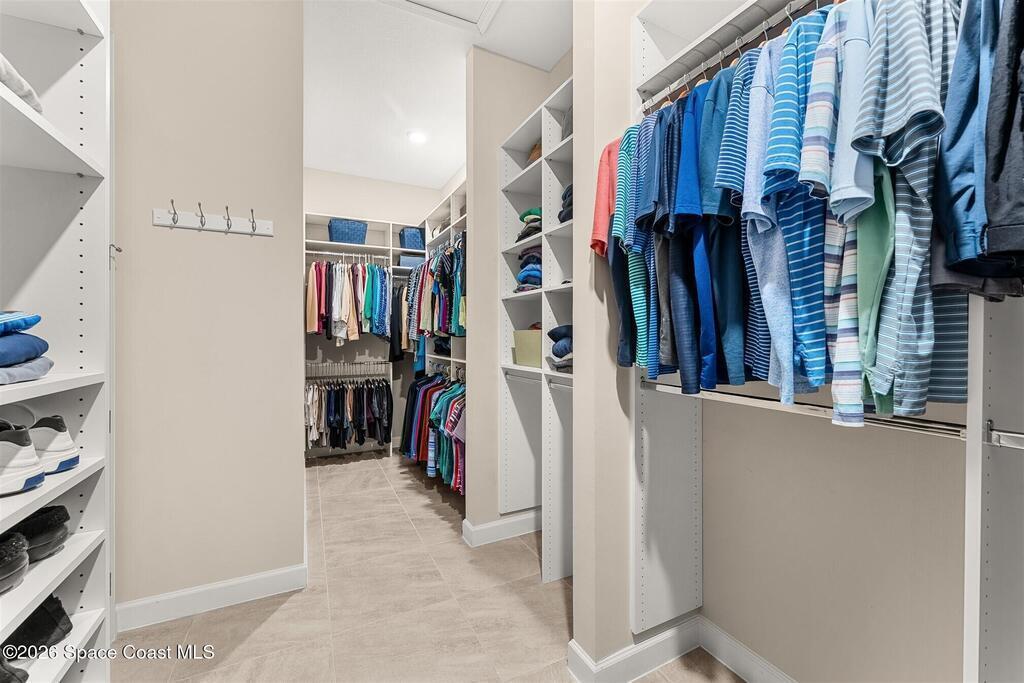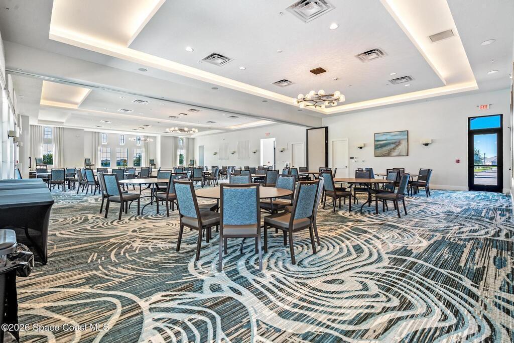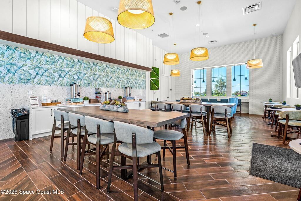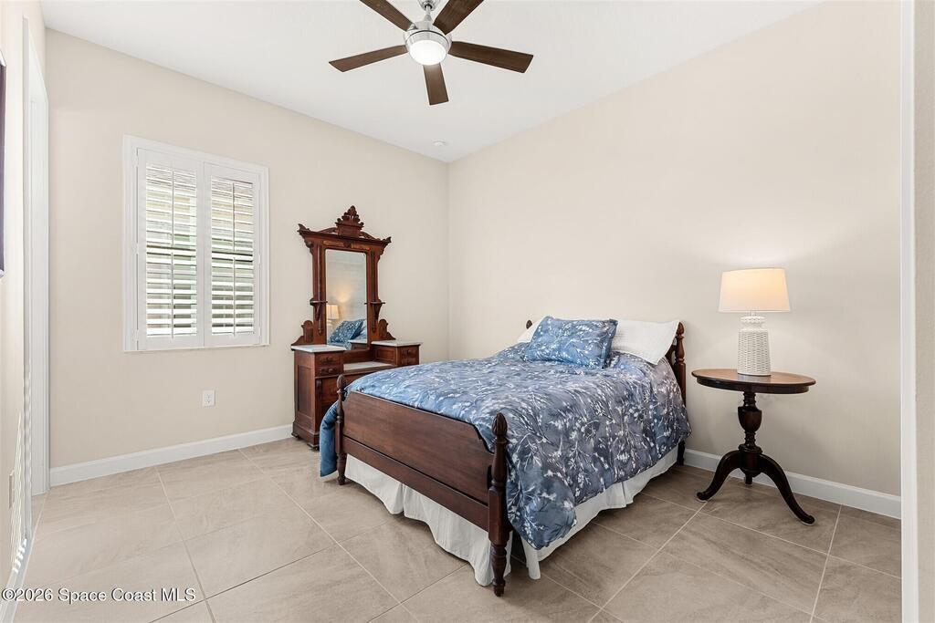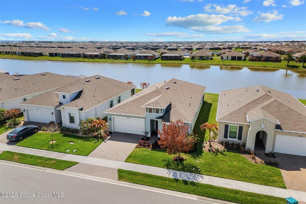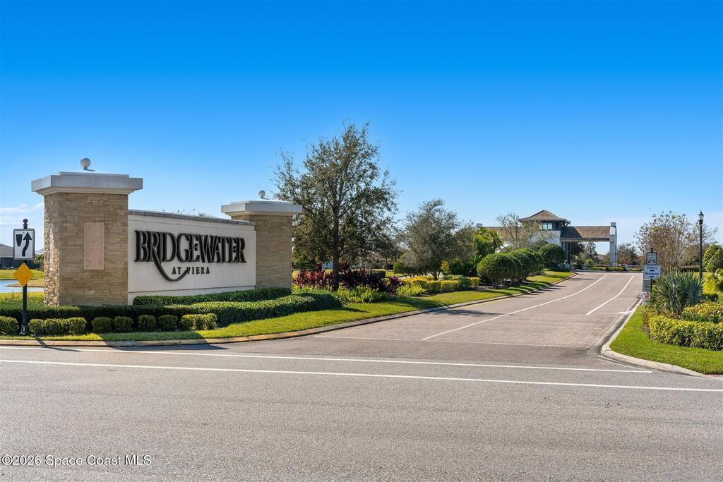 Enjoy waterfront views from this airy 3-bedroom, 4-bath home in the gated 55+ community Bridgewater at Viera. A den/flex room with double doors and closet can easily serve as a fourth bedroom. The kitchen features quartz countertops, stainless steel appliances, and an oversized island that opens to the main living area. Triple sliding glass doors fill the home with natural light and lead to a screened lanai overlooking the water--perfect for enjoying both sunrise and sunset. Interior highlights include ceramic tile flooring, plantation shutters, crown molding, recessed LED lighting, upgraded fixtures, and a laundry room with sink and built-in cabinets. The primary suite offers a custom walk-in closet, zero-entry shower, and dual vanities. Guest bedrooms include custom closets and en-suite baths, one with a walk-in Jacuzzi tub. Resort-style amenities include heated pool, fitness center, tennis, pickleball, bocce, billiards, movie theater. HOA includes lawn care, garbage, gated security.