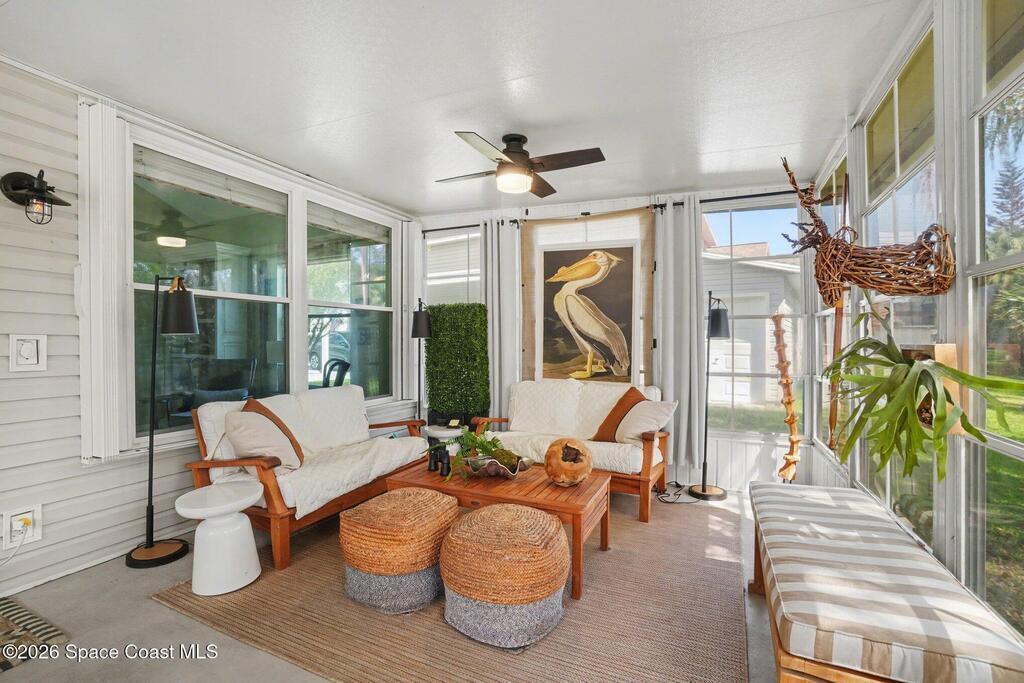 Enjoy resort-style living in this spacious home located in The Great Outdoors Premier RV / Golf Resort in Titusville. This property features a large RV port, generous living space, and a versatile loft area--perfect for guests or additional storage. An attached golf cart garage adds extra convenience for getting around the community. Offered furnished, the home showcases complete cosmetic upgrades along with a newer A/C unit (2020), water treatment system, and an electric car charger. A perfect opportunity to settle in and start enjoying the Florida resort lifestyle.