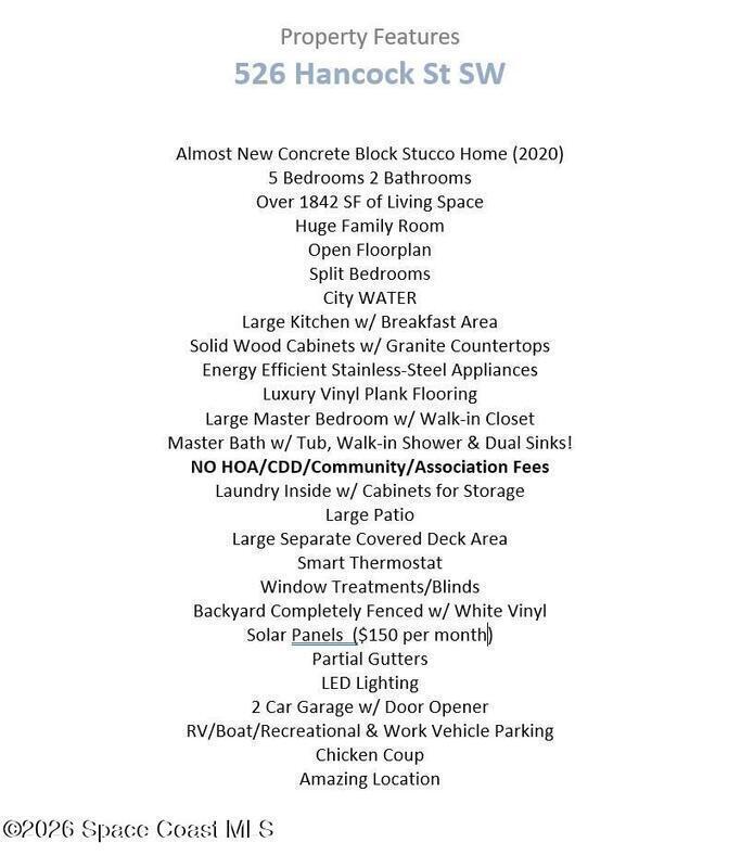 New Owner Wanted! Almost New Concrete Block Stucco Home (2020)! 5 Bedrooms 2 Bathrooms! Over 1842 SF of Living Space! Huge Family Room! Open Floorplan! Split Bedrooms! City WATER! Large Kitchen w/ Breakfast Area! Solid Wood Cabinets w/ Granite Countertops! Energy Efficient Stainless-Steel Appliances! Luxury Vinyl Plank Flooring! Large Master Bedroom w/ Walk-in Closet! Master Bath w/ Tub, Walk-in Shower & Dual Sinks! NO HOA/CDD/Community/Association Fees! Laundry Inside w/ Cabinets for Storage! Large Patio! Large Separate Covered Deck Area! Smart Thermostat! Window Treatments/Blinds! Backyard Completely Fenced w/ White Vinyl! Solar Panels ($150 per month)! Partial Gutters! LED Lighting! 2 Car Garage w/ Door Opener! RV/Boat/Recreational & Work Vehicle Parking! Chicken Coup! Amazing Location!