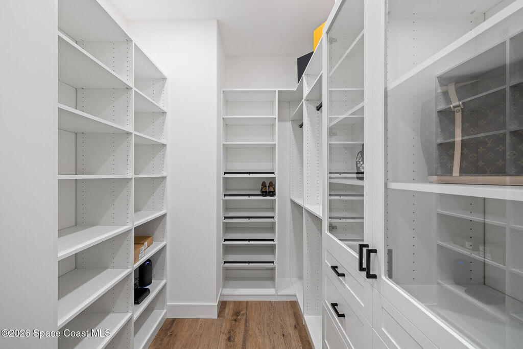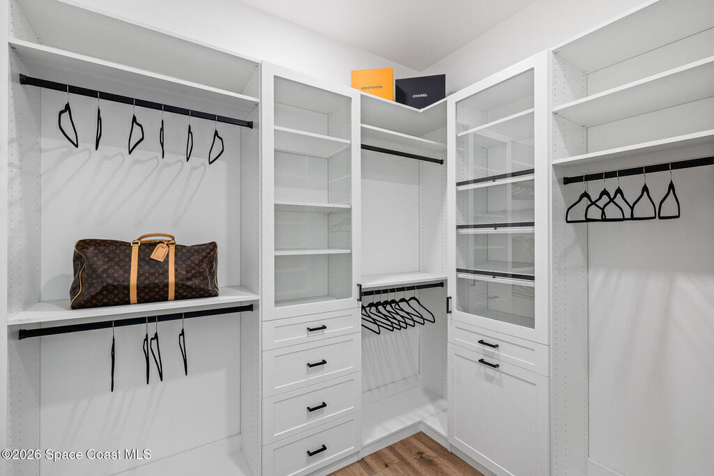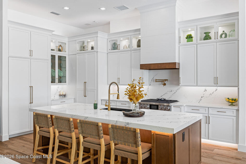 Elegant Custom Built Brand New 5 Bed, 3.5 Bath, 3 Car Home featuring an open floor plan, home office, ensuite, 10' tall sliding glass doors, Impact glass windows, Plantation shutters, large kitchen island, built in appliances, wine fridge, walk in pantry, laundry room with wall to wall storage, central vaccum system, air conditioned garage, whole home generator prewire, indoor electric fireplace, breakfast nook, summer kitchen, pool, gas buring fireplace w/ TV above on rear patio, heated inground spa, fenced rear yard overlooking a large body of water.