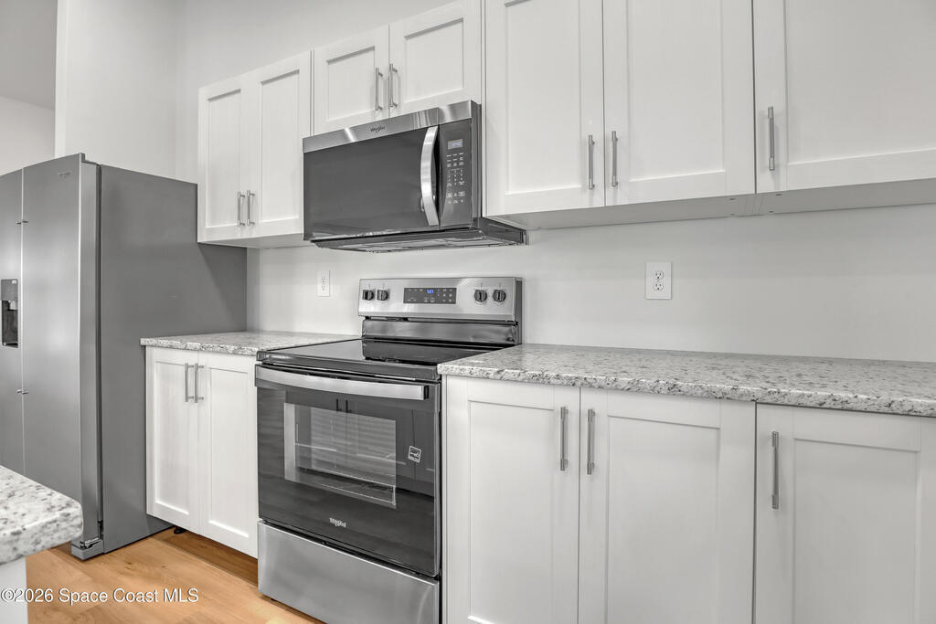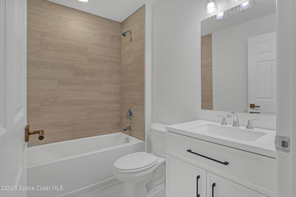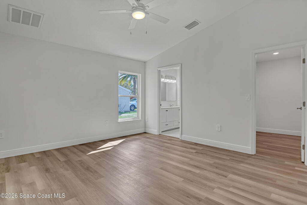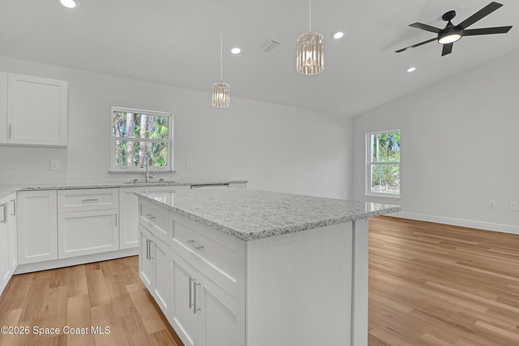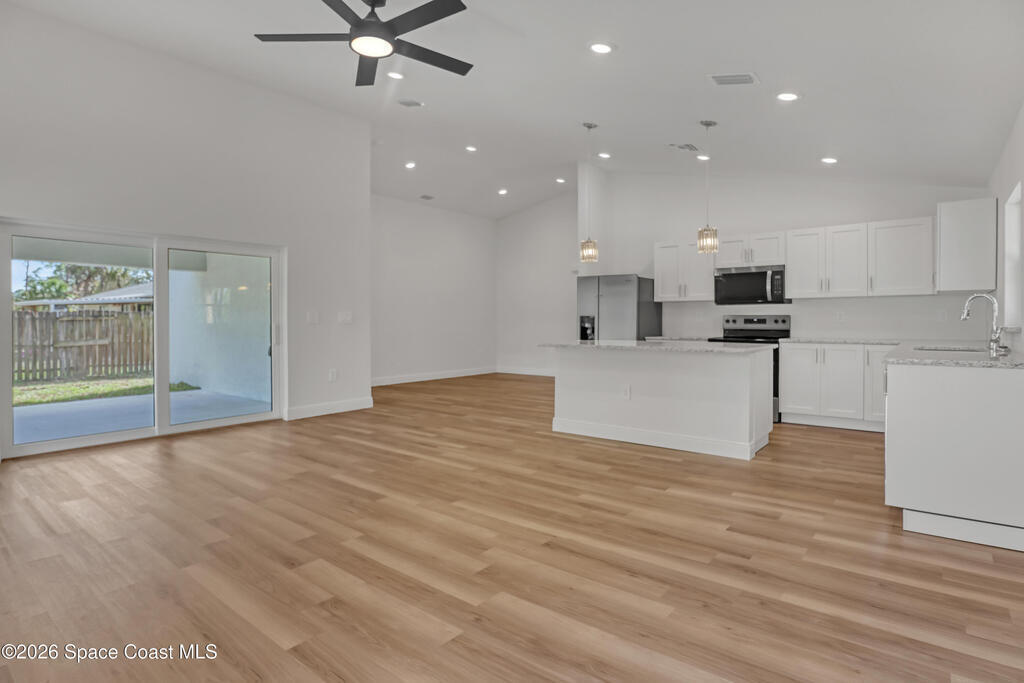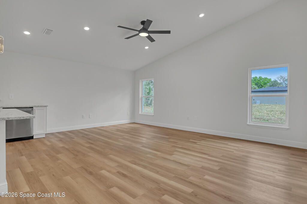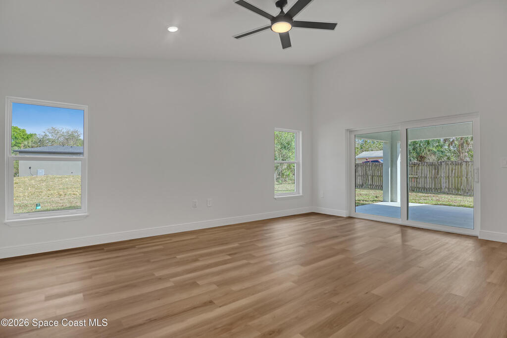 Construction Completed - New construction home with hurricane impact windows and doors and a full home water treatment system already installed. This 3 bedroom, 2 bathroom home offers 1,632 square feet under air with high cathedral ceilings that create a bright and open living space. The kitchen features granite countertops, stainless steel appliances, and luxury vinyl plank flooring throughout the home. Oversized bedrooms provide comfortable living, and the dedicated laundry room includes a washer and dryer. Enjoy the large covered rear porch and the convenience of a two car garage. Located in Palm Bay and built by a local builder, offering the peace of mind that comes from quality construction and attention to detail.