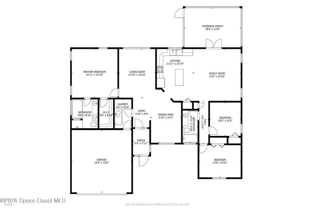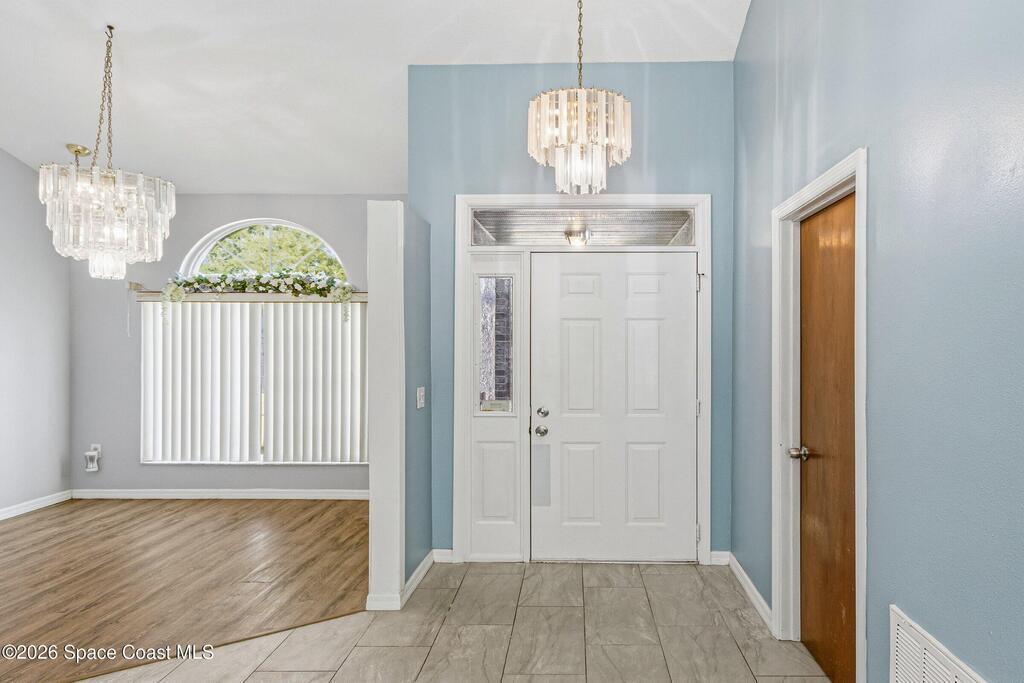 Welcome to this beautifully updated 1,700 sq. ft. home with an open floor plan and generous living spaces. Conveniently located just 15 minutes from historic Cocoa Village, 20 minutes from the beaches, and 45 minutes from Orlando's International Drive. This home has been thoughtfully improved with a 2019 roof, 2023 A/C, and 2024 water heater. The kitchen was fully updated in 2024 with new cabinets, appliances, and a stylish center island. New flooring enhances the foyer, kitchen, bathroom, and living room, while newer window treatments add a polished touch to the kitchen and living area. The guest bath was upgraded in 2024 with new cabinetry and countertops. The primary bath includes updated plumbing, an updated shower, a new bidet, double sinks, and a relaxing garden tub. Additional features include a new water softener system, new back porch screening, and a doorbell camera. Step outside to a backyard filled with fruit trees and plants, including loquat, mango, mandarin, lemon,