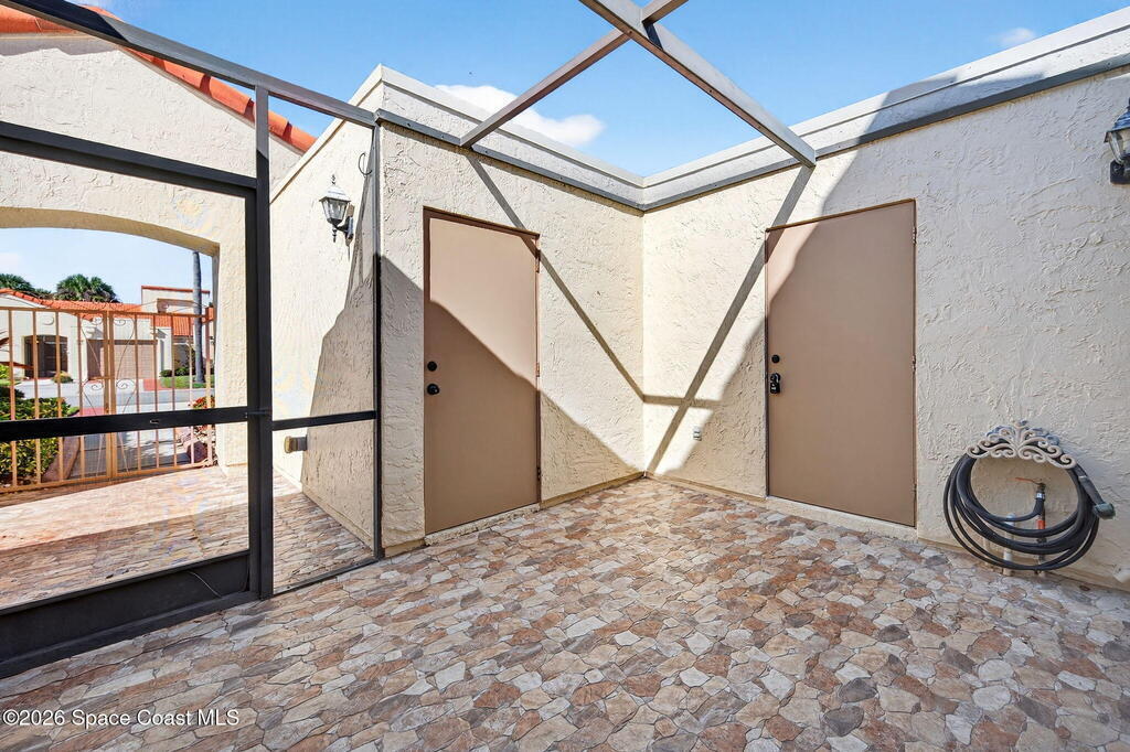 Beautifully maintained ONE-Story villa in the heart of Suntree! This light and bright 2-bedroom, 2-bath home with a 1-car garage is truly Move-In Ready! Featuring gorgeous tile flooring throughout, IMPACT WINDOWS and a spacious open living area offering both comfort and style. Enjoy an updated primary suite with double vanities, walk in shower and large walk in closet. Abundant natural light in every room. A/C 2020. Water Heater 2025. Step outside to your private screened-in courtyard -- perfect for relaxing or entertaining. Tucked away on a quiet cul-de-sac street with a short walk to the amenities area, this home offers peaceful living. Community pool, tennis courts & more. Close to golf, walking paths, shopping, Patrick Space Force Base and all major roadways. Just a short drive to the BEACH. SEE IT TODAY!