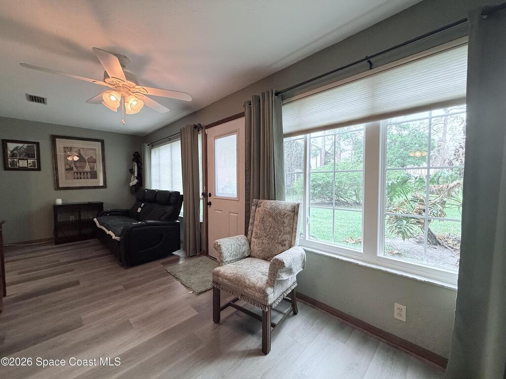 LIGHT, BRIGHT, and beautifully updated ground-floor end unit in the prestigious gated, all-ages community of Greenwood Manor in West Melbourne! Tucked away in a quiet location at the back of the complex, this home offers a peaceful, park-like view from the sunroom and patio. Upgrades include newer impact windows, power shades, stainless steel appliances and fixtures, laminate flooring and a relaxing jetted tub. The interior is recently painted. Enjoy the convenience of a private one-car garage plus a spacious storage room. Community amenities feature a heated pool, clubhouse with library, fitness center, billiards room, and meeting/card room. Ideally located with quick access to I-95, major shopping, Northrop Grumman, L3Harris, Melbourne-Orlando International Airport, hospitals, the Intracoastal Waterway, and nearby beaches. The condo fee covers exterior maintenance, cable TV, DVR, internet, pest control, and more.