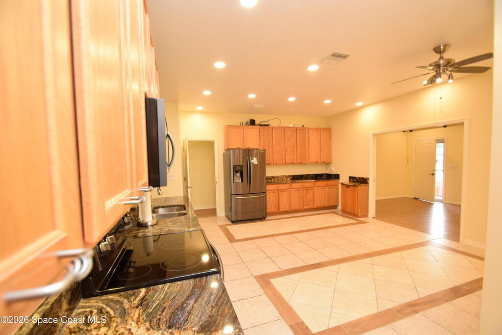 Welcome home to this exceptional custom-built residence featuring a unique and versatile floor plan designed for comfort, functionality, and entertainment. Nestled on a serene oversized double lot just under one acre, this property offers privacy, space, and incredible amenities both inside and out. The thoughtfully designed layout includes a flexible in-law suite with private entrance and kitchenette, complete with its own bedroom and living area--perfect for multi-generational living, guests, or easily utilized as a fourth bedroom. Upon entering the home, a front entry room with elegant double pocket doors creates the perfect space for a private office or den. The open-concept design flows seamlessly into the spacious kitchen featuring tile flooring, granite countertops, and beautiful wood cabinetry, with plenty of room to add a large island if desired. A cozy kitchen nook space is available along with a step-up breakfast bat that overlooks the main living space, creating a warm and
