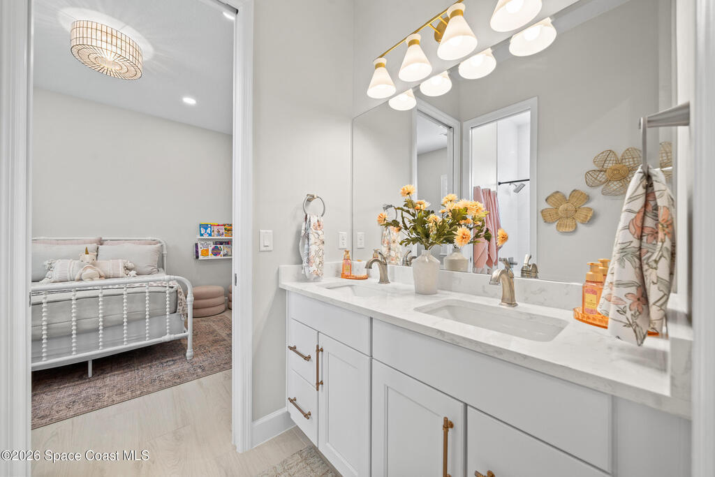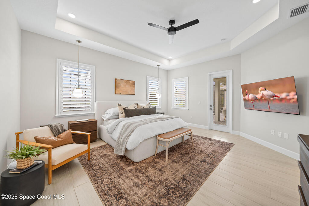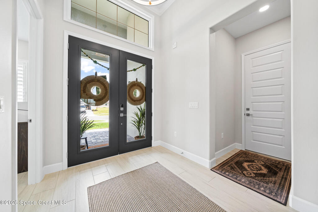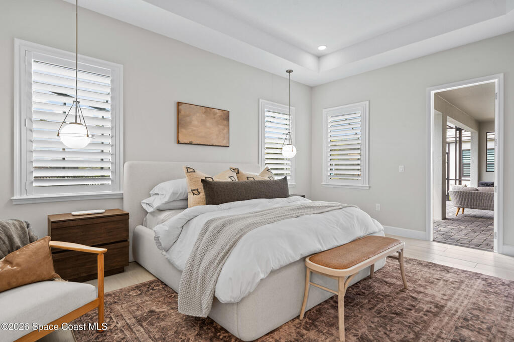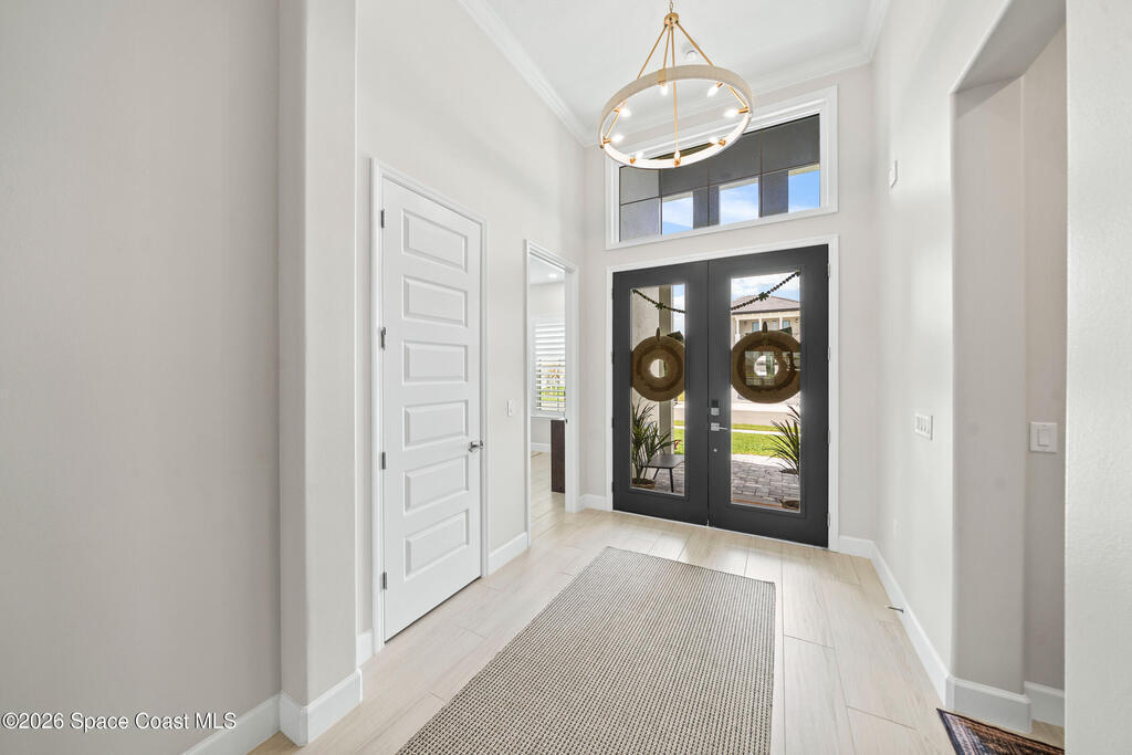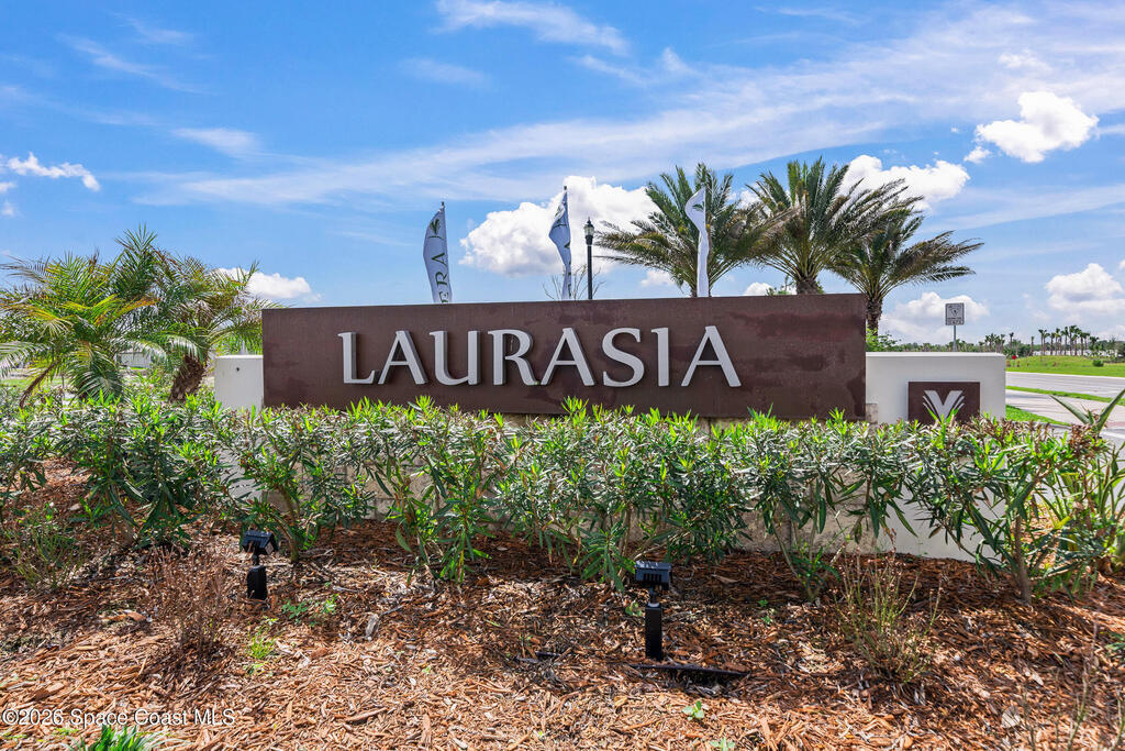 Why wait to build when you can own this stunning Tamber model in the gated community of Laurasia! Located in a highly sought-after, golf cart-friendly neighborhood just minutes from A-rated schools, this award-winning 4 bedroom, 3.5 bath home on a large corner lot, offers an exceptional open layout with an oversized bonus room & unrivaled living/entertaining space. Soaring 12-foot ceilings, wood beam accents & tile flooring create a bright, elegant ambiance throughout. A show-stopping custom entryway storage feature was just put in as an added feature! The dreamy kitchen features gas appliances, quartz countertops & premium finishes, seamlessly flowing into the main living areas. Natural light pours in through the expansive slider and impact windows. The primary suite offers both a soaking tub and luxury shower for relaxing. Step out back to your private oasis with a saltwater pool and fully equipped summer kitchen. Close to shopping, dining and endless entertainment!