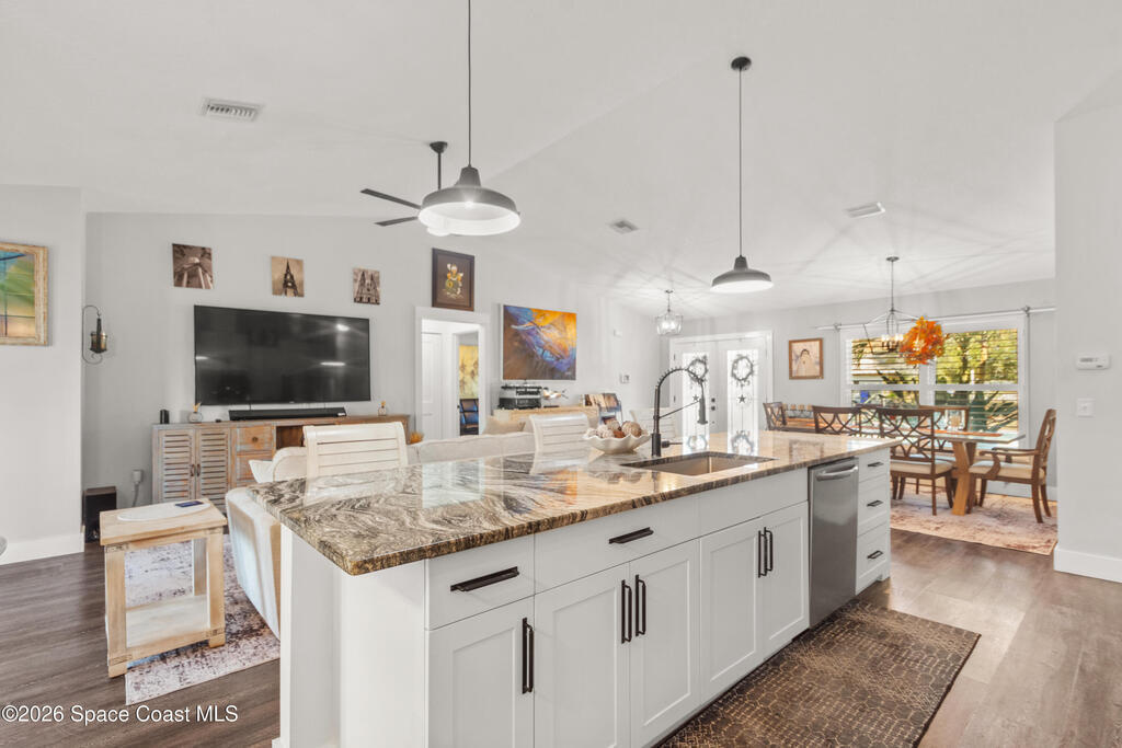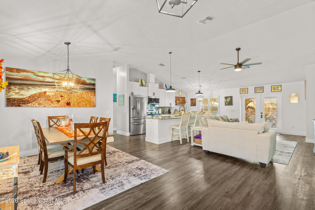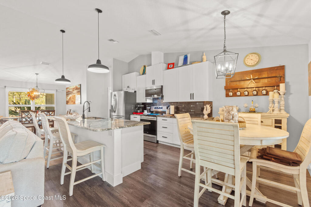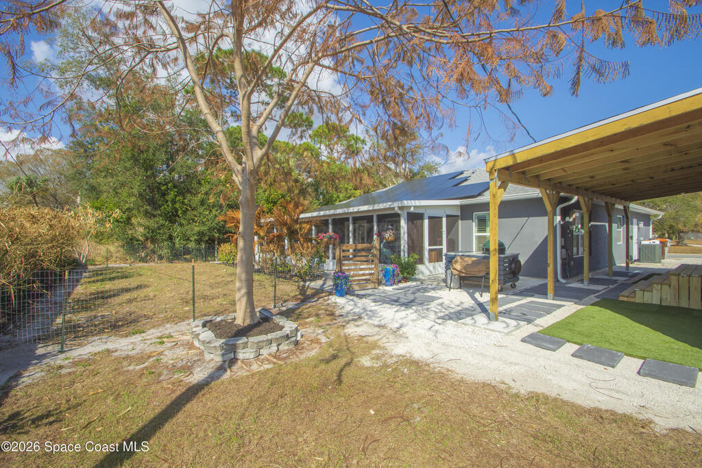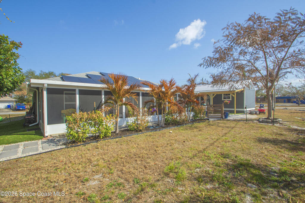 No HOA 2022 concrete block home featuring 3BR/2BA and 2082 SF under air. Open layout with vaulted ceilings, split bedrooms, island kitchen, granite counters, and stainless appliances. Induction Range, Exhaust fan, inside laundry, impact glass, and matching laminate throughout. Plantation Shutters 2-car garage and 40' x 10' screened patio. County water/sewer. Fence Backyard. Solar Panels, Huge 16' x 32' permitted rear In-law Suite/workshop with power and A/C-great for hobbies, storage, or flex space, plus attached 32' x 10' covered area. Next to Gravel parking for 6 cars/boat or RV. Community Pool.