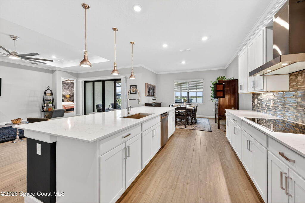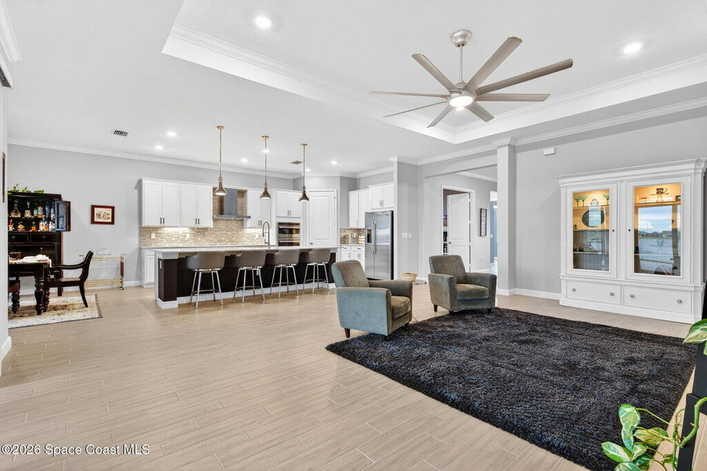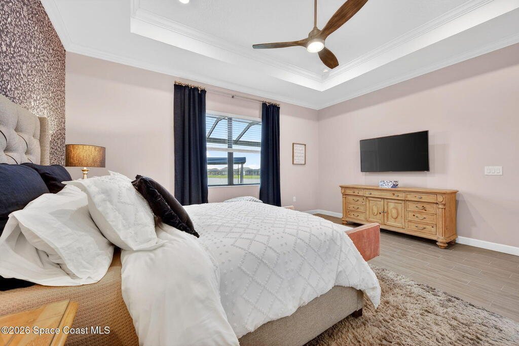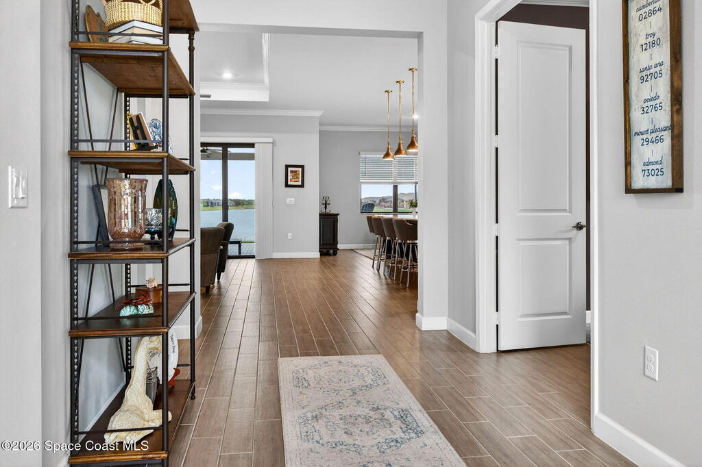 GREAT LAKE VIEW... This 3BR, PLUS FLEX RM (Could be a 4th BR, Guest room, or Office), 3 Full Bath, 3 Car Garage Home with LONG VIEW of the LAKE!!! New in 2022, and Still Looks That Nice, and Better Due to Highly Desired Updates and Upgrades Like the Stylish Full Length Extended Paver Lanai with A DESIRED PICTURE FRAME Rear Enclosure, Tile Plank Flooring Used Throughout Home, Centralized Living RM Area open to Kitchen, Primary Suite and bath with Walk-in Closets w/Professional Grade Organizers, Upgraded Illuminated Mirrors (Heat and Lighting Integrated), Gourmet Kit with Wall Oven, Flat Surface Cook Top, Statement Hood (vented outside), Quartz Counter Tops, Pendant Lighting, Impact Windows. Home has Great LAKE Views from Kitchen, Living Rm, Dining Area, Primary Suite, and Covered Porch!!! Truly a Discriminating Home to Consider!!! All Located with a Upscale Active and Gated 55+ Community Near Costco in Viera!!!