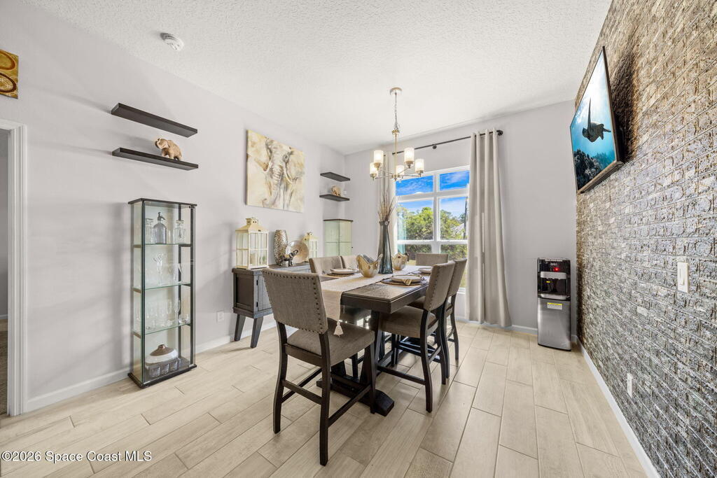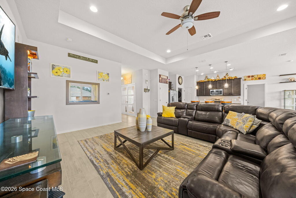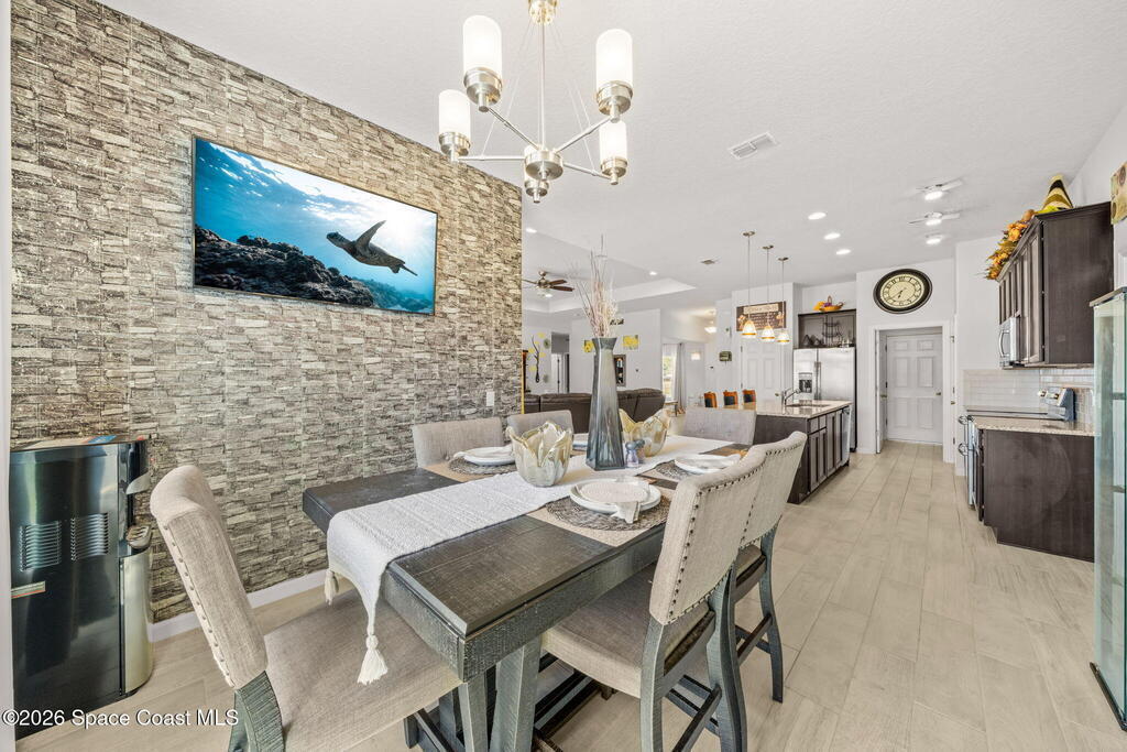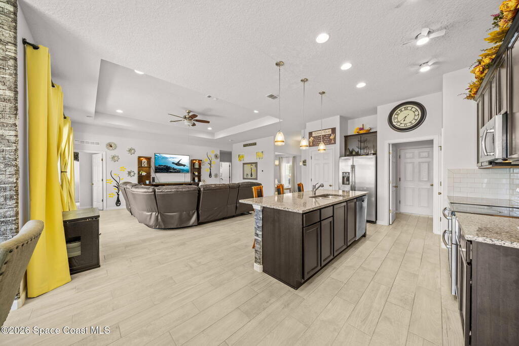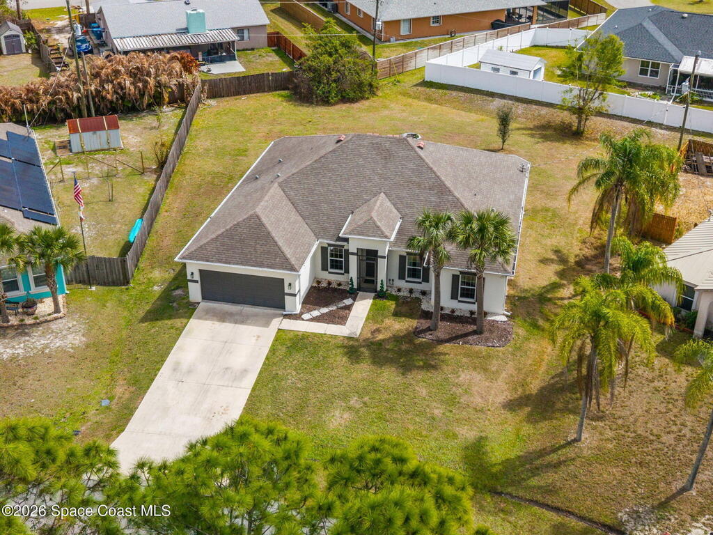 Built in 2019, this well-maintained concrete block home offers modern construction and a desirable location in SE Palm Bay, just minutes from the new Shops of Cypress Bay and everyday conveniences. Connected to city water, the home combines comfort, efficiency, and functionality.Inside, you'll find a bright open floor plan featuring 9'4'' ceilings, tiled living areas, and abundant natural light throughout the main living spaces. The kitchen is designed for both style and practicality, showcasing granite countertops, 42'' cabinets, stainless steel appliances, and a classic subway tile backsplash, all overlooking the main living and dining areas -- perfect for entertaining or everyday living.The spacious primary suite features double sinks, a separate water closet, and a large walk-in closet. A split-bedroom layout provides added privacy, with three additional bedrooms and a shared full bath located on the opposite side of the home.
