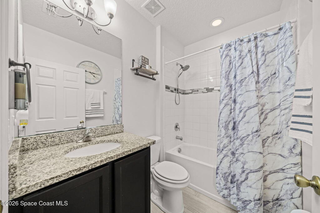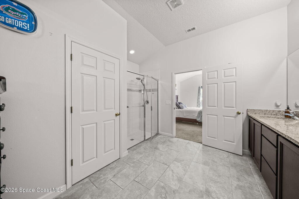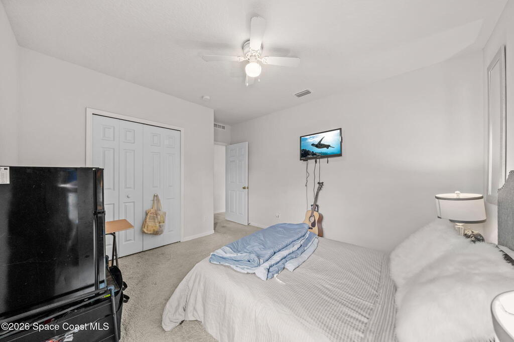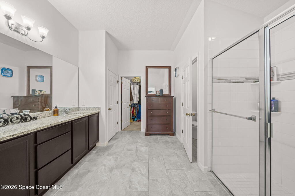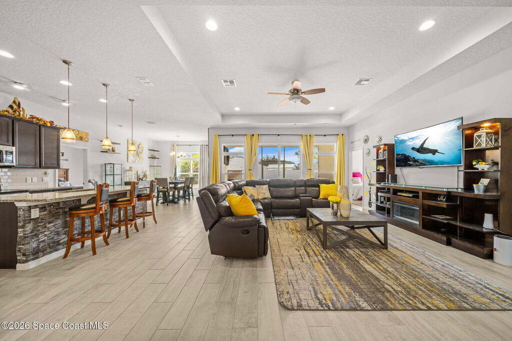 Built in 2019, this well-maintained concrete block home offers modern construction and a desirable location in SE Palm Bay, just minutes from the new Shops of Cypress Bay and everyday conveniences. Connected to city water, the home combines comfort, efficiency, and functionality.Inside, you'll find a bright open floor plan featuring 9'4'' ceilings, tiled living areas, and abundant natural light throughout the main living spaces. The kitchen is designed for both style and practicality, showcasing granite countertops, 42'' cabinets, stainless steel appliances, and a classic subway tile backsplash, all overlooking the main living and dining areas -- perfect for entertaining or everyday living.The spacious primary suite features double sinks, a separate water closet, and a large walk-in closet. A split-bedroom layout provides added privacy, with three additional bedrooms and a shared full bath located on the opposite side of the home.