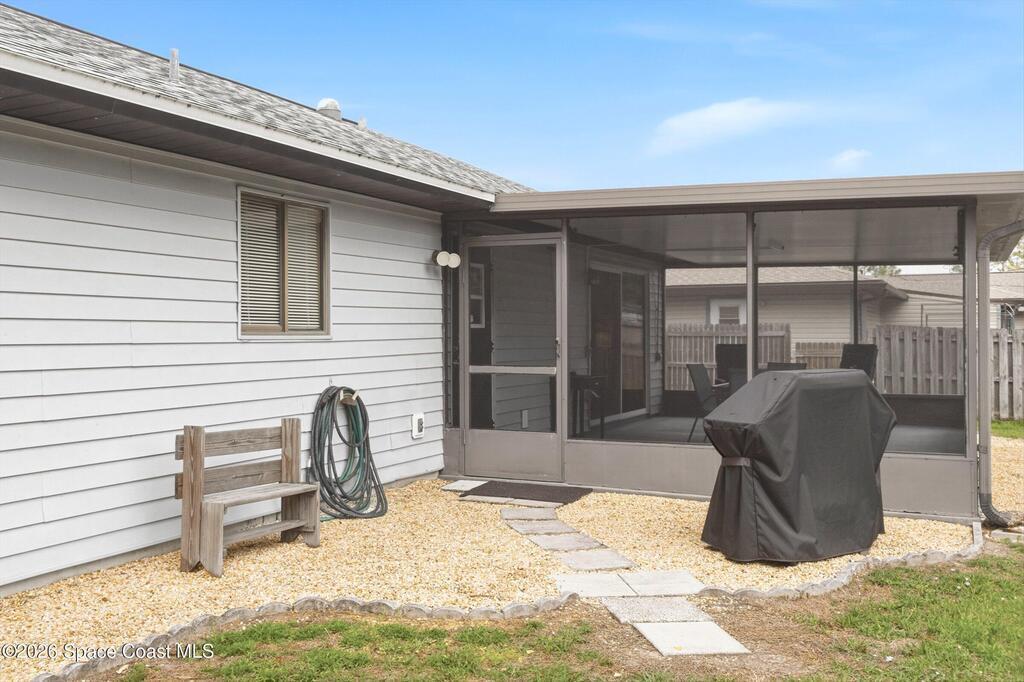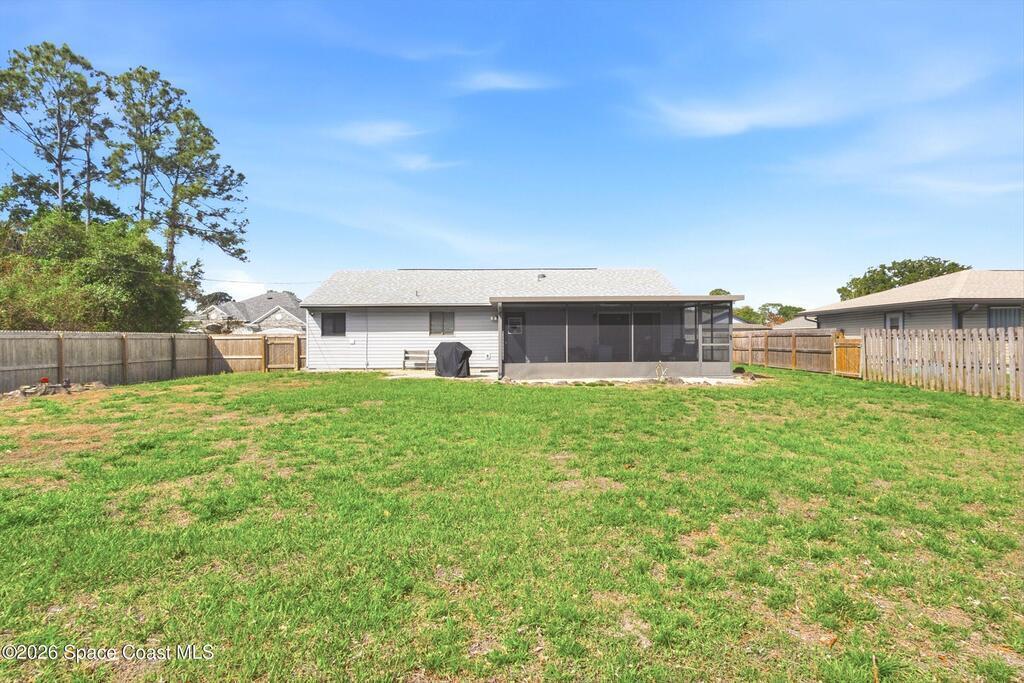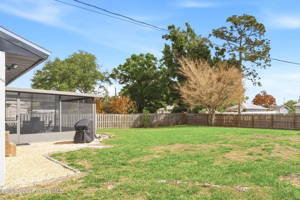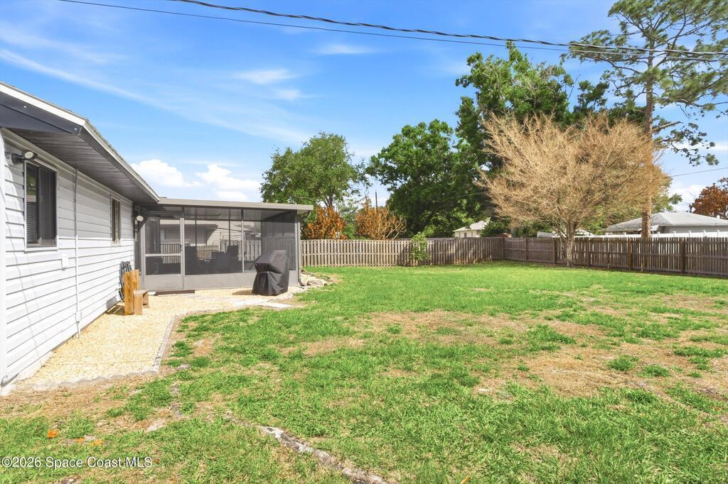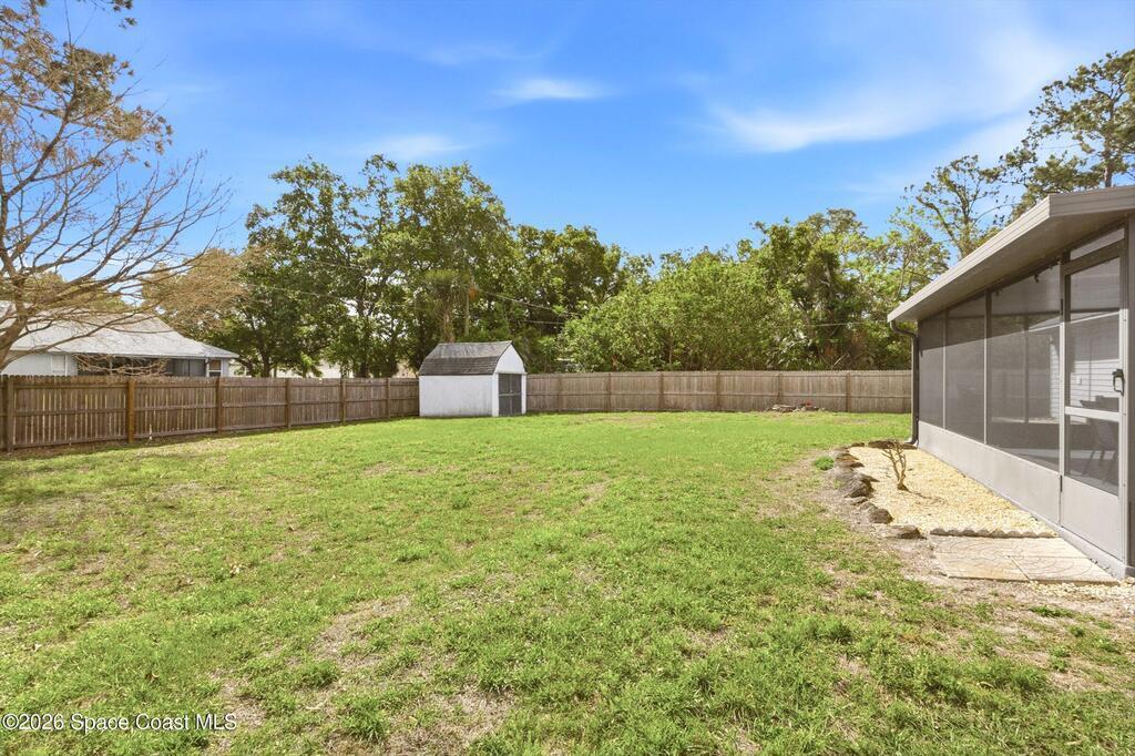 Charming 2 bedroom, 1 bathroom home with a bonus room on city water and a HUGE fully fenced backyard! This well-maintained property features a newer 2021 roof, NEW 2025 water heater, and recently pumped septic (2025) for added peace of mind. Inside, you'll find vinyl flooring, vaulted ceilings, stainless appliances, and a spacious layout including a walk-in shower and desirable his & hers closets. Step outside to enjoy the screened-in patio overlooking the backyard, complete with a shed for extra storage. Conveniently located just 20 minutes from the beach and close to all the shopping, dining, and amenities Palm Bay has to offer. Don't miss this opportunity!