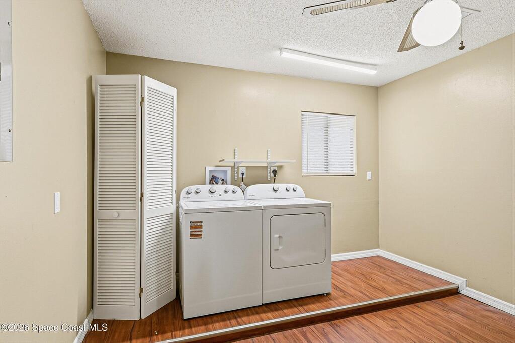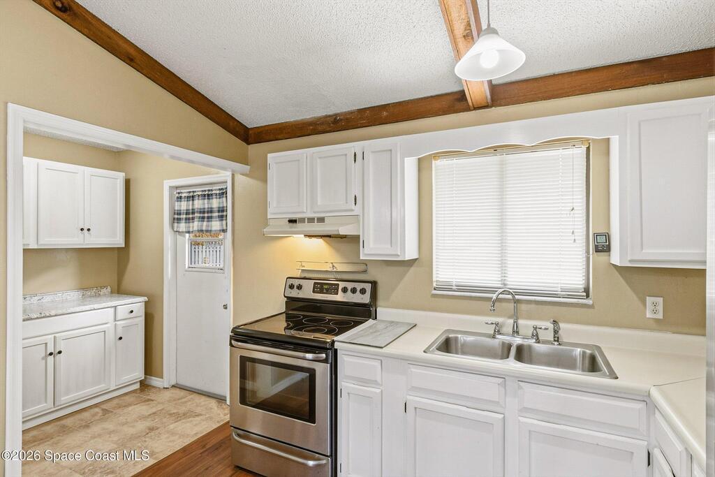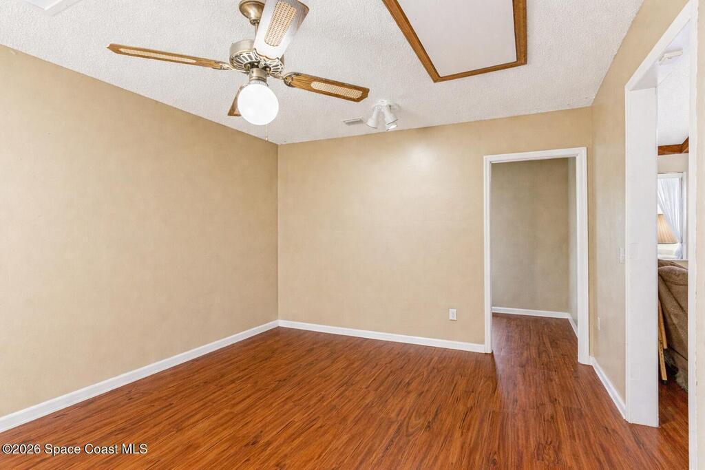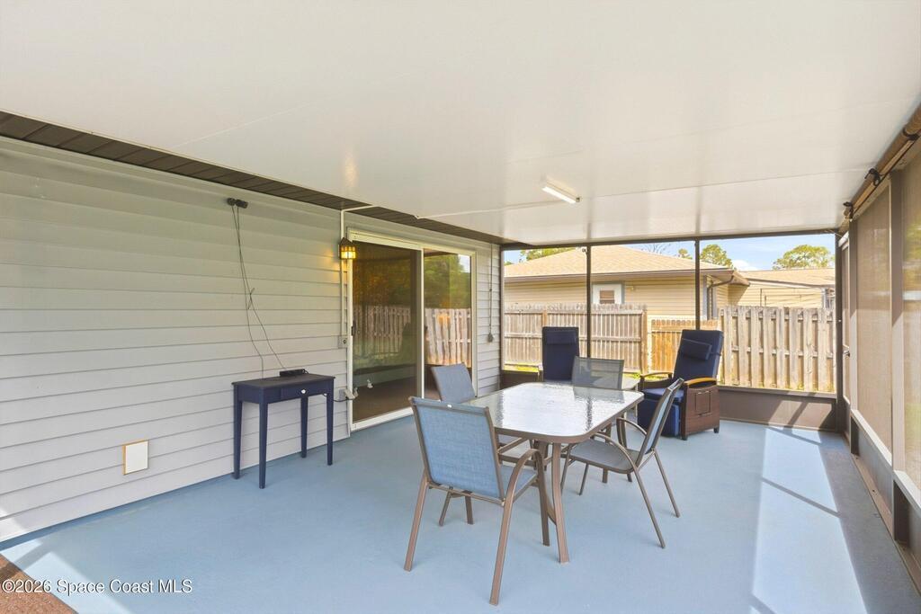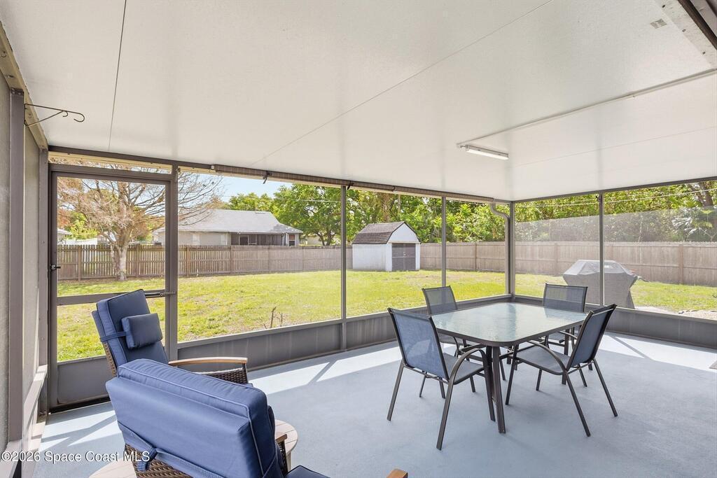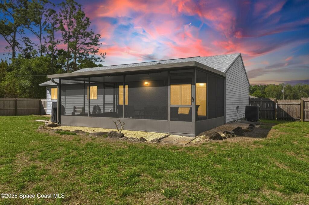 Charming 2 bedroom, 1 bathroom home with a bonus room on city water and a HUGE fully fenced backyard! This well-maintained property features a newer 2021 roof, NEW 2025 water heater, and recently pumped septic (2025) for added peace of mind. Inside, you'll find vinyl flooring, vaulted ceilings, stainless appliances, and a spacious layout including a walk-in shower and desirable his & hers closets. Step outside to enjoy the screened-in patio overlooking the backyard, complete with a shed for extra storage. Conveniently located just 20 minutes from the beach and close to all the shopping, dining, and amenities Palm Bay has to offer. Don't miss this opportunity!