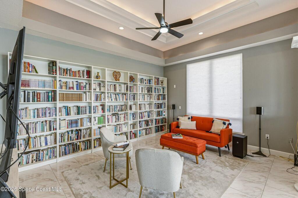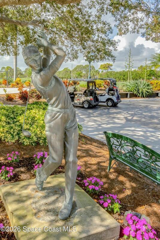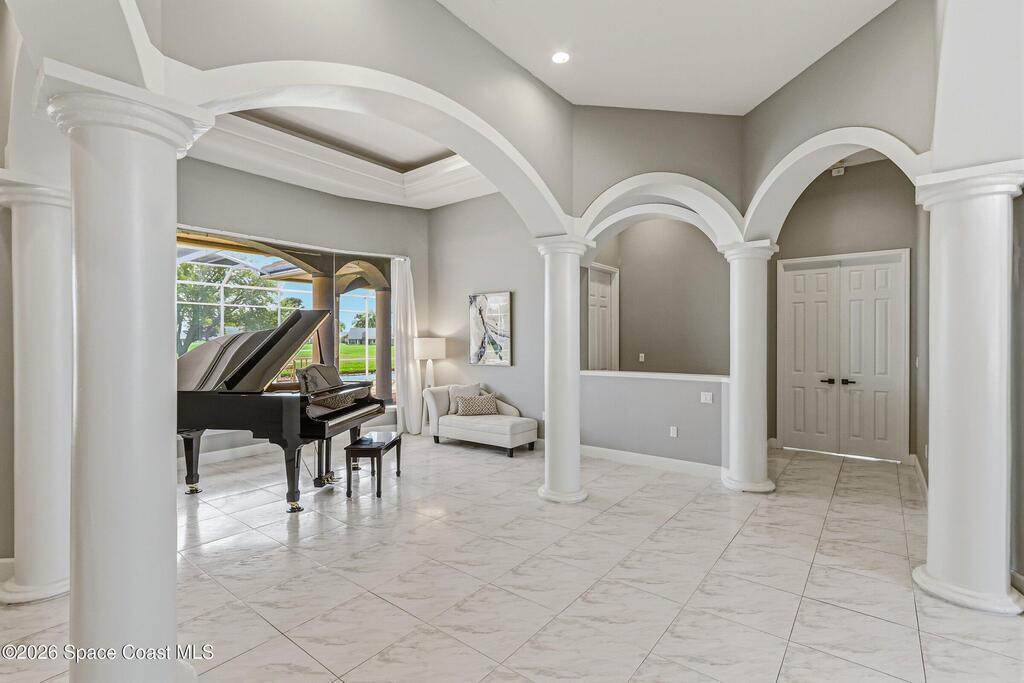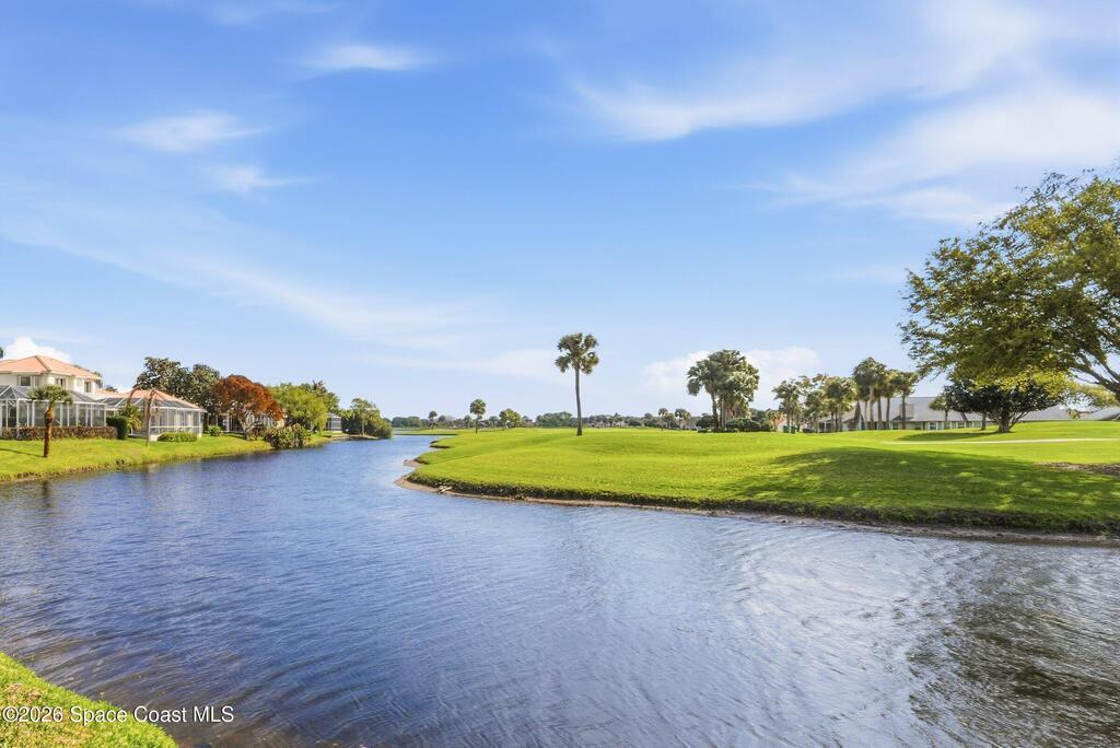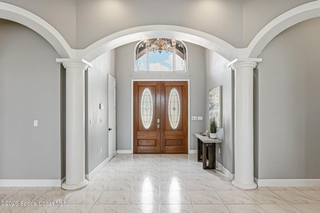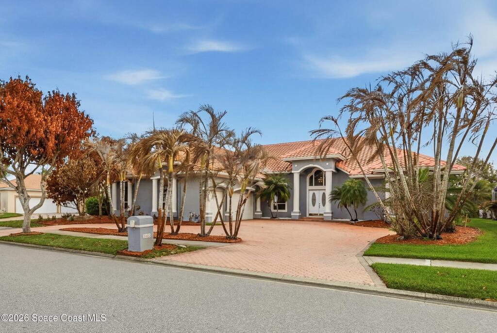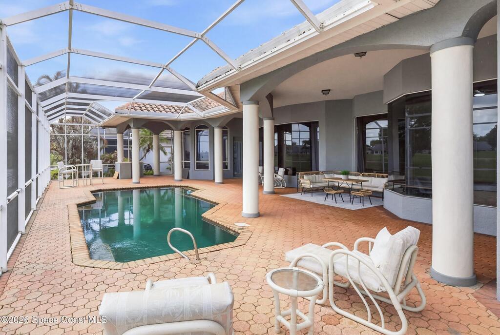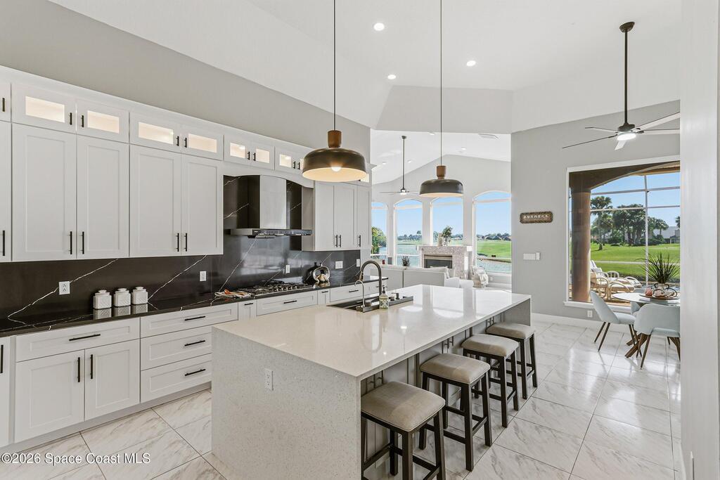 Discover an extraordinary lakefront estate in the Legends at Suntree. Offering 4,449sq ft of refined living space with sweeping golf course and lake views, this impressive 5 bedroom 3.5 bath residence blends grand scale with elegant design. Beginning with a dramatic 16' foyer and soaring 12-14' ceilings throughout accented by tray ceilings in the primary suite, living, family and dining rooms this home is designed for both sophisticated entertaining and everyday comfort. The home features a private library, media room and open living flow that captures stunning water and fairway vistas. The chef kitchen is beautifully appointed with quartz countertops a striking waterfall island and GE Cafe appliances. The luxurious primary suite offers a slipper tub, oversized walk-in shower and expansive his and hers closets. Outdoors a resort style pool and screened lanai overlook the tranquil lake and golf course scenery, completing this exceptional three-car garage estate. Renovations done in 2024