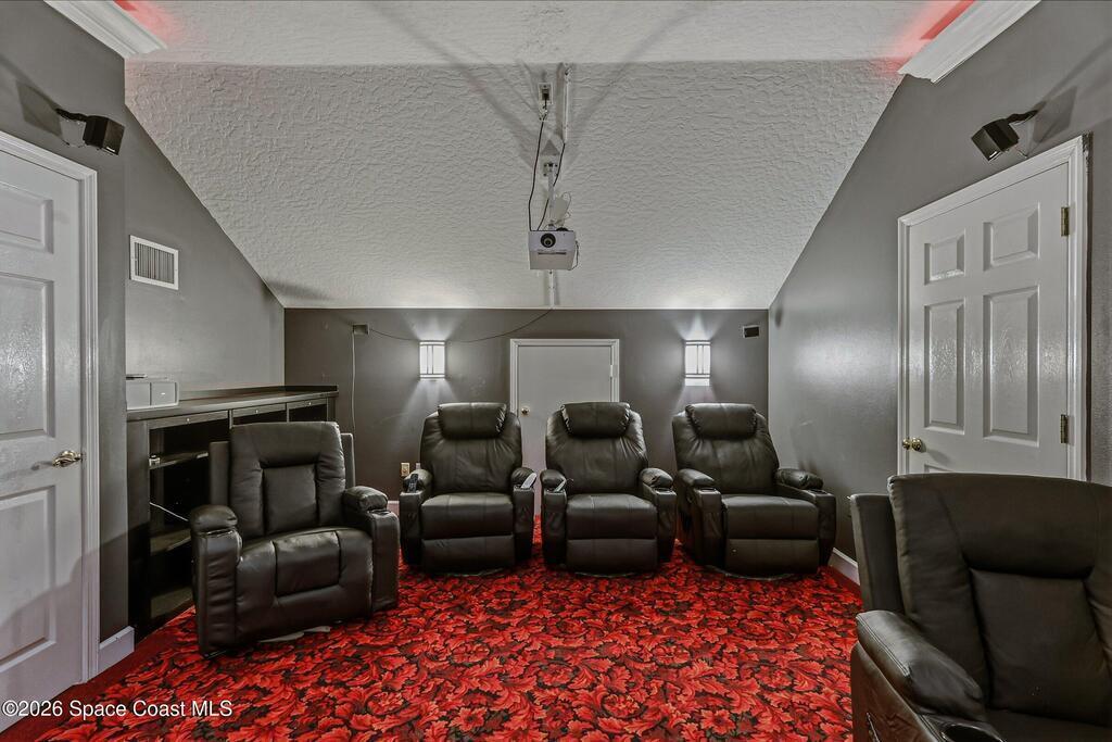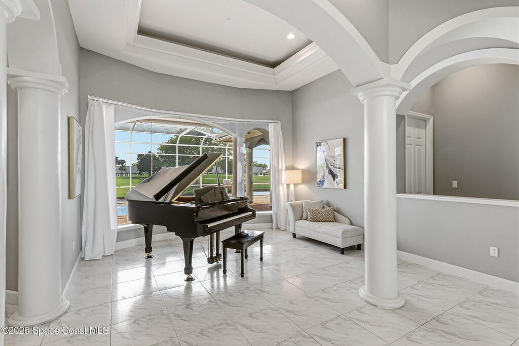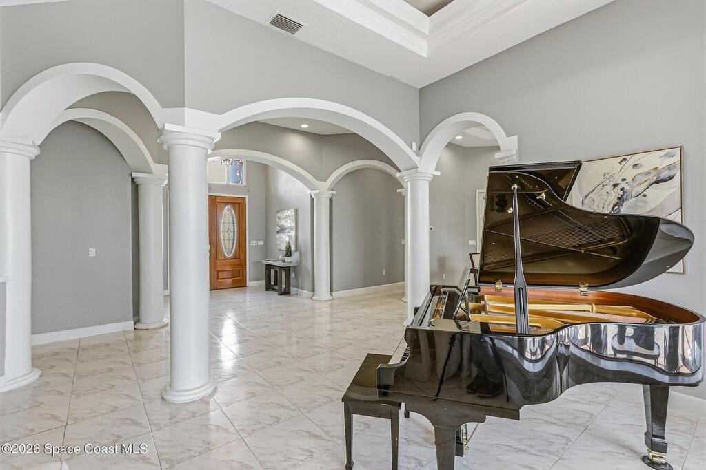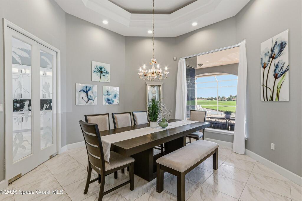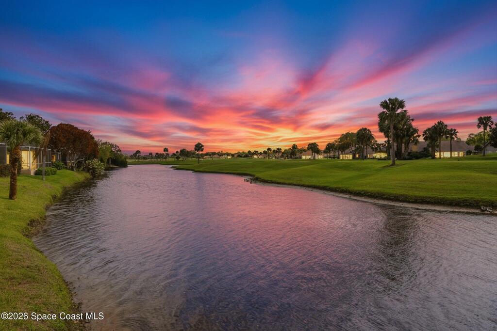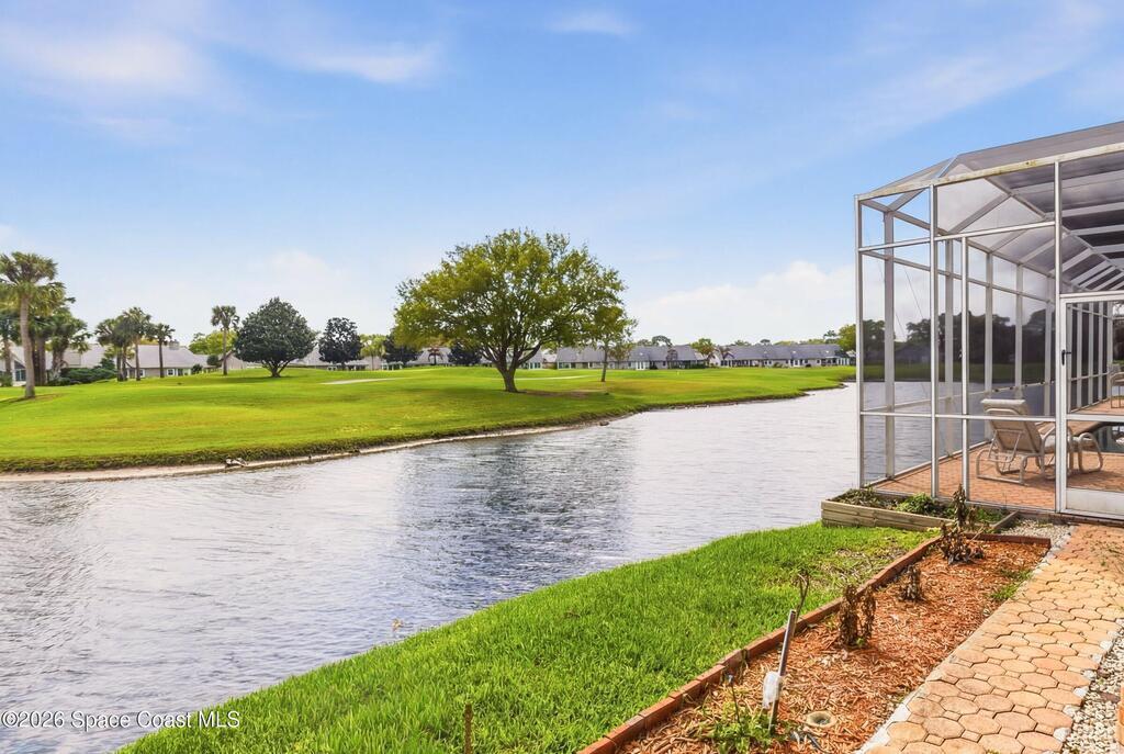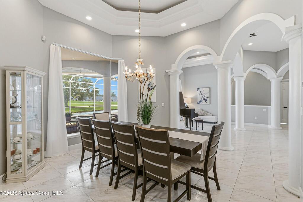 Discover an extraordinary lakefront estate in the Legends at Suntree. Offering 4,449sq ft of refined living space with sweeping golf course and lake views, this impressive 5 bedroom 3.5 bath residence blends grand scale with elegant design. Beginning with a dramatic 16' foyer and soaring 12-14' ceilings throughout accented by tray ceilings in the primary suite, living, family and dining rooms this home is designed for both sophisticated entertaining and everyday comfort. The home features a private library, media room and open living flow that captures stunning water and fairway vistas. The chef kitchen is beautifully appointed with quartz countertops a striking waterfall island and GE Cafe appliances. The luxurious primary suite offers a slipper tub, oversized walk-in shower and expansive his and hers closets. Outdoors a resort style pool and screened lanai overlook the tranquil lake and golf course scenery, completing this exceptional three-car garage estate. Renovations done in 2024