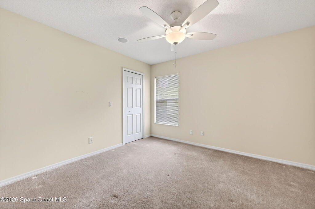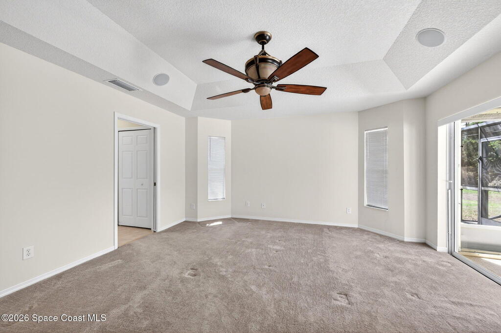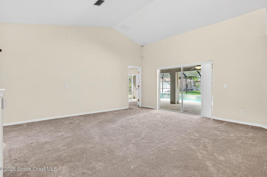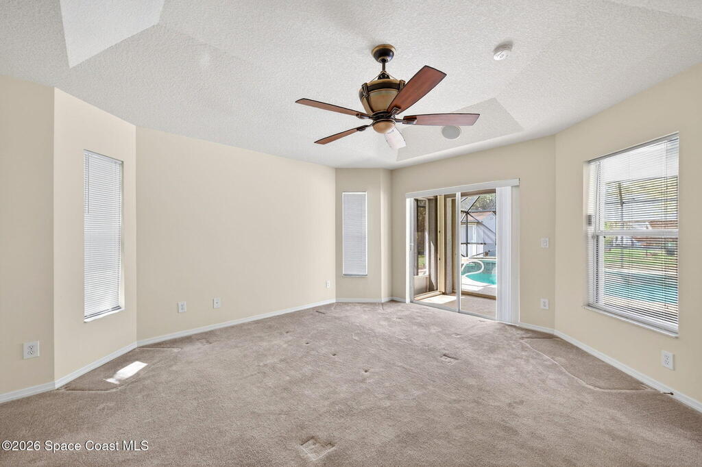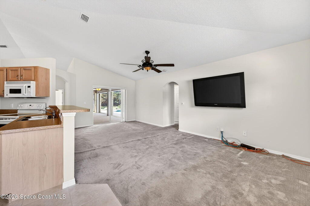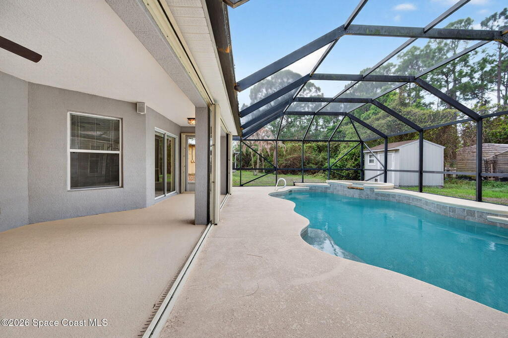 This 3 bedroom, 2 bath home features a desirable split floor plan & is located on a cul-de-sac. Designed with functionality & entertaining in mind, the home offers a dining area & two separate living spaces. All bedrooms include walk-in closets for ample storage. Numerous windows throughout the home bring in abundant natural light. Recent updates include a 2023 roof, 2024 exterior paint, full gutters installed in 2023 & a 2018 A/C. Additional features include a water softener system, washer & dryer, and a TV connected to speakers throughout the home.Enjoy outdoor living with a screened-in heated pool and spa, perfect for relaxing or entertaining. The garage door also includes a screen enclosure for added flexibility, and a backyard shed provides additional storage space. Conveniently positioned close to shopping, dining, parks, and schools, this home offers easy access to everyday essentials while maintaining a quiet cul-de-sac setting.